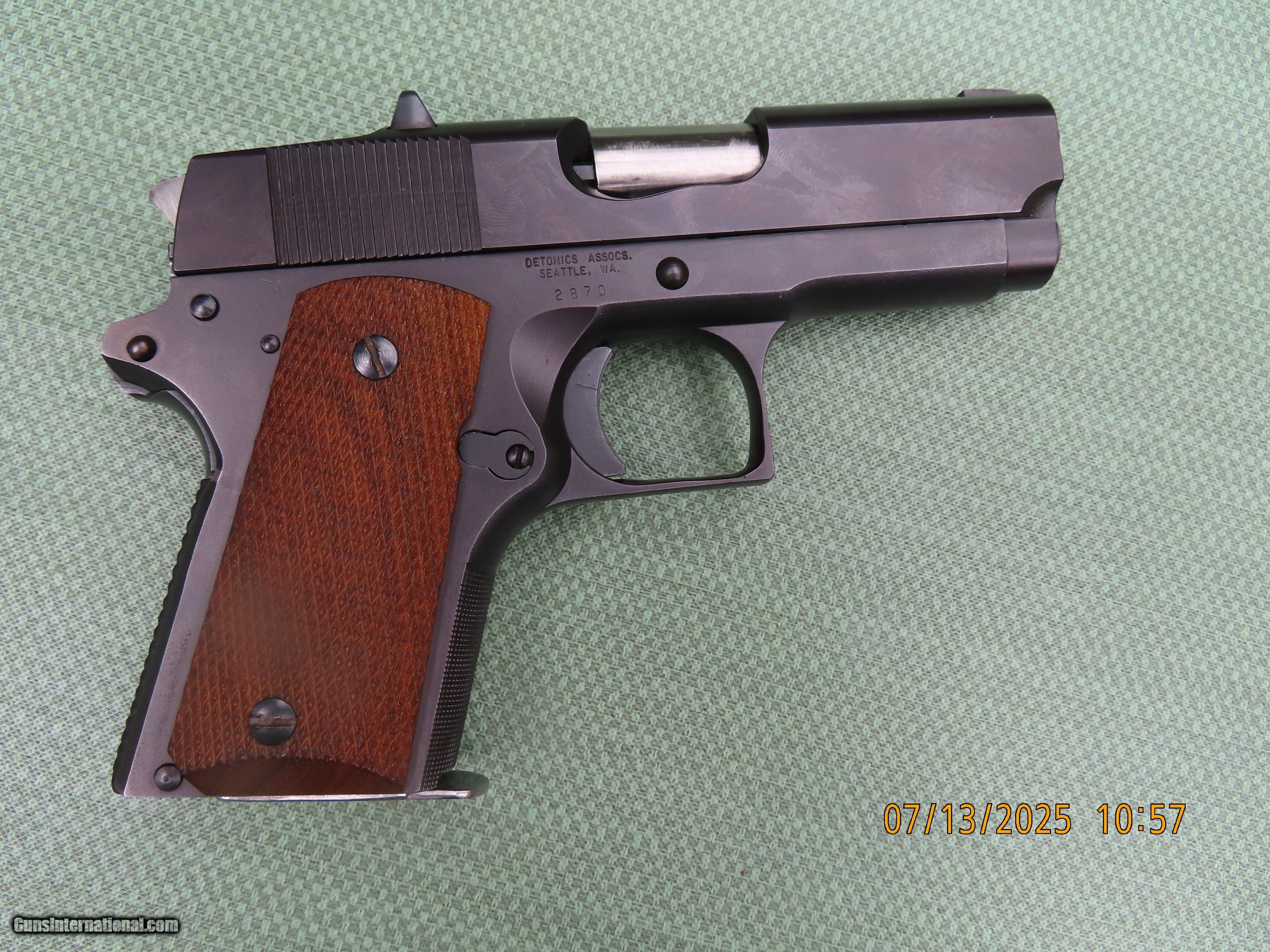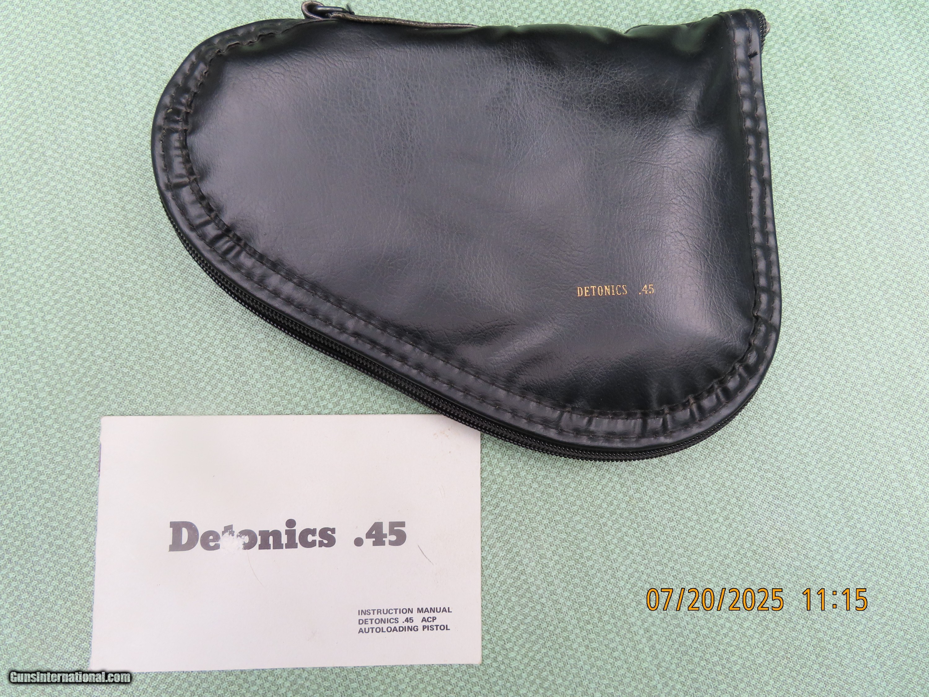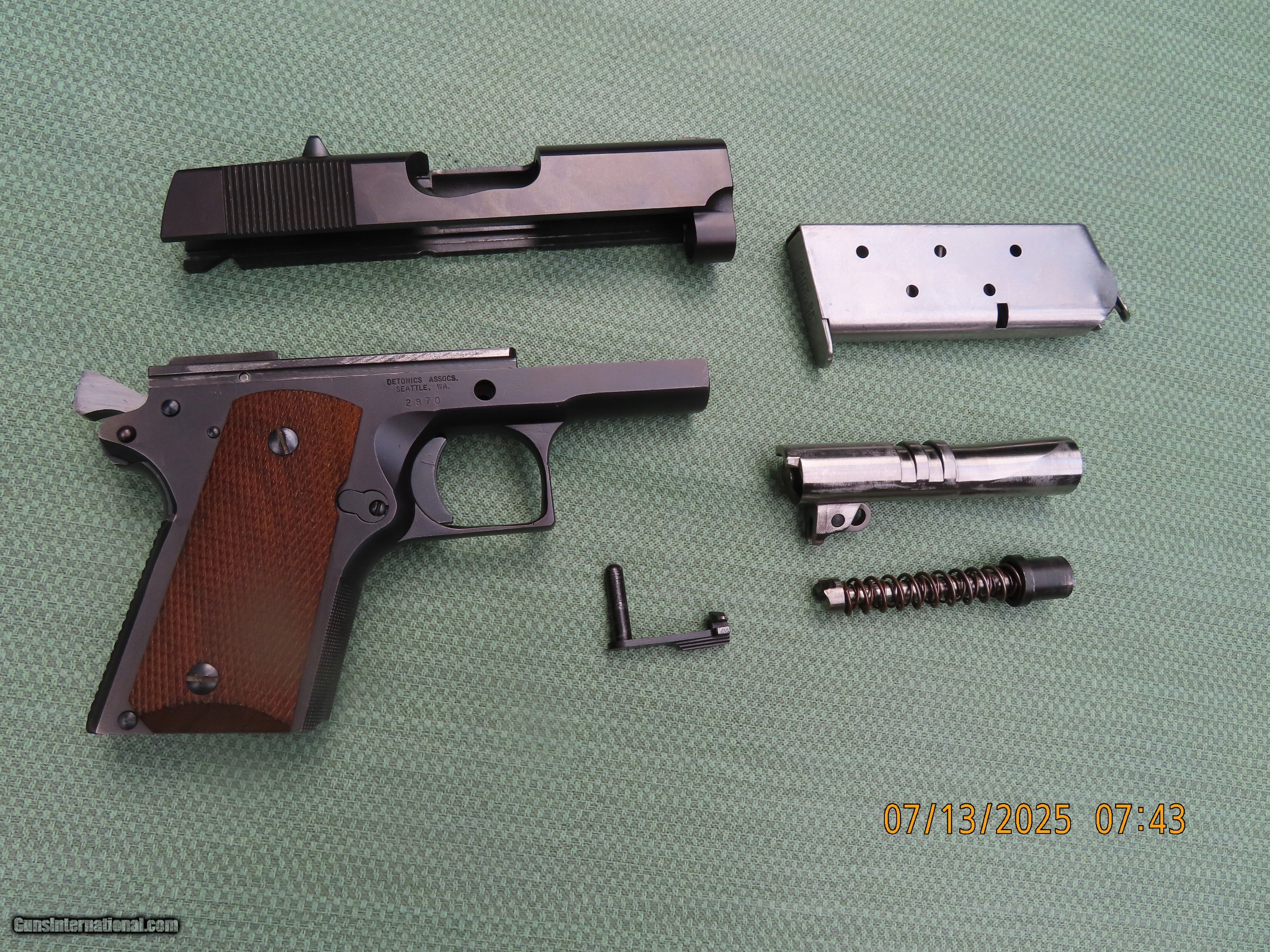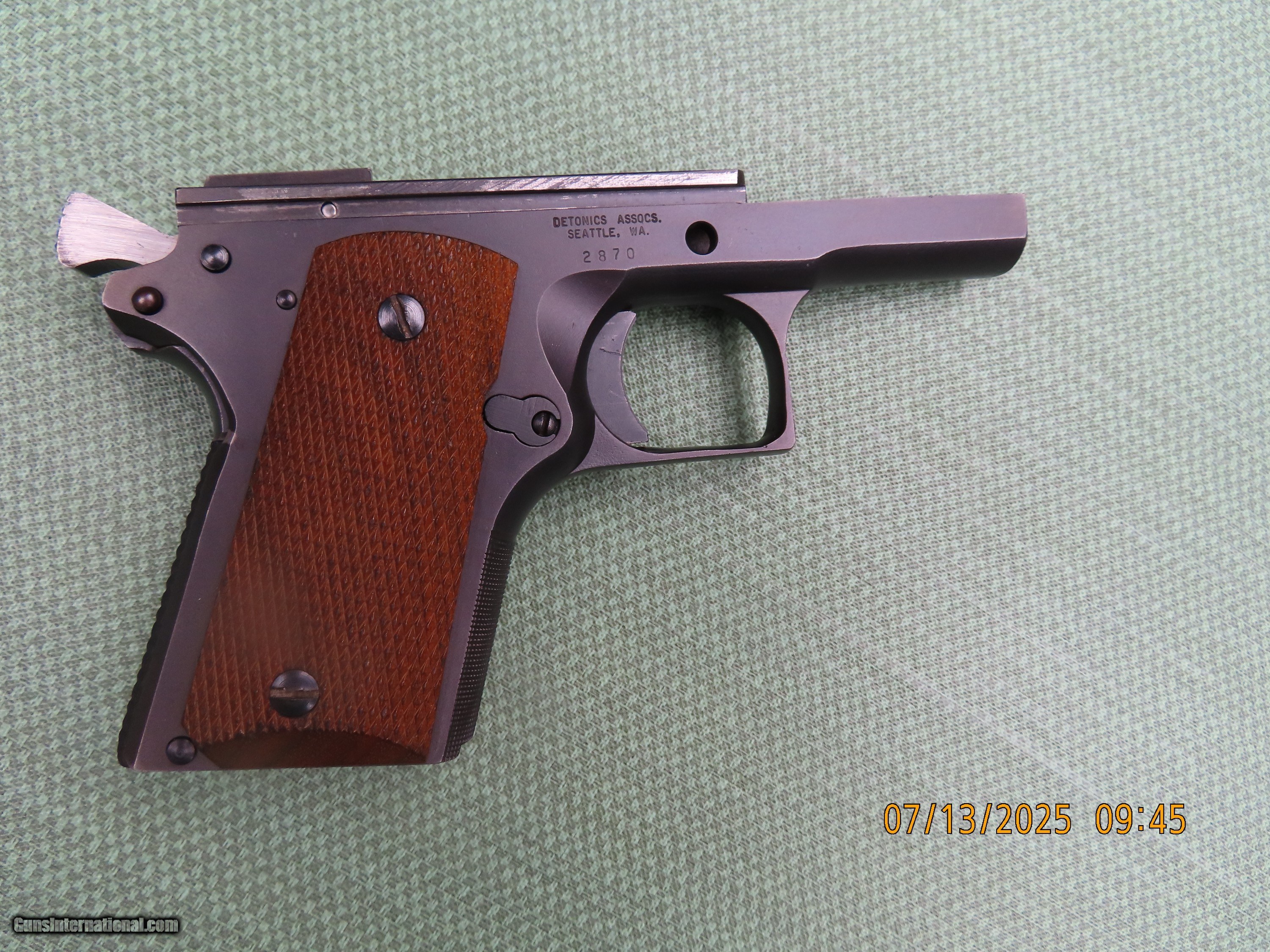 Description: The Detonics Combat Master is well known as the first reliable compact .45 ACP pistol that was smaller than the Colt Commander. I am not an expert on these firearms, but this example is what may be a 1st year production MkI. Serial numbers and production years are very sketchy on this. The serial range of production guns started at serial number 2000. As Detonics collectors know the early production Combat Masters were customized from secondary supplier sources such as Essex and Caspian. The markings on the pistol are as follows (See pictures): Left side of slide: DETONICS .45 Right side of slide is blank Left side of frame is blank Right side of frame: DETONICS ASSOCS. SEATLE, WA. Serial Number: 2870 Under right grip panel the number “40” in a circle Barrel is unmarked There does not appear to be any markings on the inside of the frame or inside of the slide. Please note knurled squared trigger guard. This appears to be somewhat unique as I have only seen one other example. However, I have seen a number of different features on the early production pistols. Enough to make me think that perhaps factory production workers were given some leeway in the features that were incorporated on these early pistols. The finish on this gun appears to be identical to images of other similarly serial numbered guns on the internet and or sites. I estimate the finish at 95% plus. The bore is very clear and bright. The 6 round magazine appears to be original factory. The original factory case and manual are included. I try to give a fair representation of the items or firearm for sale. If you have any questions please contact me either by email, or cell phone. I don’t consider my cell phone as another appendage to my body. So if I don’t answer please leave a voice mail. Items and firearms are sold “as is”. However, if there is a material error in the pictures or description I will refund the purchase price less the shipping cost. Again, please read the description and look closely at the pictures. The buyer is responsible for return shipping cost, and the return of the item, or firearm in the same condition as sent. Check your local and state firearms laws with your FFL before you bid/contact me. Shipping from my FFL to your FFL is $40.00. Payment is to be made with a USPS money order or personal check with condition that the check clears my bank before I ship. Reasonable offers will be considered. SOLD Handgun Caliber: .45 ACP (.45 Auto) |