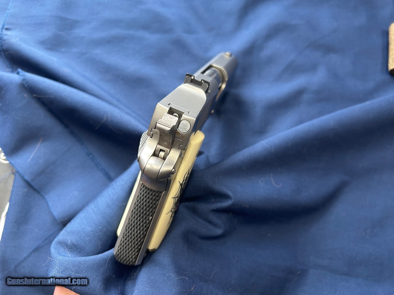 Description: If You're a Veteran, Active Duty Military or Service Member's Family - Thank You! ITEM DESCRIPTION: Up for sale is a Detonics Mark VI Combat Master pistol chambered for the .45 ACP cartridge. This is a Seattle pistol with the less-common "Professional Model" marking on the right side of the slide. This firearm has seen very little use. Features include faux ivory Black Widow grips in excellent condition (original grips not included), 2 factory Detonics 6-round stainless magazines, and a complimentary gun rug. The finish is bright stainless on the sides of the slide and a matte finish on the other surfaces. Please note that an extended slide release has been added to this pistol (original slide release is not included). Any questions? Just ask! Please note that all of my items are subject to sale elsewhere if no bids have been placed, so if you are interested in this pistol you should buy it now to prevent it from being sold and removed from Guns International. Shipping & Other Details: Flat fee of $35 for shipping to the lower 48 states via economy ground services. Expedited shipping and insurance available at cost. Please ask any questions you may have before and I would be glad to answer them. Gale River Traders has been selling for more than 20 years onliner with a stellar satisfaction rating, sowith confidence! SOLD Handgun Caliber: .45 ACP (.45 Auto) Manufacturer: Detonics Model: Combat Master |