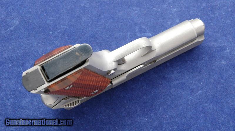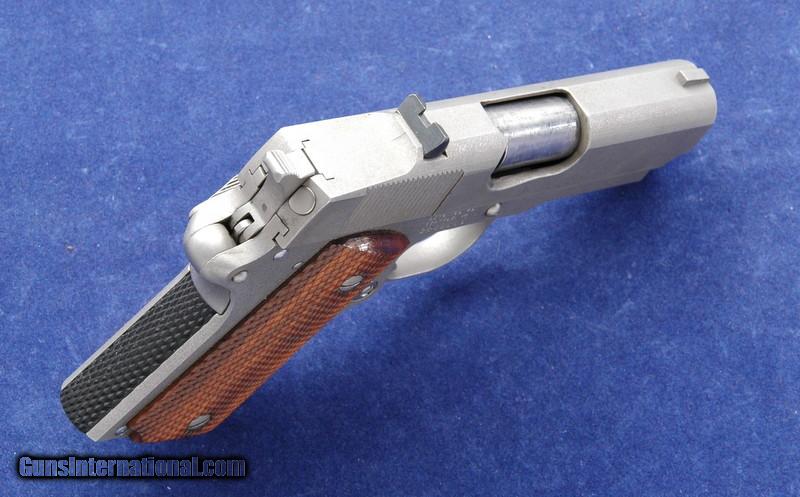 Description: Detonics Combat Master, matt stainless steel, chambered in .45 ACP caliber pistol. It is a subcompact 1911 features include a 3-1/2” bushing less barrel, full length guide rod, checkered rubber main spring housing and checkered wood grips. This 45 model was manufactured in Seattle, Washington and is in very good condition. SOLD |