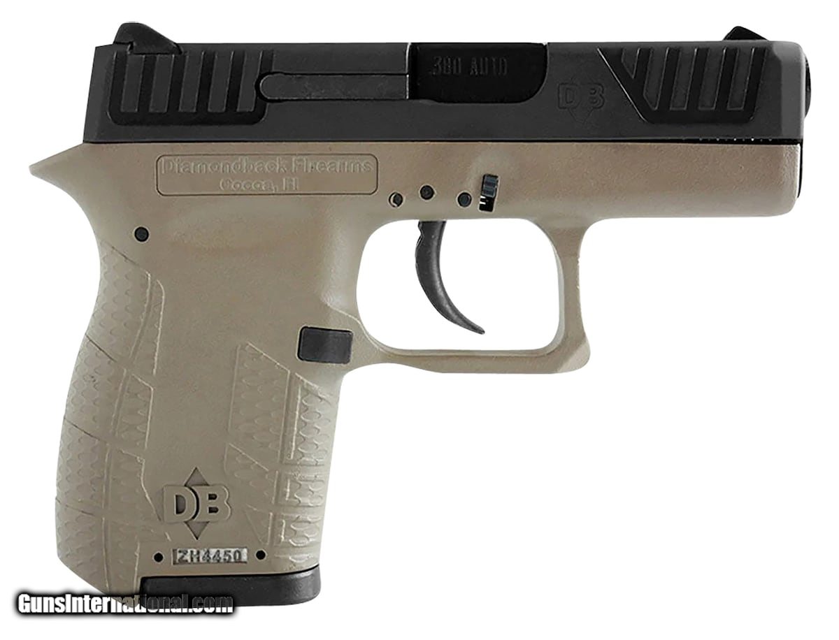 Description: Guns Listing ID: 551399 Diamondback‚‚s DB380 lightweight micro-compact pistol made entirely in the USA. Designed with safety in mind, the DB380 features a \"ZERO-Energy\" striker firing system with a mechanical firing pin block. It also has a steel magazine catch and real windage-adjustable sights. The steel trigger with dual connecting bars allows for a crisp smooth, trigger pull, while the FEA (Finite Element Analysis) designed slide and barrel is stronger than any comparable firearm. The slide, barrel, and internal parts features a corrosion resistant coating, making this pistol a lifetime investment. This model has a 2\" barrel and a FDE frame with black slide SOLD Manufacturer: DIAMONDBACK Model: DB380 G4 Caliber Info: .380 ACP Condition: new Barrels: 2 BARREL Finish: FDE |