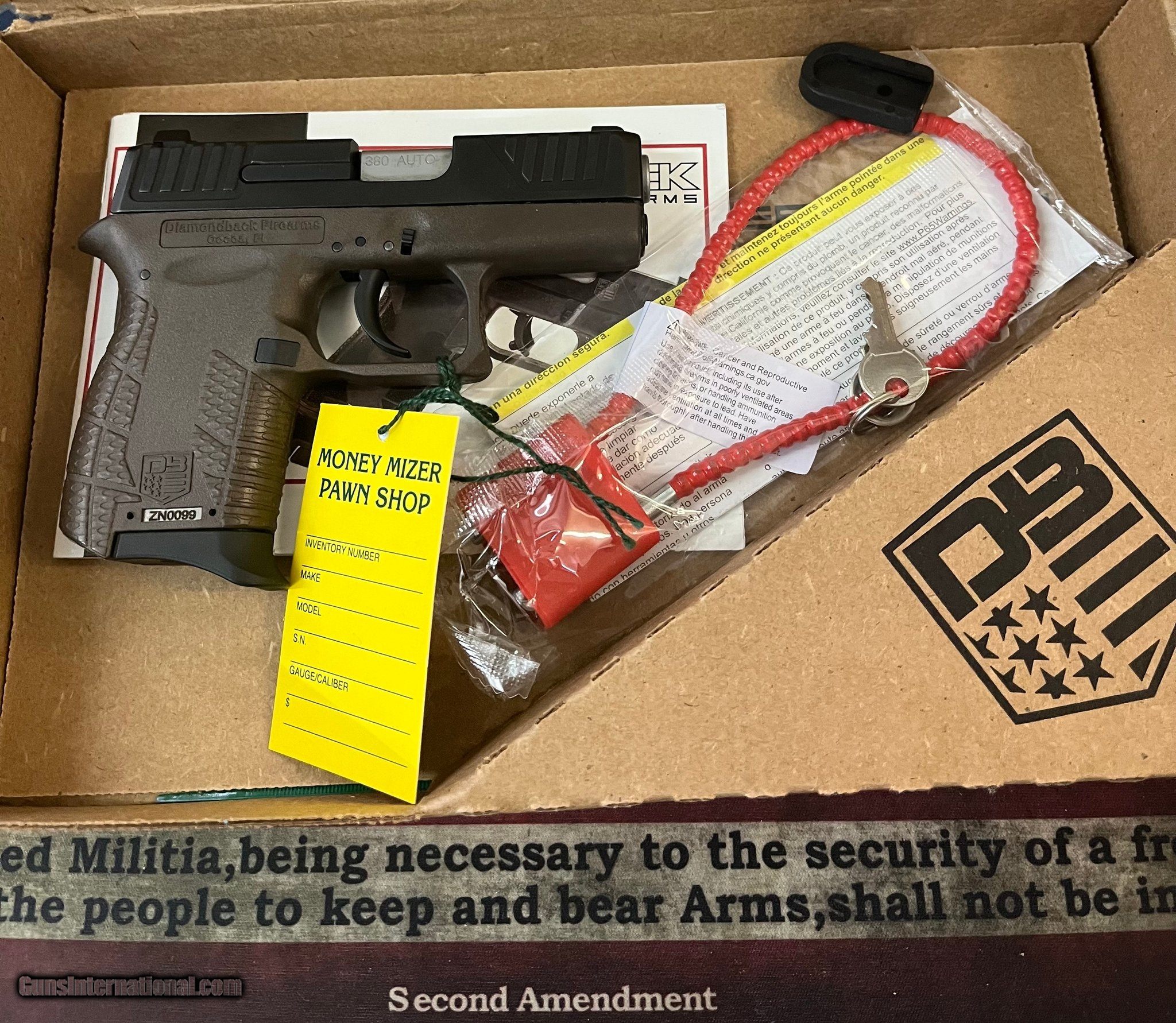Description: Guns Listing ID: 493886 IN ORIGINAL BOX WITH ONE MAGAZINE SOLD Manufacturer: DIAMONDBACK Model: DB380 GEN 4 Caliber Info: .380 ACP Condition: Used - Non-Certified Barrels: 2.8 BARREL Action: DOUBLE ACTION Finish: MIDNIGHT BRONZE Weight: 0.5 lbs. |