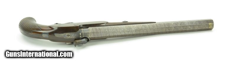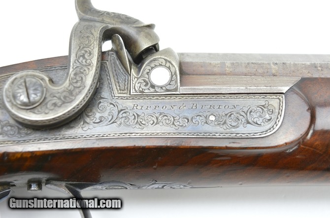 Description: Beautiful Cased Set of Rippon and Burton Duelers. Excellent all original guns with wonderful original brown striped barrels, beautiful case colored locks and excellent blue on the trigger guards. Guns look unfired. Wells Street and Oxford Street, London. Barrels measure 10 ¾” and the overall length is 16”. Both pistols are in excellent original condition with original blued trigger guards. Stocks show only minor nicks (one hammer has a repair). Very fine set of duelers. SOLD Antique: Yes |