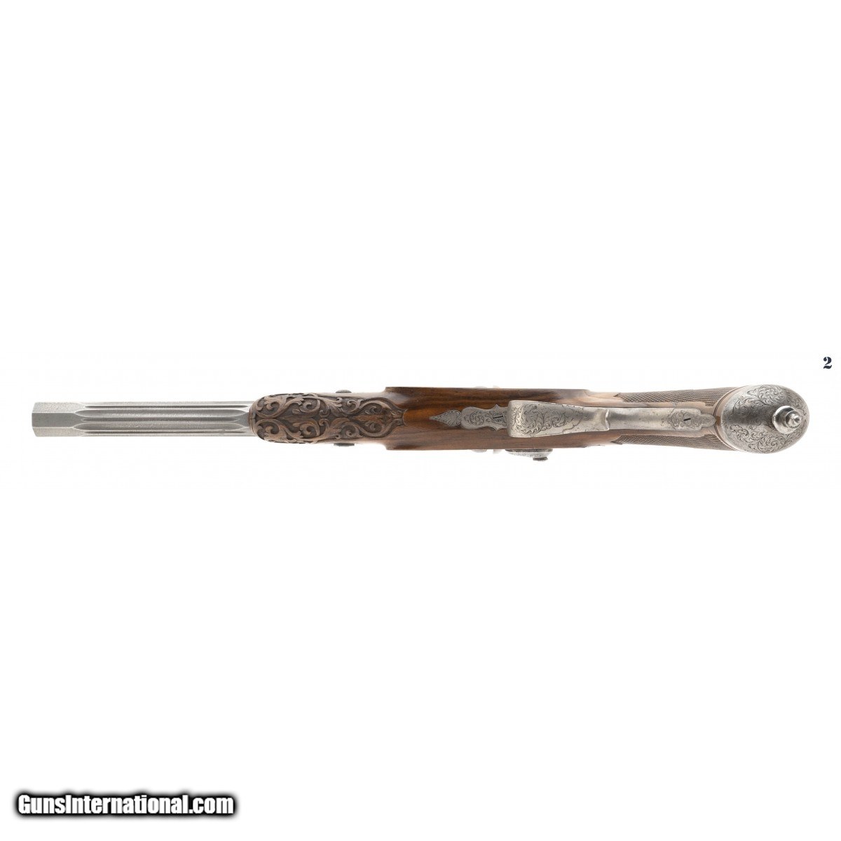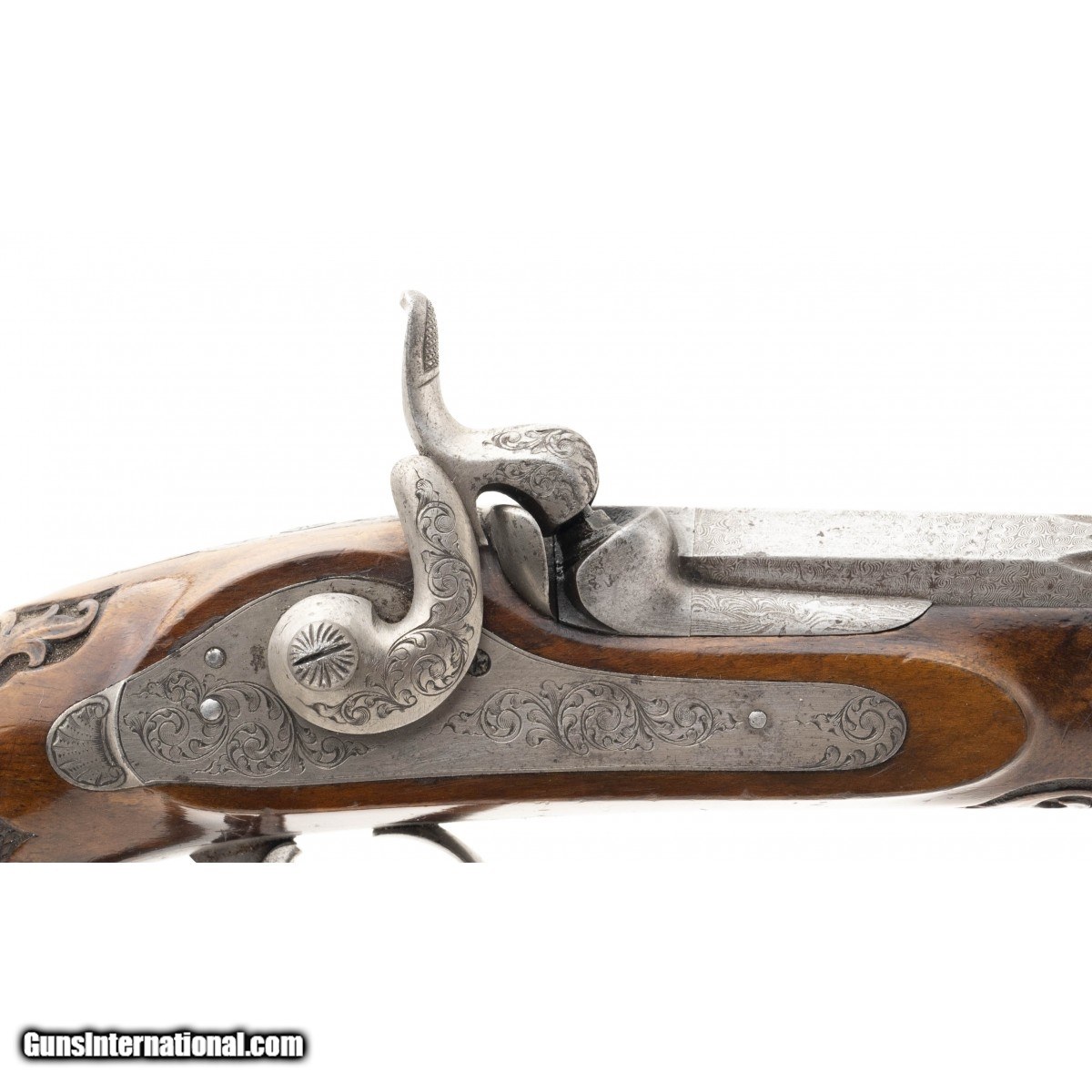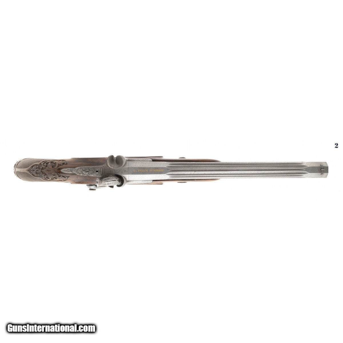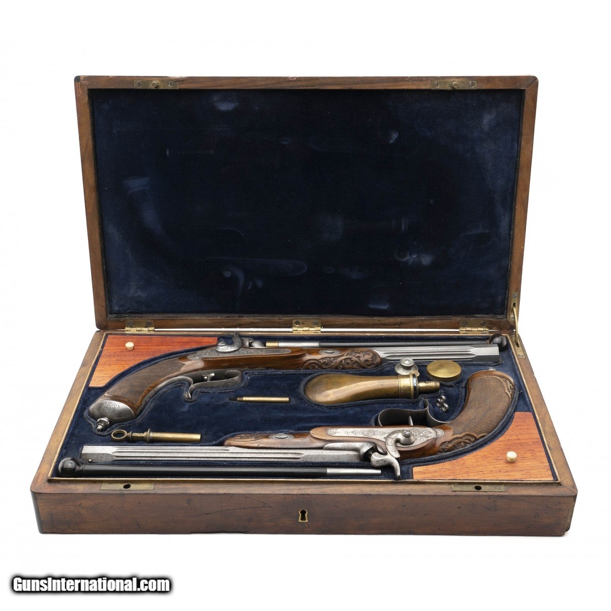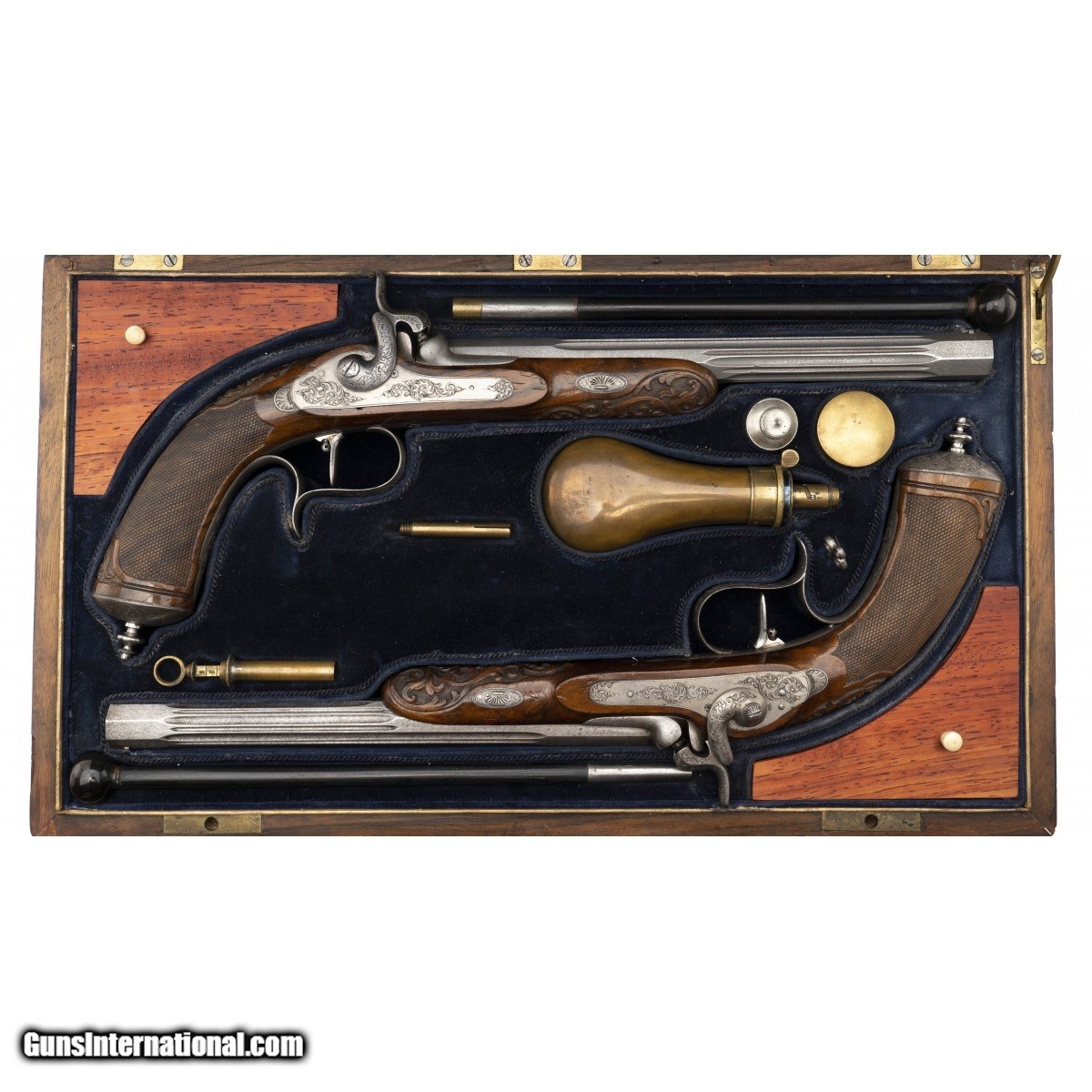 Description: "Antique dueling pistols. ""G. Noack in Berlin."" is marked in gold on top of the barrel flat. Barrels are rifled and fluted and have an intricate Damascus pattern. The barrels are 10"" with an overall length of 15.5"". Pistols have adjustable set triggers. The pistol stocks have beautiful relief carving of floral motif. The stocks have approximately 98% of original lacquer with some light handling marks. The actions work perfectly. The case is mahogany with ebony trim on the lid and corners. Interior is blue velvet. Accessories include an ebony ramrod, cap can, oiler, powder measure, cleaning rod with extension being slotted for a cloth patch. The case key is included and the powder flask is from James Dixon & Sons. This is an elegant pair of pistols with all metal parts engraved En Suite. Overall fine condition. SOLD Antique: Yes |