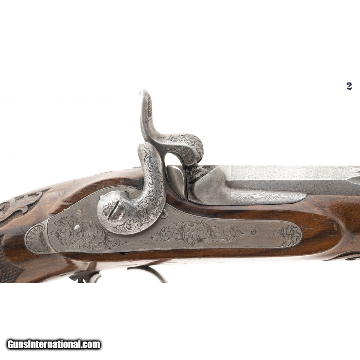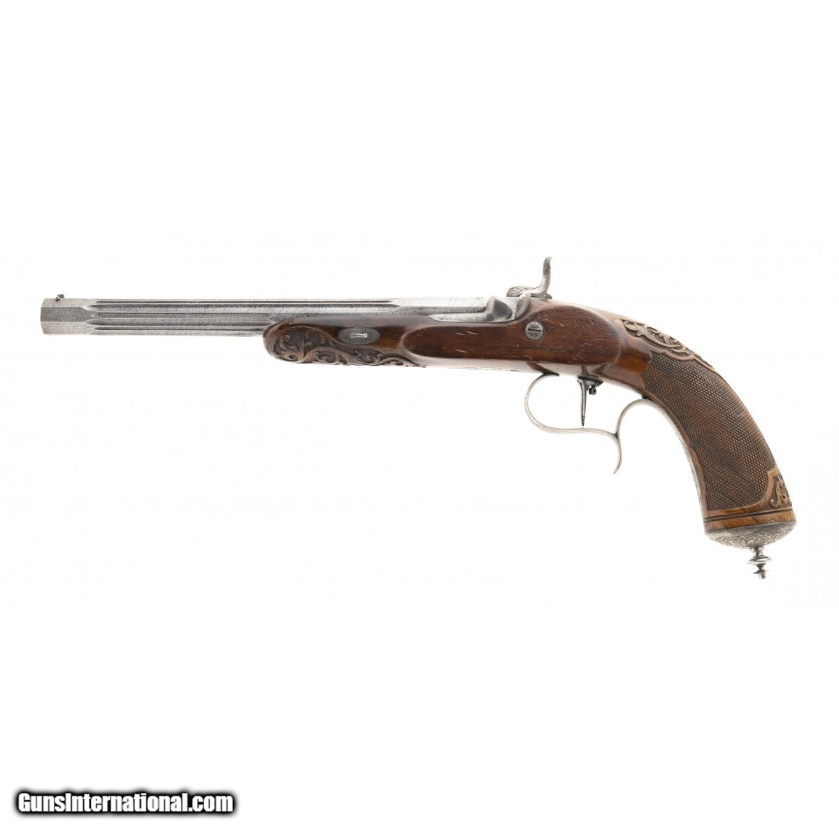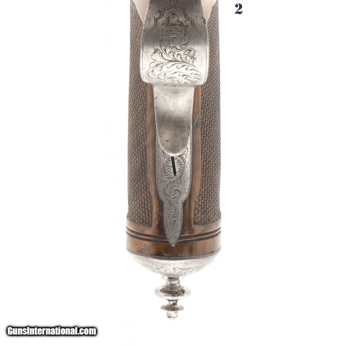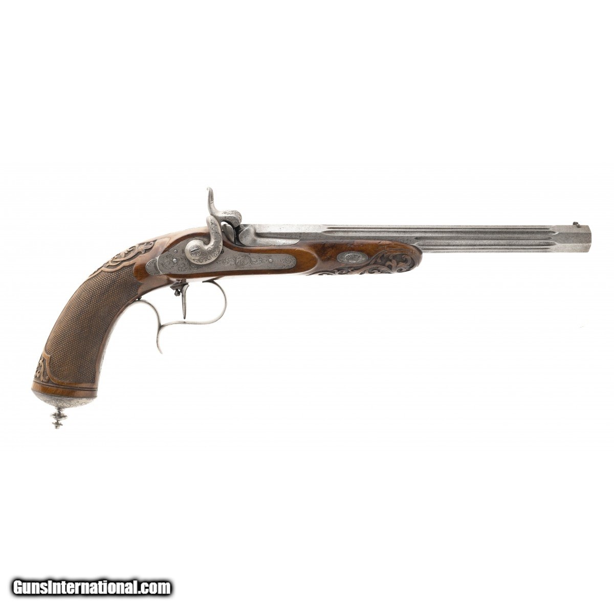 Description: "Antique dueling pistols. ""G. Noack in Berlin."" is marked in gold on top of the barrel flat. Barrels are rifled and fluted and have an intricate Damascus pattern. The barrels are 10"" with an overall length of 15.5"". Pistols have adjustable set triggers. The pistol stocks have beautiful relief carving of floral motif. The stocks have approximately 98% of original lacquer with some light handling marks. The actions work perfectly. The case is mahogany with ebony trim on the lid and corners. Interior is blue velvet. Accessories include an ebony ramrod, cap can, oiler, powder measure, cleaning rod with extension being slotted for a cloth patch. The case key is included and the powder flask is from James Dixon & Sons. This is an elegant pair of pistols with all metal parts engraved En Suite. Overall fine condition. SOLD Antique: Yes |