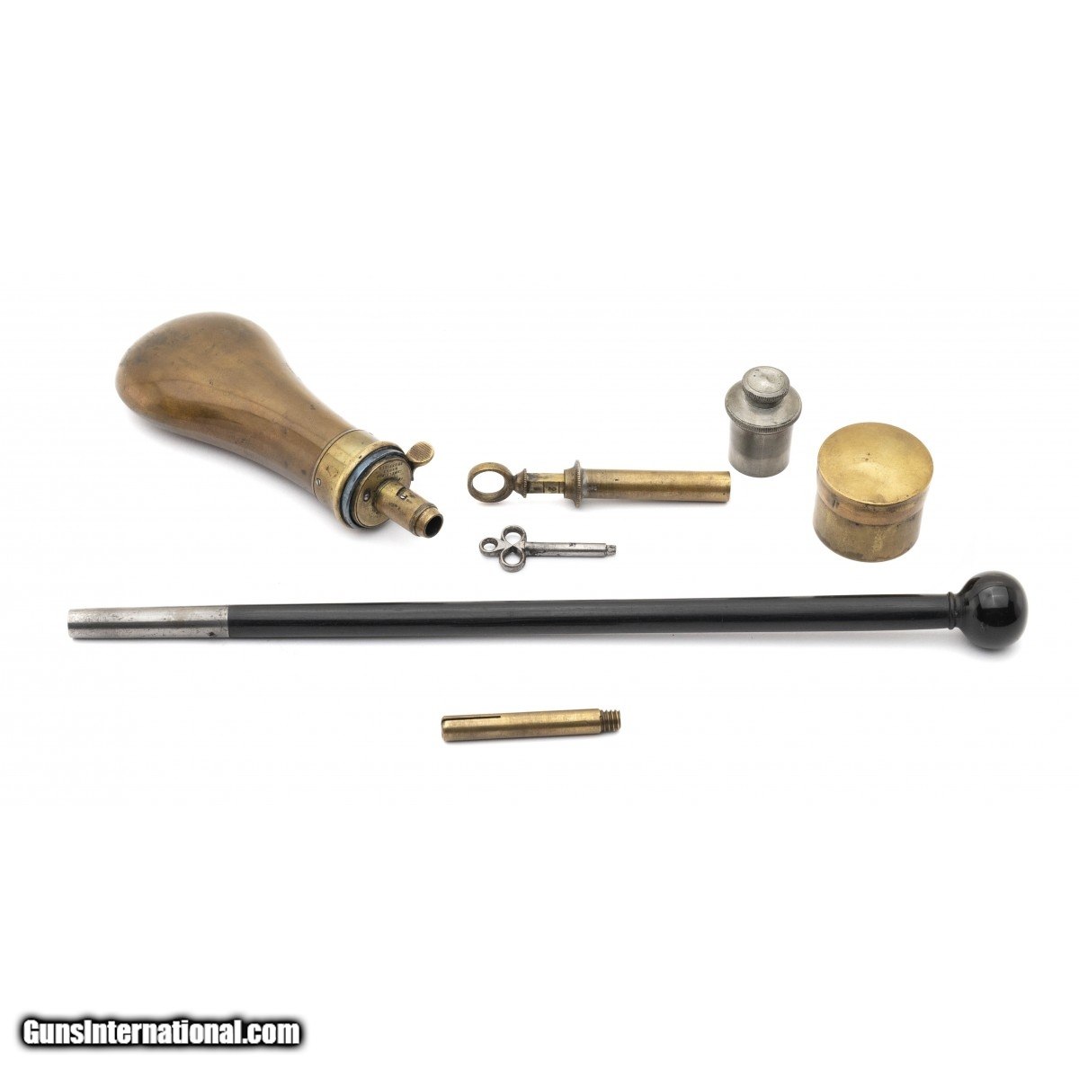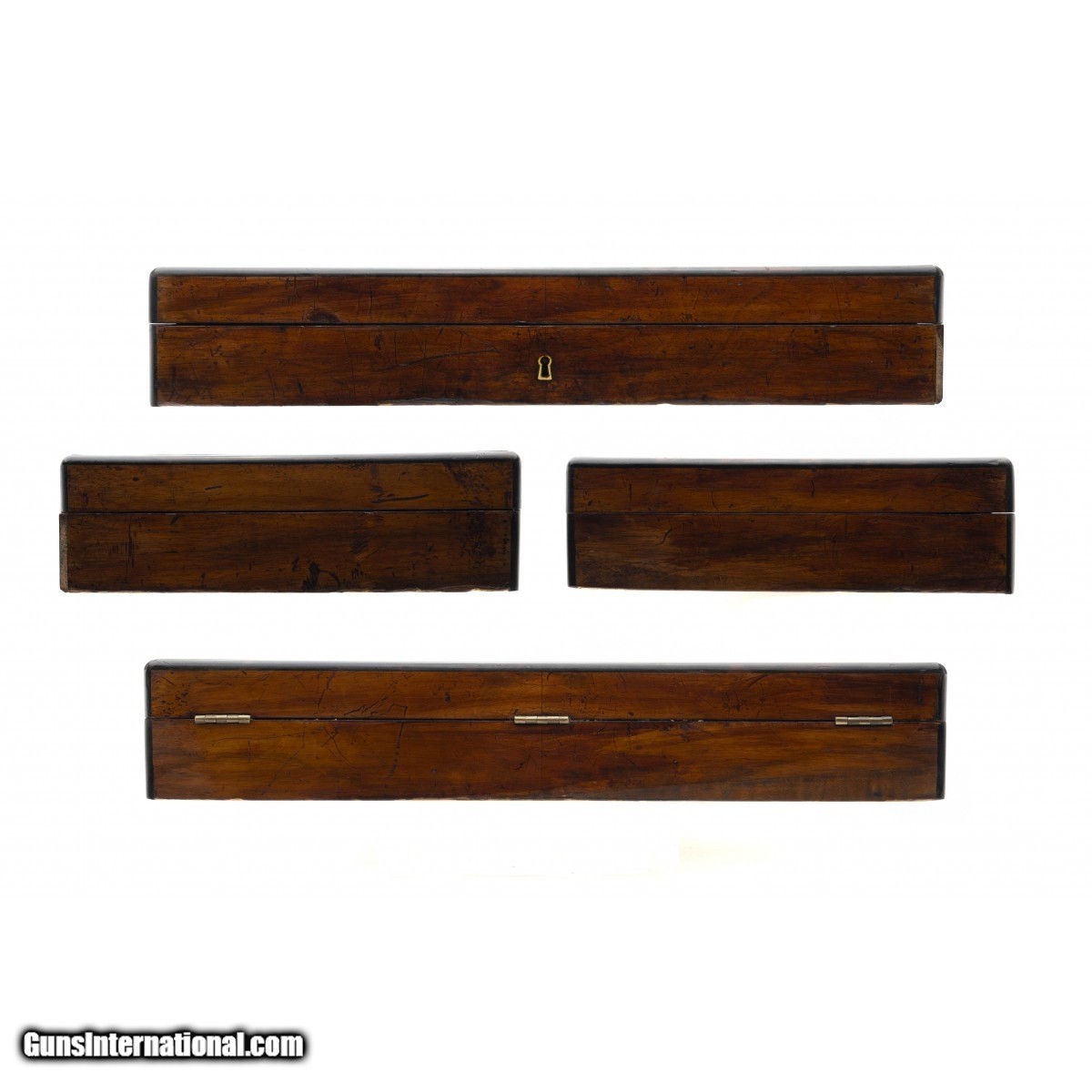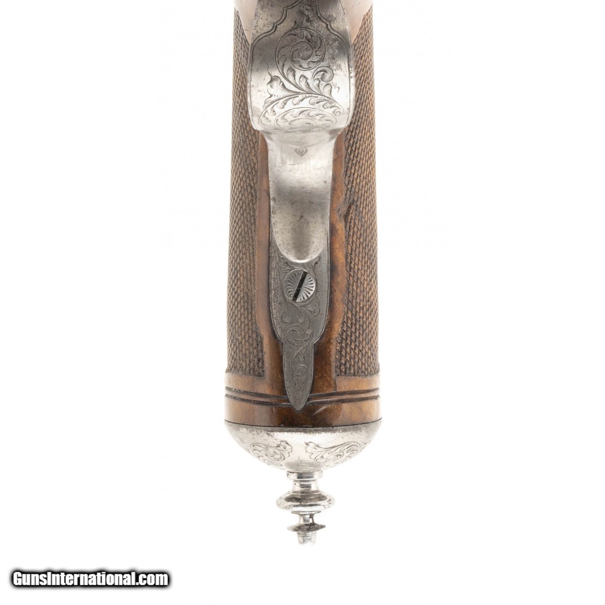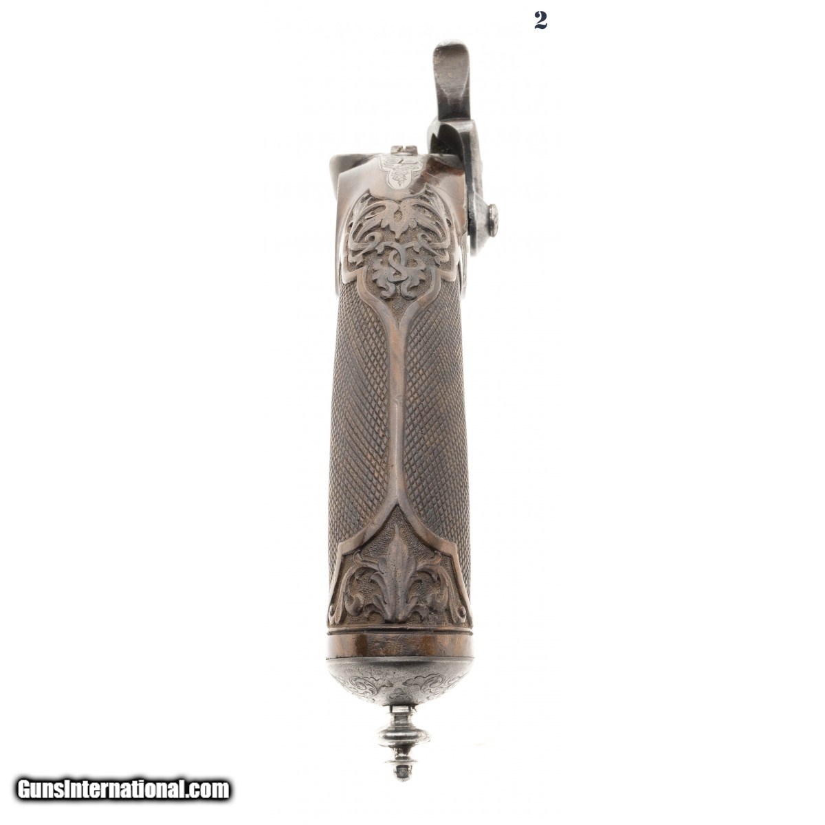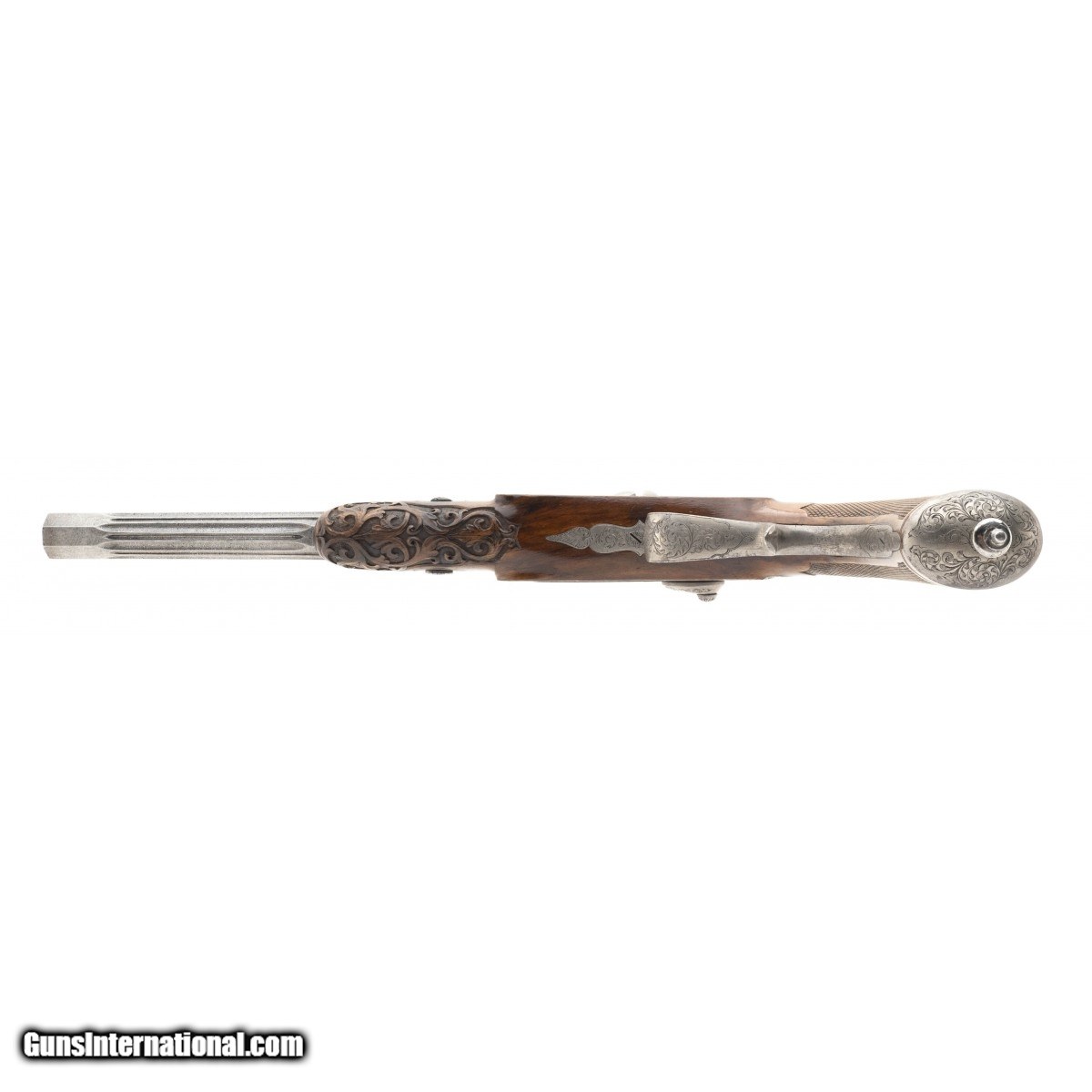 Description: "Antique dueling pistols. ""G. Noack in Berlin."" is marked in gold on top of the barrel flat. Barrels are rifled and fluted and have an intricate Damascus pattern. The barrels are 10"" with an overall length of 15.5"". Pistols have adjustable set triggers. The pistol stocks have beautiful relief carving of floral motif. The stocks have approximately 98% of original lacquer with some light handling marks. The actions work perfectly. The case is mahogany with ebony trim on the lid and corners. Interior is blue velvet. Accessories include an ebony ramrod, cap can, oiler, powder measure, cleaning rod with extension being slotted for a cloth patch. The case key is included and the powder flask is from James Dixon & Sons. This is an elegant pair of pistols with all metal parts engraved En Suite. Overall fine condition. SOLD Antique: Yes |