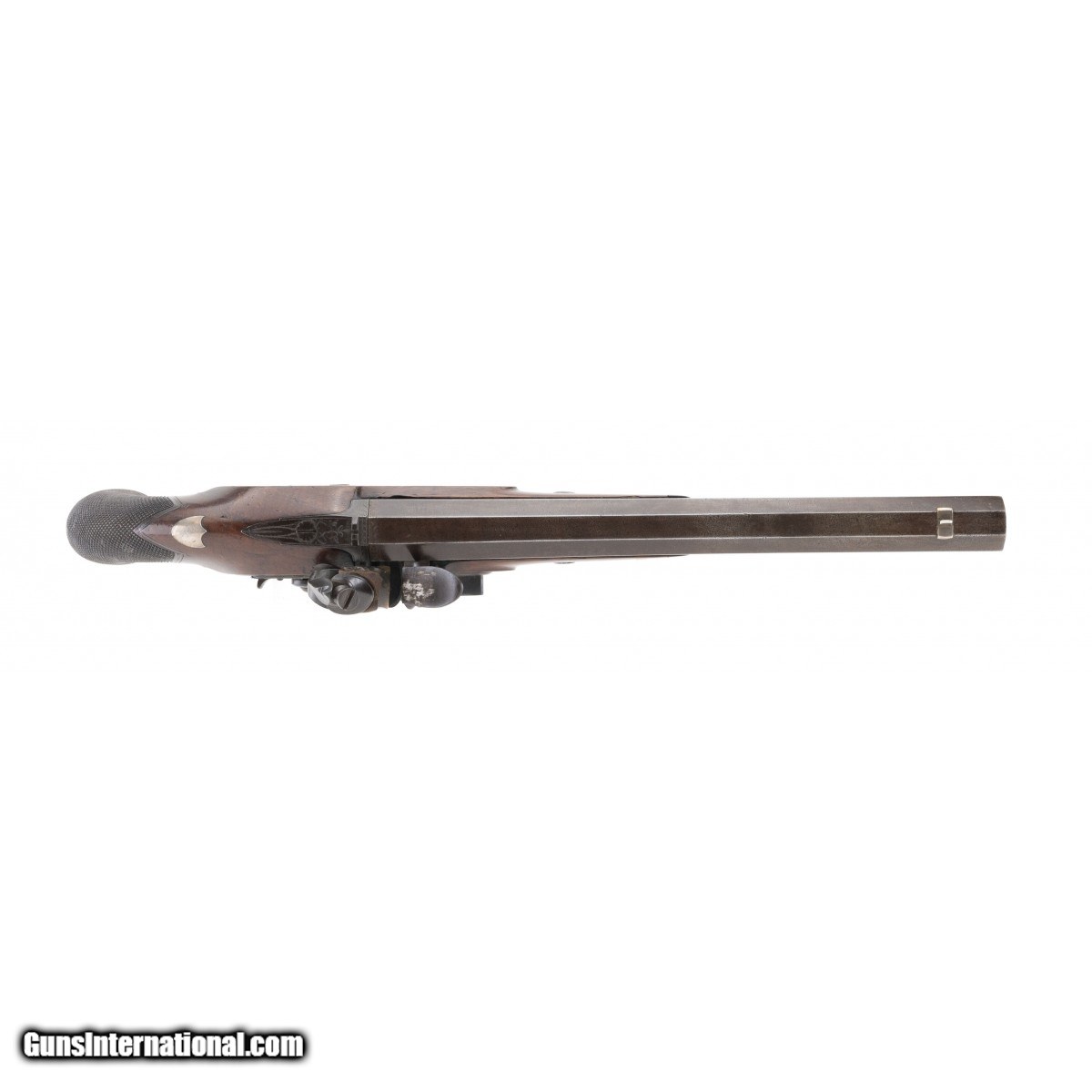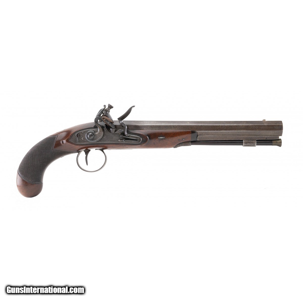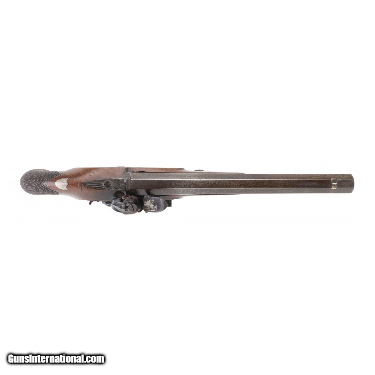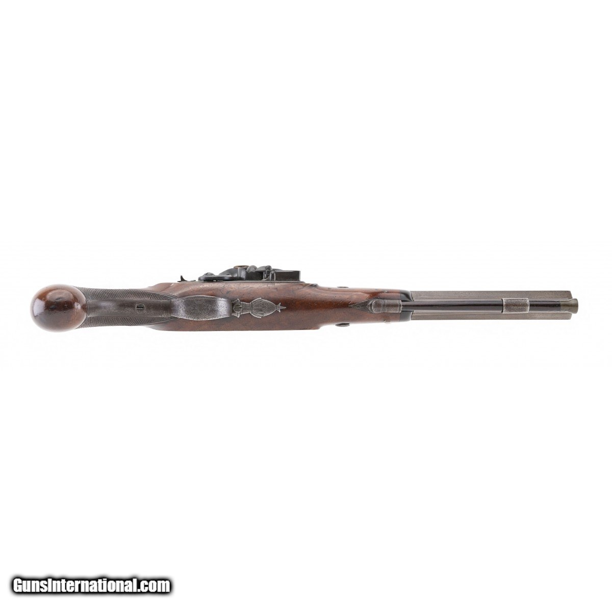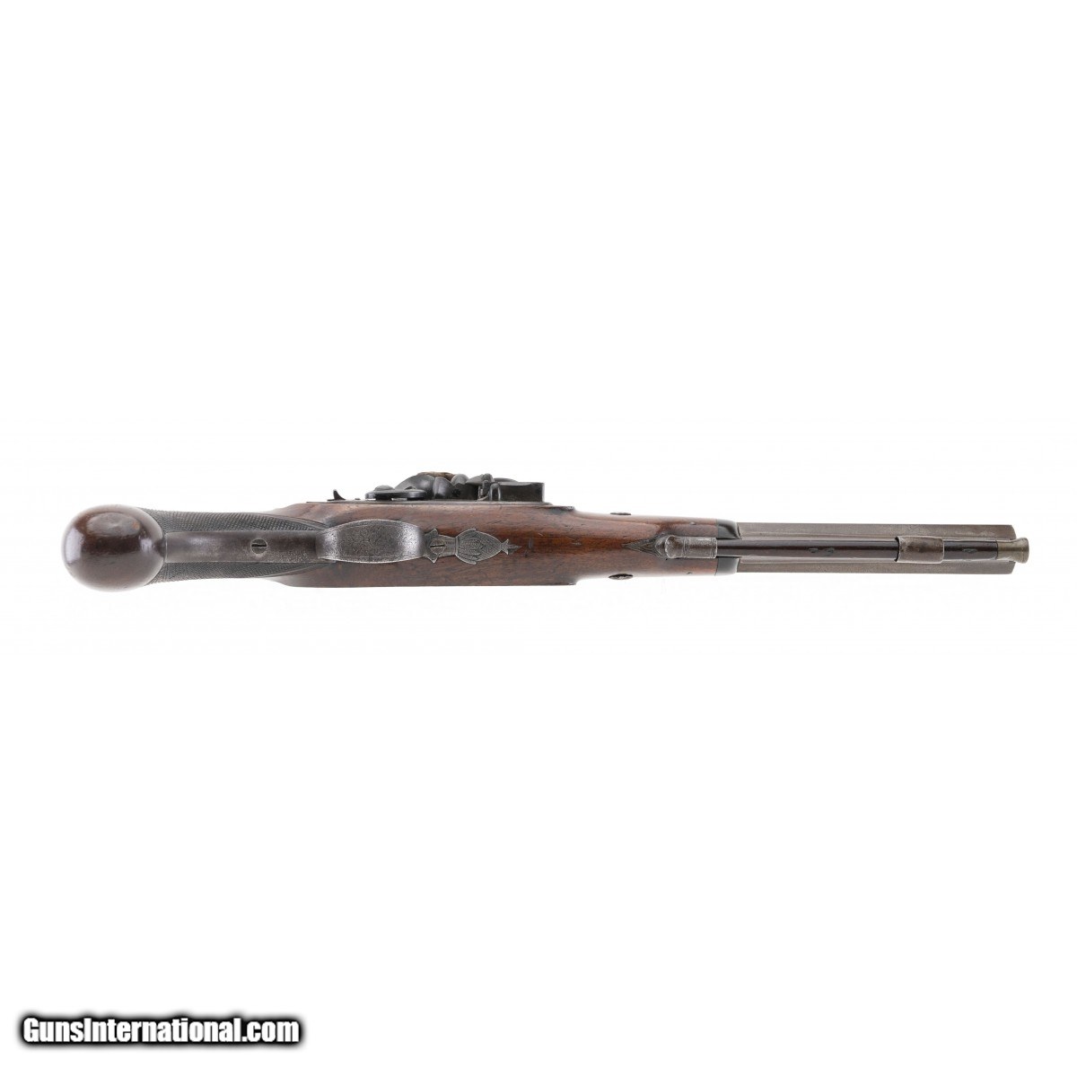 Description: " Very fine pair made by Aston of Manchester. Approximately 1790-1810 manufacture. The bores are remarkably bright and are .65 caliber. Barrel lengths are 10"" and overall lengths are 15"". Locks have sliding safeties and lockplate is marked ""Aston"". Top flat of barrel is marked ""Manchester"". Note that on both pistols ""Manchester"" lettering is thin. Barrels have even extremely fine pitting. Stocks are excellent on both pistols and have black horn nose caps. Case is mahogany and is in very good plus condition and has recessed hook latches. Case lid has a rectangular brass plaque with no initials on crest. Case has the Aston trade label which is soiled from many years exposed to oils and residue from use. An attractive cased flintlock! SOLD Antique: Yes |