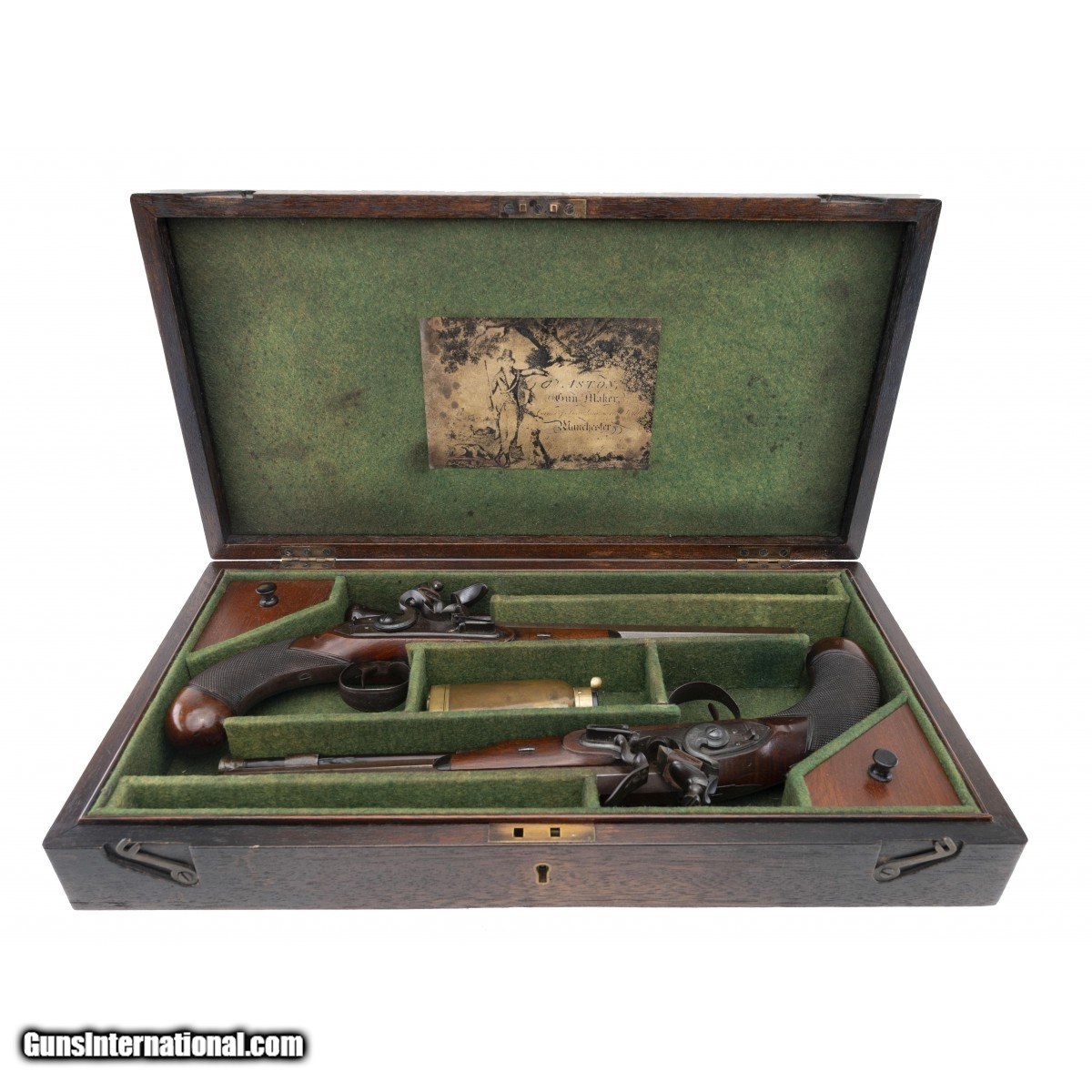 Very fine pair made by Aston of Manchester. Approximately 1790-1810 manufacture. The bores are remarkably bright and are .65 caliber. Barrel lengths are 10"" and overall lengths are 15"". Locks have sliding safeties and lockplate is marked ""Aston"". Top flat of barrel is marked ""Manchester"". Note that on both pistols ""Manchester"" lettering is thin. Barrels have even extremely fine pitting. Stocks are excellent on both pistols and have black horn nose caps. Case is mahogany and is in very good plus condition and has recessed hook latches. Case lid has a rectangular brass plaque with no initials on crest. Case has the Aston trade label which is soiled from many years exposed to oils and residue from use. An attractive cased flintlock!