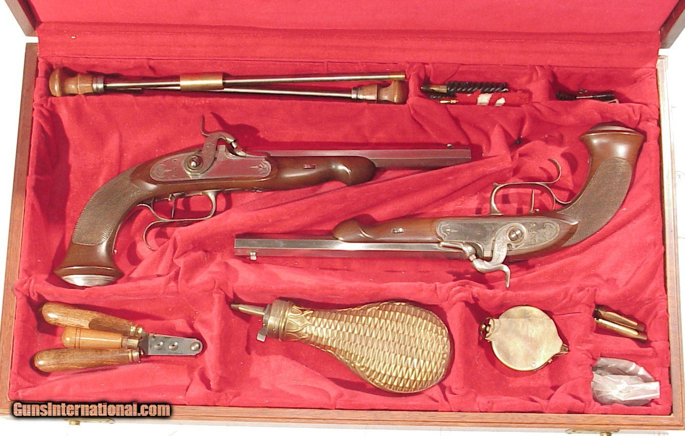 Description: .44 caliber, 8" octagon barrels front sights. Flat locks, and cocks with half position safeties. Set triggers and finger extensions on the trigger guards. All of the metal parts a excluding the barrels are engraved and all are polished bright. Checkered half stocks. Mint bores. In their original factory presentation wooden box with red velvet lining and all of the accessories. Very nice quality and in superb original condition. Percussion muzzle loading no subject FFL transfer. SOLD Antique: Yes |