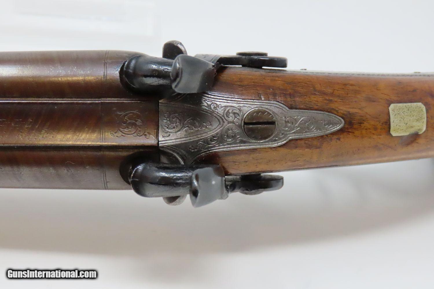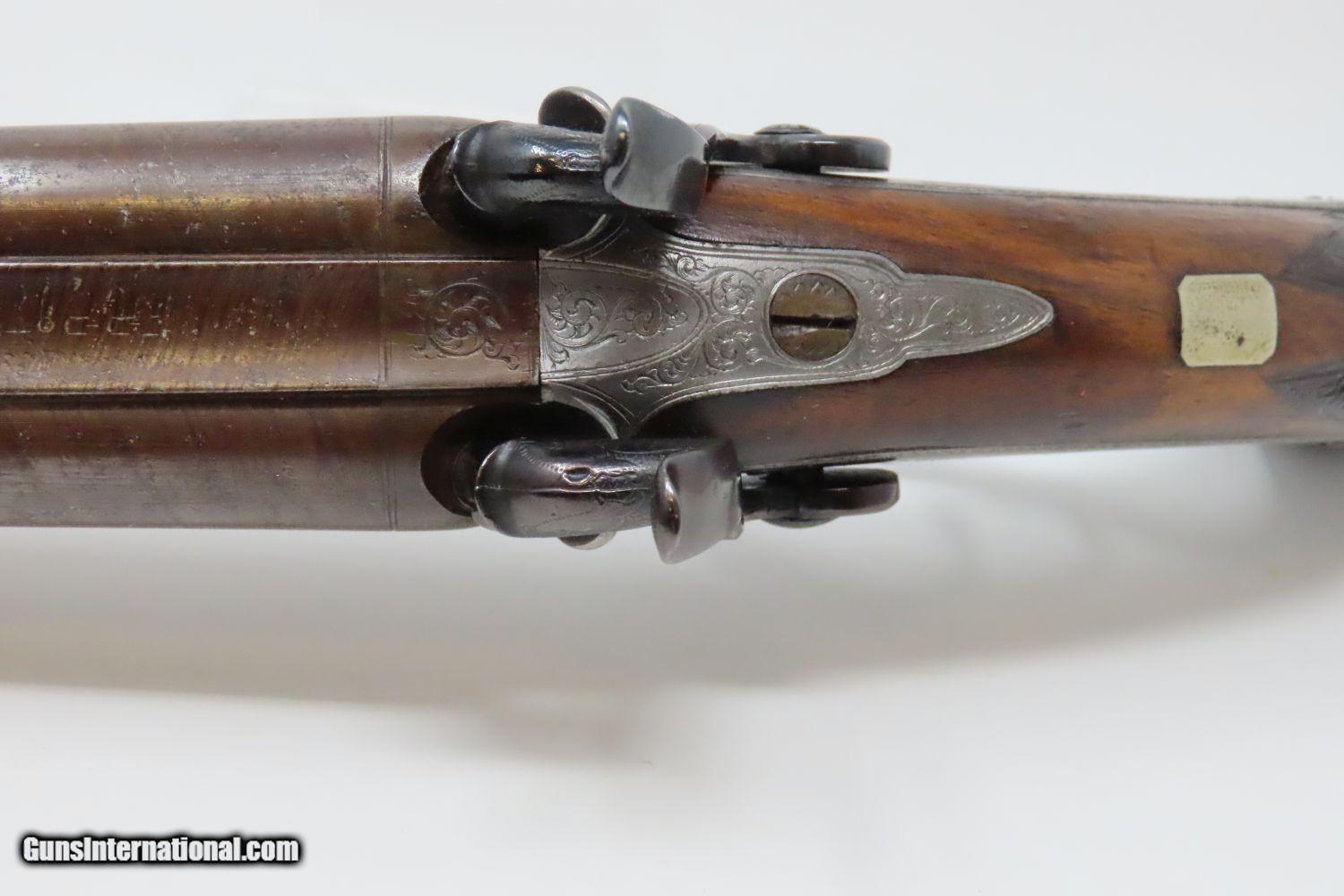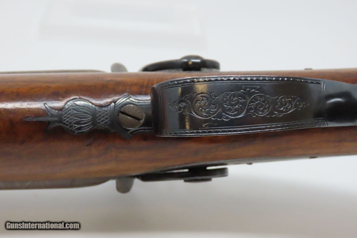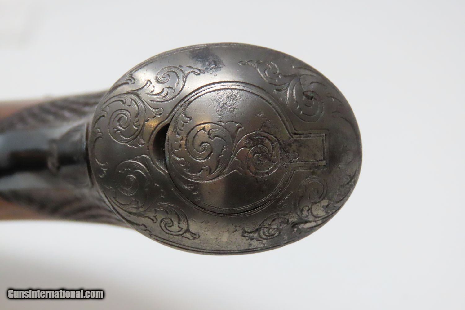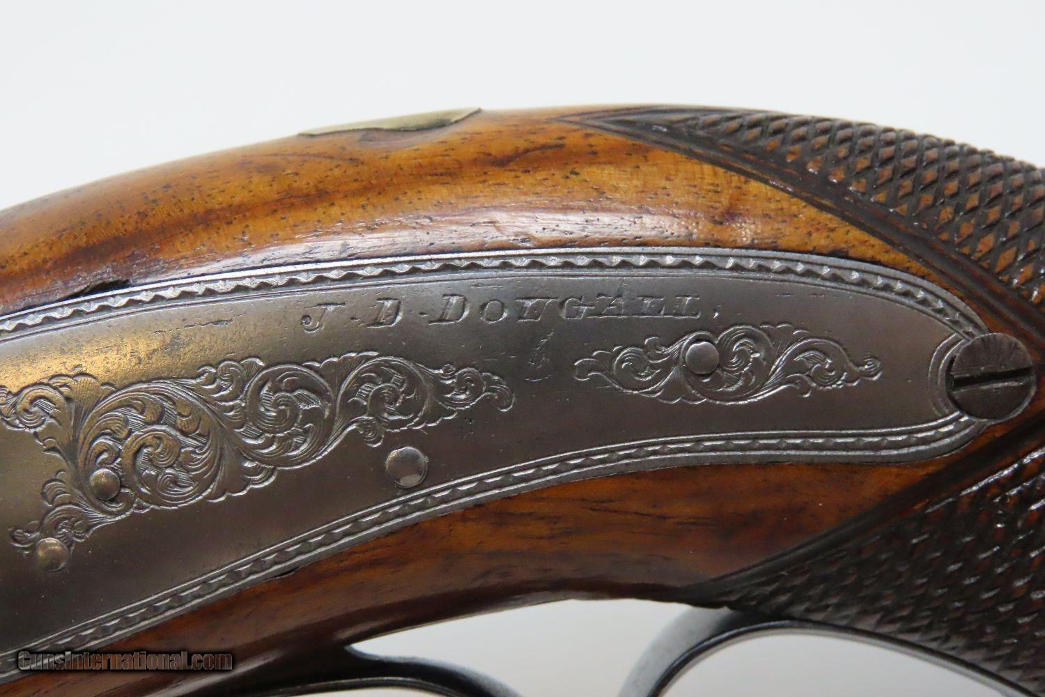 Description: BRACE of HOWDAH Pistols by JD DOUGALL of GLASGOW, SCOTLAND TIGER PROTECTION Famous in India for Use Against Tigers! Here we present an antique Brace of Howdah Pistols by J.D. Dougall of Glasgow, Scotland. Howdah pistols were used in the far flung extremities of the British Empire, primarily as tiger repellant. They are named for the “howdah”, a large basket-like seat that men used to ride elephants with as they hunted from their backs. The sport originated in the late 1700s and having a flintlock or percussion backup sidearm with two large doses of lead seemed to be the answer for dangerous game or even the natives. Of course, a pair of large bore doubles would be formidable for just about anything! “J.D. DOUGALL” is engraved on the locks and “J.D. DOUGALL/GLASGOW” is atop the barrels. The locks, barrel tangs, and trigger guards are engraved with detailed floral designs. The overall condition is on both pistols is very good. Nicely refinished. The actions are strong all around. The bores are smooth and remain in good shape. The checkering on the handles is still sharp, thus offering a strong and confident grip. Here is a very nice set of mid-19th century manufactured pistols that would look great on display. An epic set of pistols from the British Empire! Own the original! This is a legitimate antique and not a reproduction. Barrels are 6-3/8 inches. Caliber: .56 Overall condition as seen in photos. Very Fast. Very Safe. FREE SHIPPING WORLDWIDE. Delivered directly to your door by express mail! Guaranteed AUTHENTIC & Includes CERTIFICATE OF AUTHENTICITY. ancestryguns $3695 #20527 SOLD Antique: Yes |