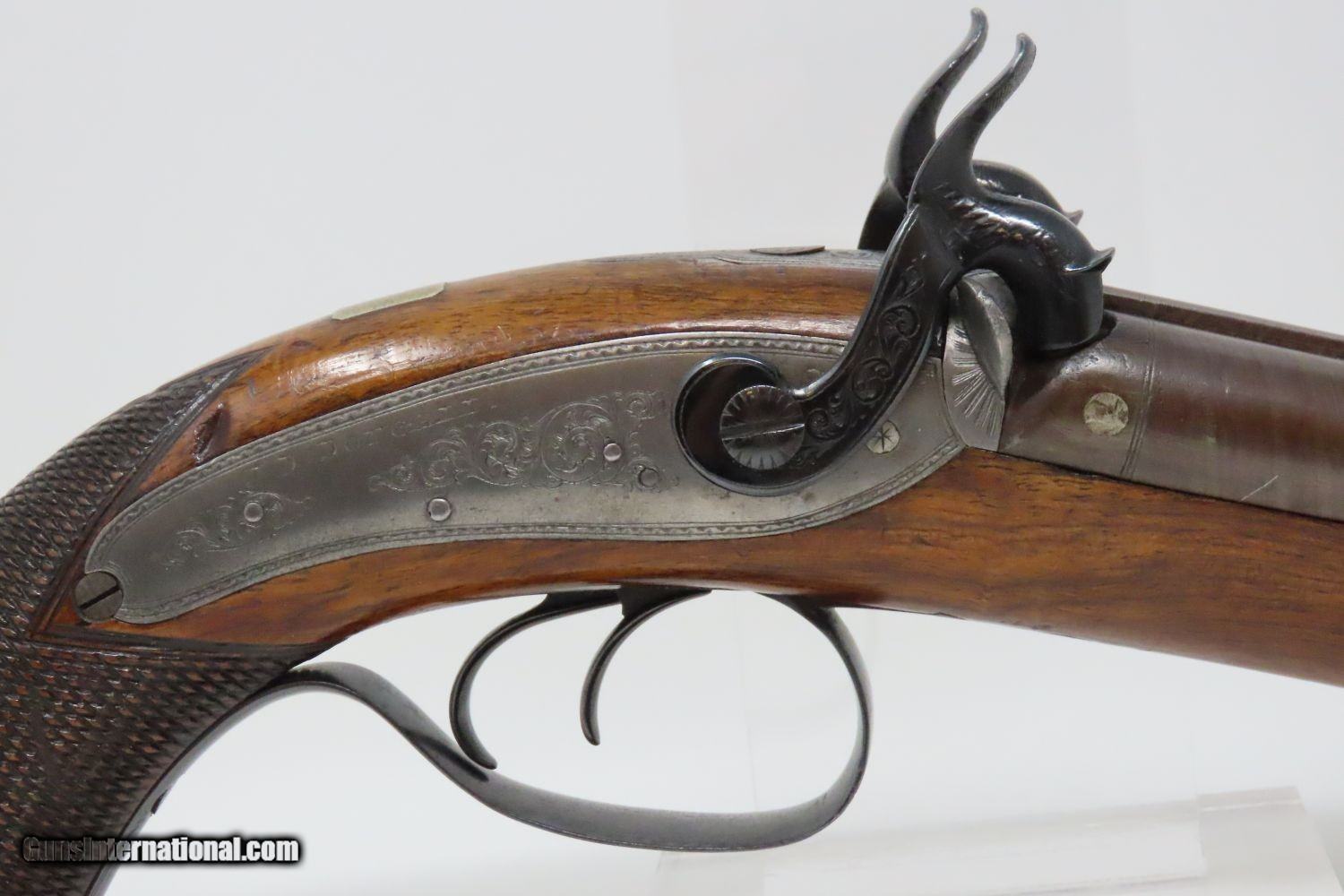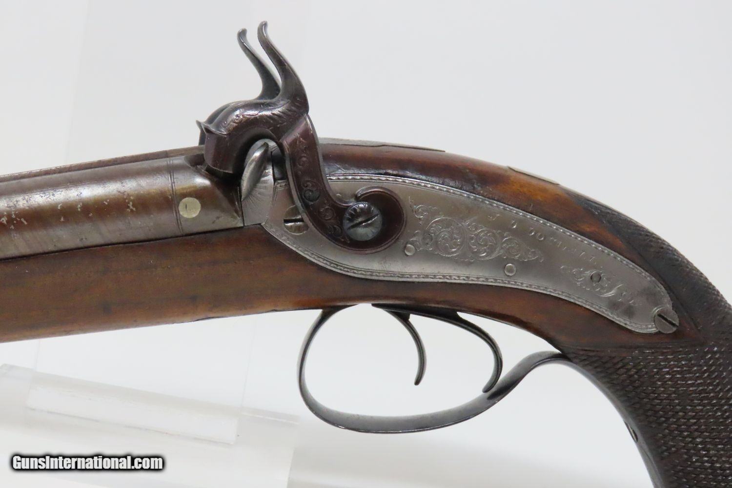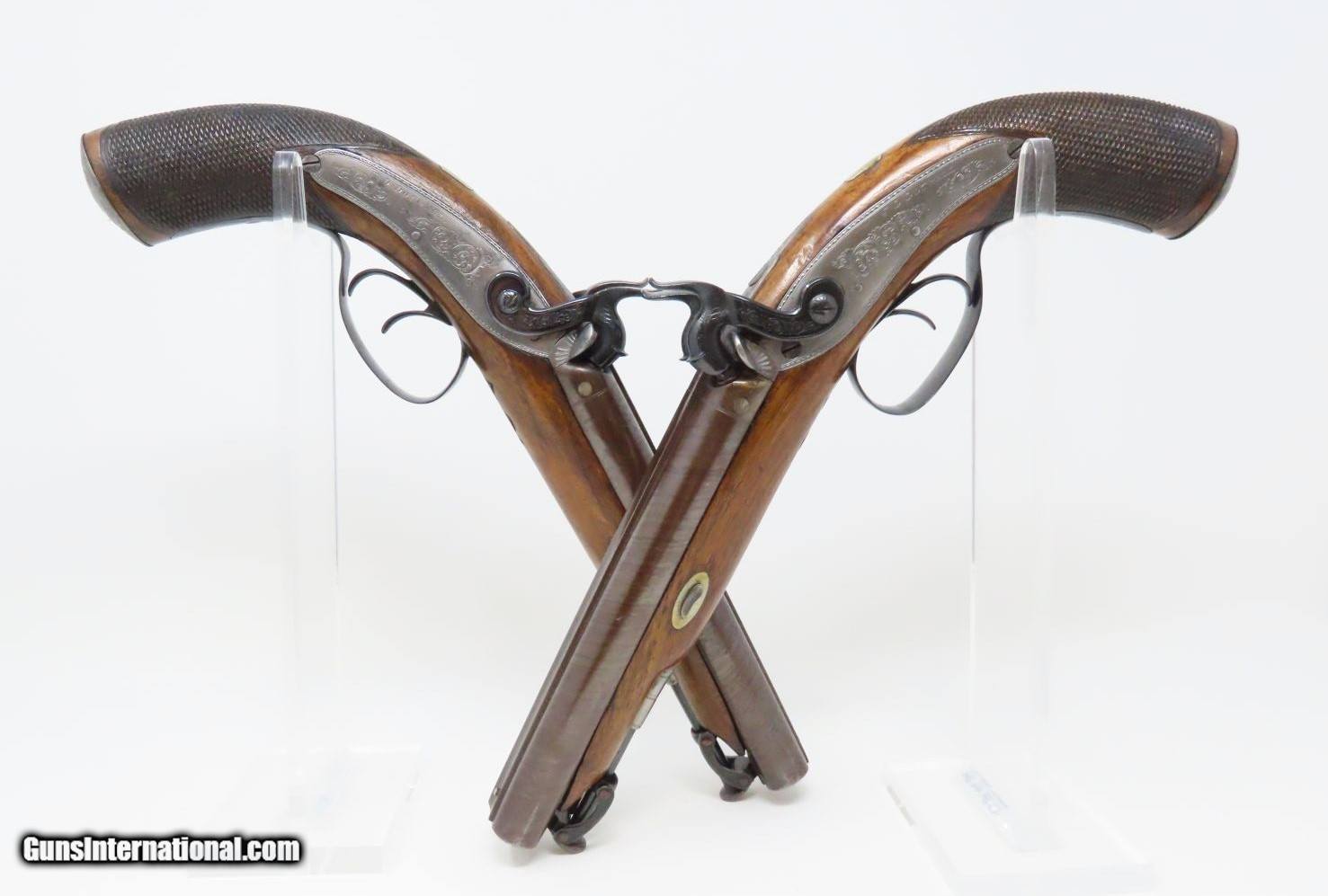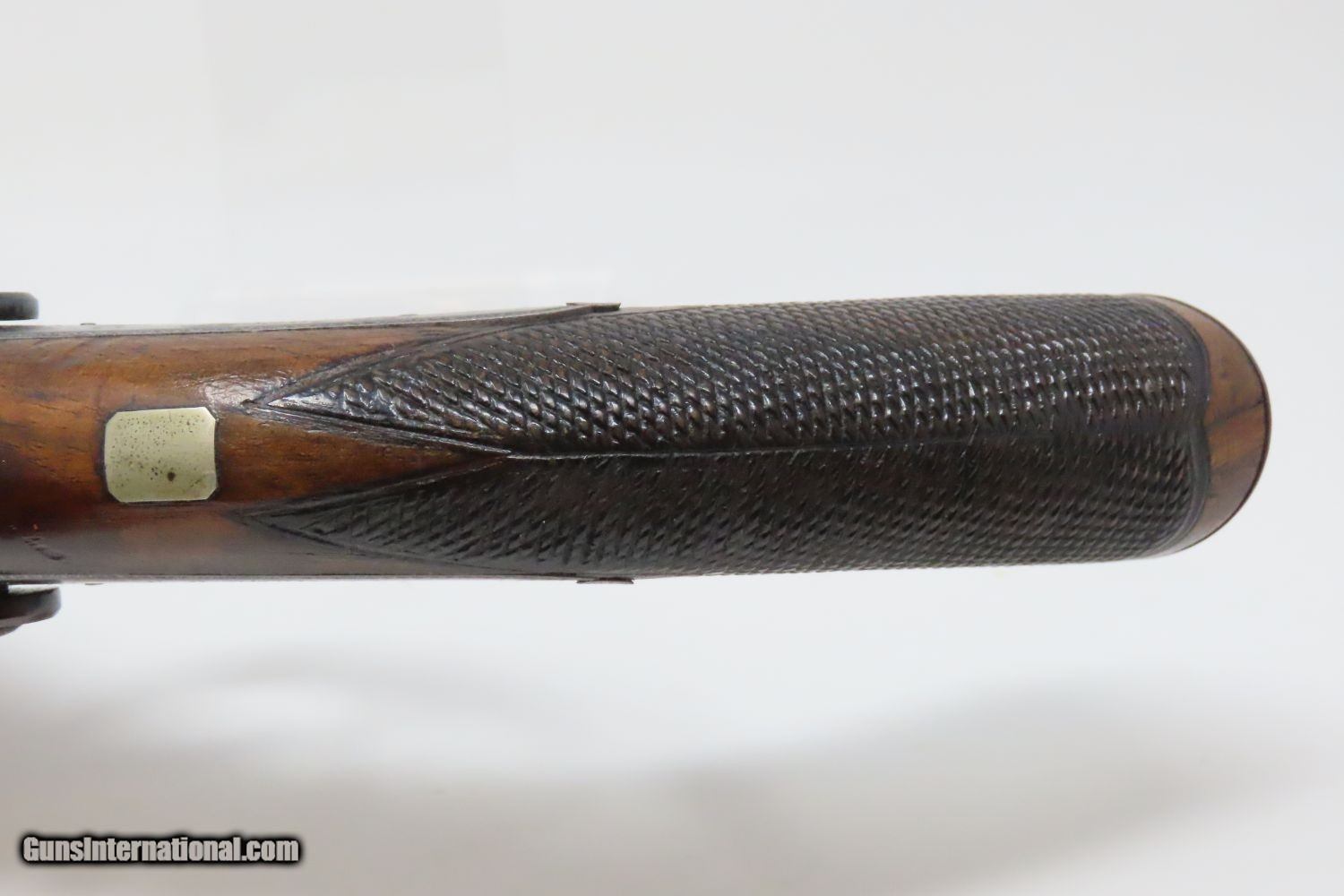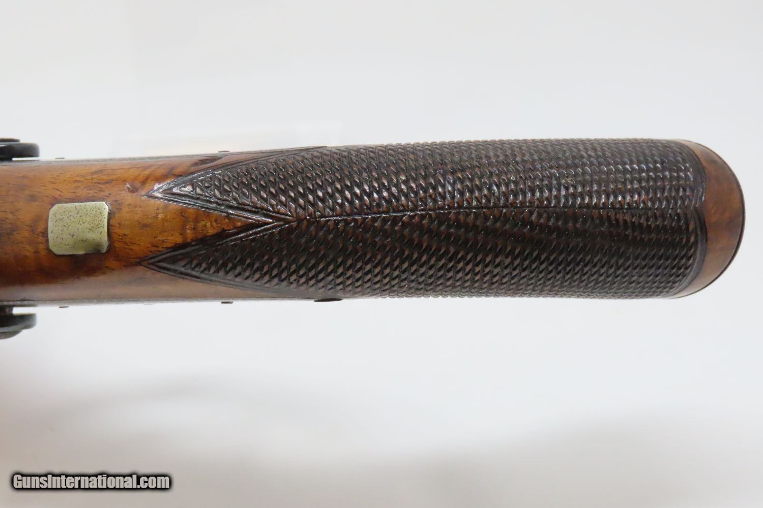 Description: BRACE of HOWDAH Pistols by JD DOUGALL of GLASGOW, SCOTLAND TIGER PROTECTION Famous in India for Use Against Tigers! Here we present an antique Brace of Howdah Pistols by J.D. Dougall of Glasgow, Scotland. Howdah pistols were used in the far flung extremities of the British Empire, primarily as tiger repellant. They are named for the “howdah”, a large basket-like seat that men used to ride elephants with as they hunted from their backs. The sport originated in the late 1700s and having a flintlock or percussion backup sidearm with two large doses of lead seemed to be the answer for dangerous game or even the natives. Of course, a pair of large bore doubles would be formidable for just about anything! “J.D. DOUGALL” is engraved on the locks and “J.D. DOUGALL/GLASGOW” is atop the barrels. The locks, barrel tangs, and trigger guards are engraved with detailed floral designs. The overall condition is on both pistols is very good. Nicely refinished. The actions are strong all around. The bores are smooth and remain in good shape. The checkering on the handles is still sharp, thus offering a strong and confident grip. Here is a very nice set of mid-19th century manufactured pistols that would look great on display. An epic set of pistols from the British Empire! Own the original! This is a legitimate antique and not a reproduction. Barrels are 6-3/8 inches. Caliber: .56 Overall condition as seen in photos. Very Fast. Very Safe. FREE SHIPPING WORLDWIDE. Delivered directly to your door by express mail! Guaranteed AUTHENTIC & Includes CERTIFICATE OF AUTHENTICITY. ancestryguns $3695 #20527 SOLD Antique: Yes |