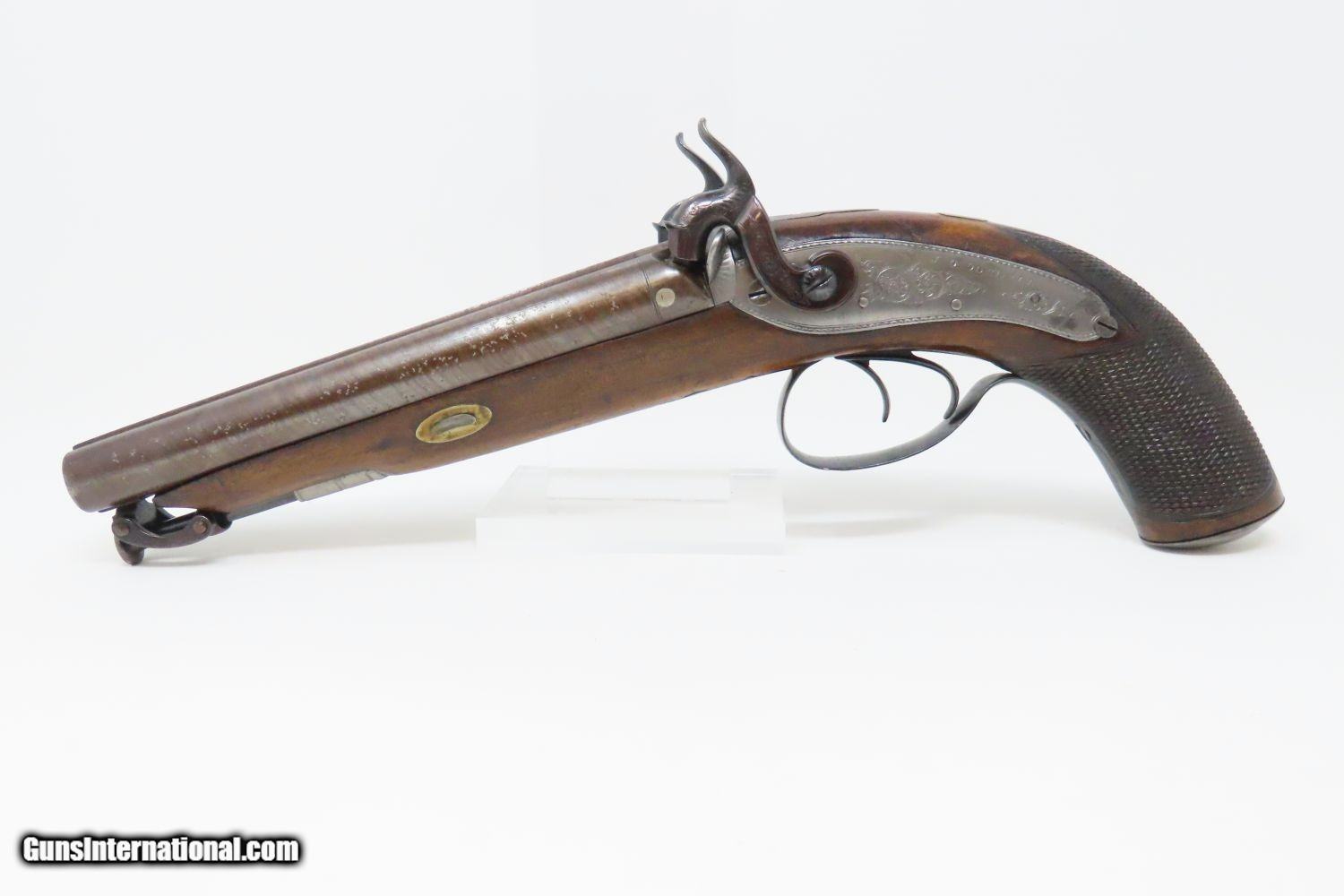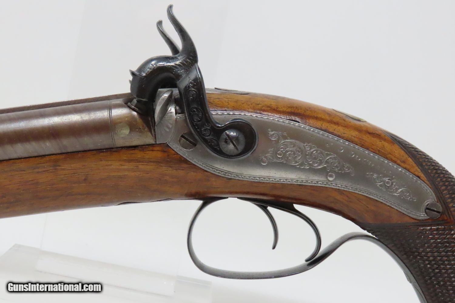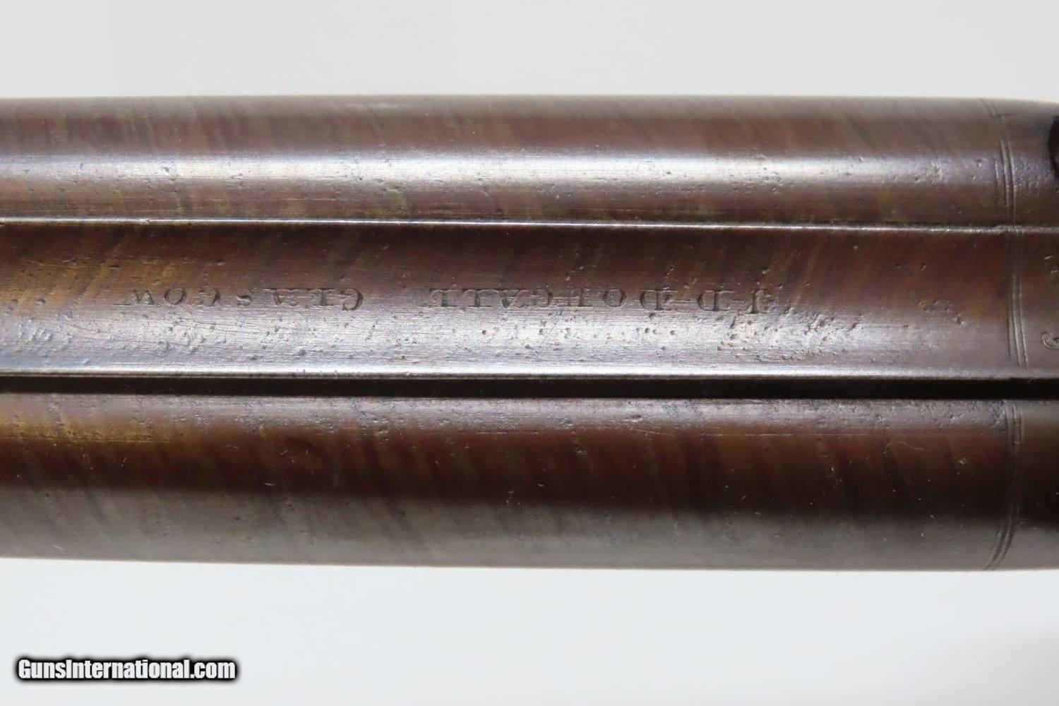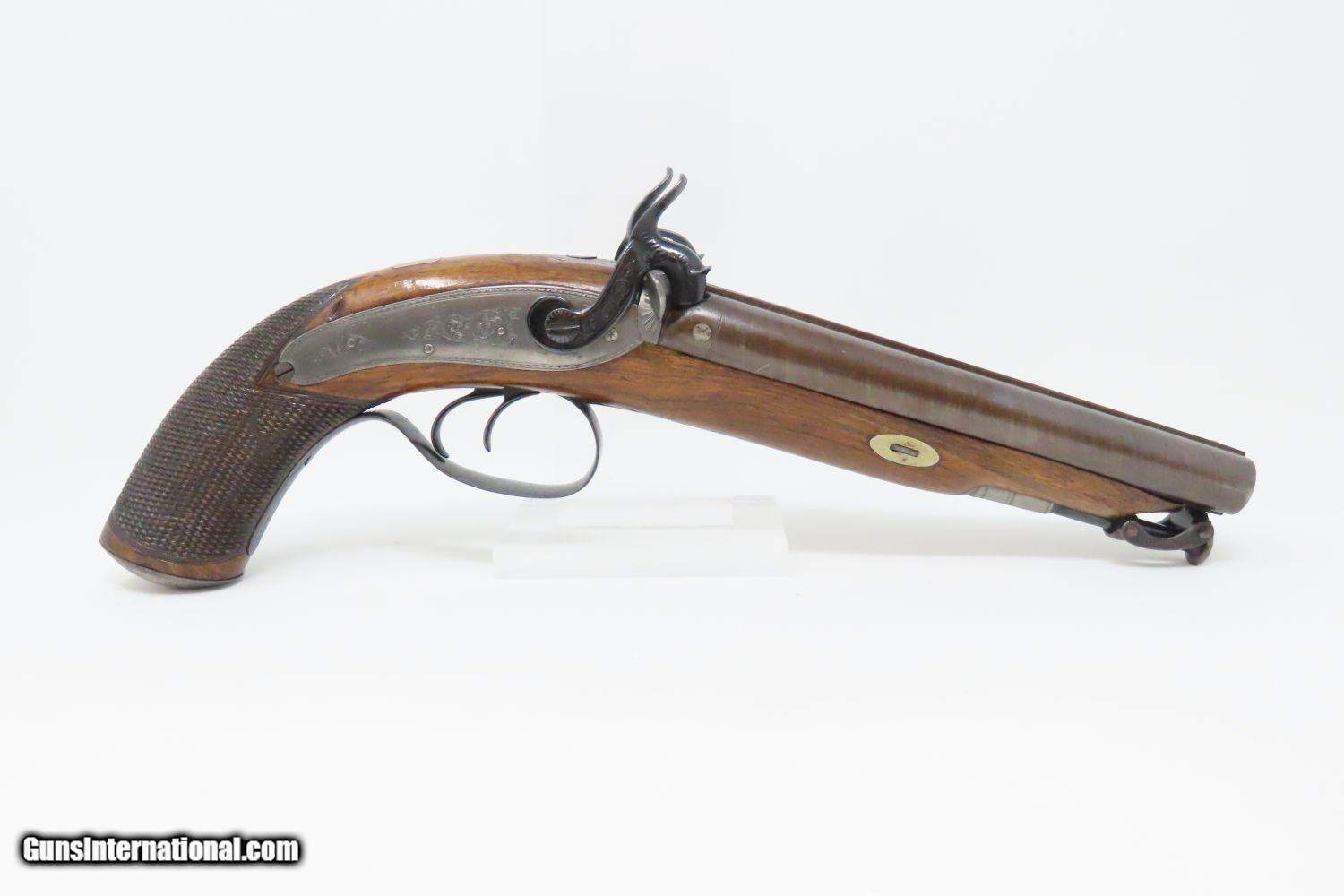 Description: BRACE of HOWDAH Pistols by JD DOUGALL of GLASGOW, SCOTLAND TIGER PROTECTION Famous in India for Use Against Tigers! Here we present an antique Brace of Howdah Pistols by J.D. Dougall of Glasgow, Scotland. Howdah pistols were used in the far flung extremities of the British Empire, primarily as tiger repellant. They are named for the “howdah”, a large basket-like seat that men used to ride elephants with as they hunted from their backs. The sport originated in the late 1700s and having a flintlock or percussion backup sidearm with two large doses of lead seemed to be the answer for dangerous game or even the natives. Of course, a pair of large bore doubles would be formidable for just about anything! “J.D. DOUGALL” is engraved on the locks and “J.D. DOUGALL/GLASGOW” is atop the barrels. The locks, barrel tangs, and trigger guards are engraved with detailed floral designs. The overall condition is on both pistols is very good. Nicely refinished. The actions are strong all around. The bores are smooth and remain in good shape. The checkering on the handles is still sharp, thus offering a strong and confident grip. Here is a very nice set of mid-19th century manufactured pistols that would look great on display. An epic set of pistols from the British Empire! Own the original! This is a legitimate antique and not a reproduction. Barrels are 6-3/8 inches. Caliber: .56 Overall condition as seen in photos. Very Fast. Very Safe. FREE SHIPPING WORLDWIDE. Delivered directly to your door by express mail! Guaranteed AUTHENTIC & Includes CERTIFICATE OF AUTHENTICITY. ancestryguns $3695 #20527 SOLD Antique: Yes |