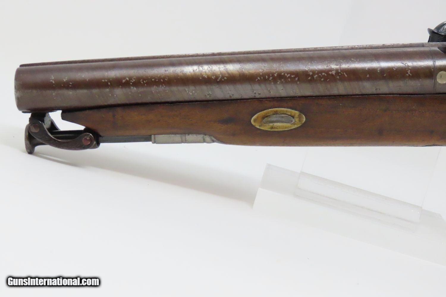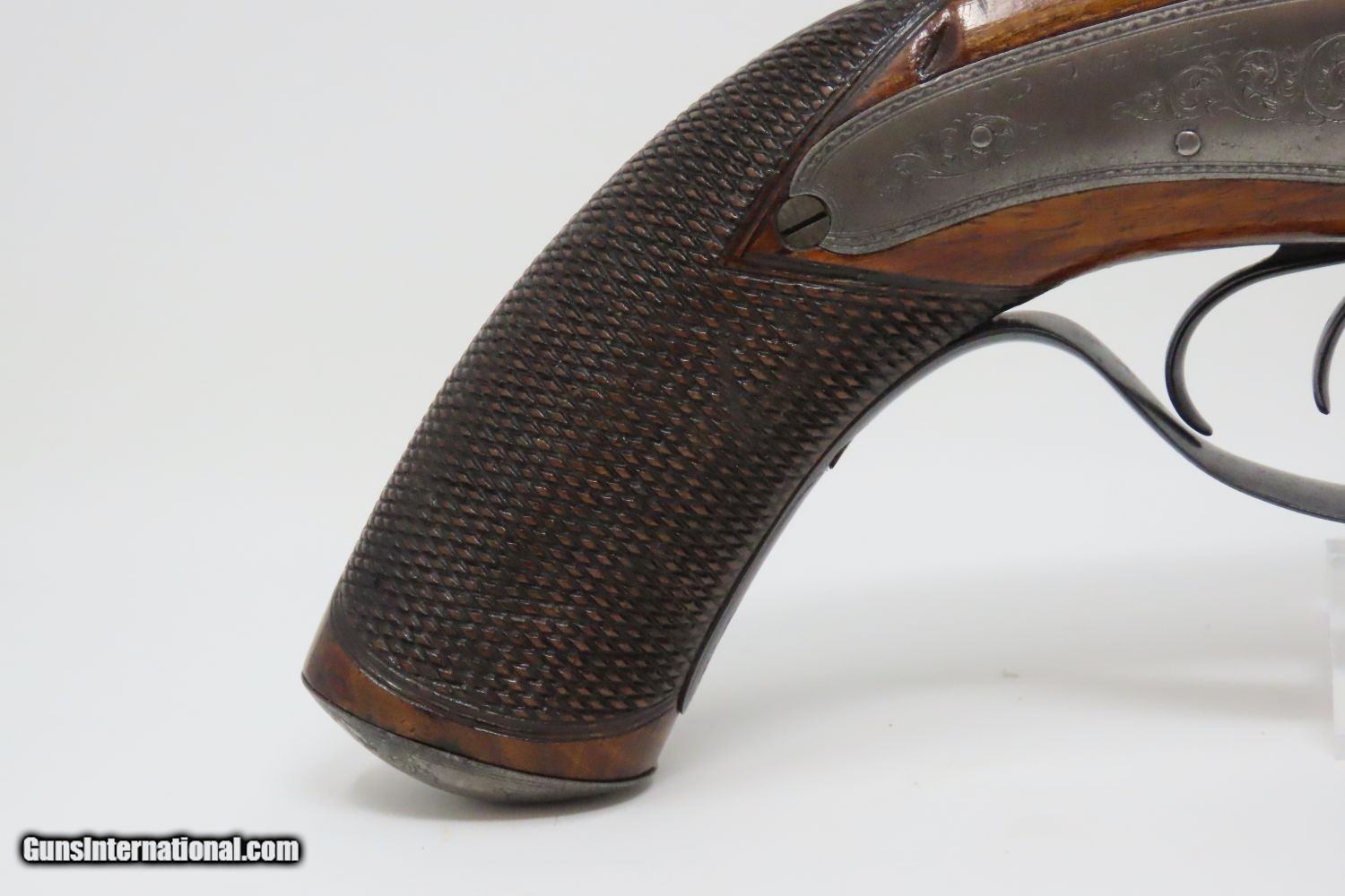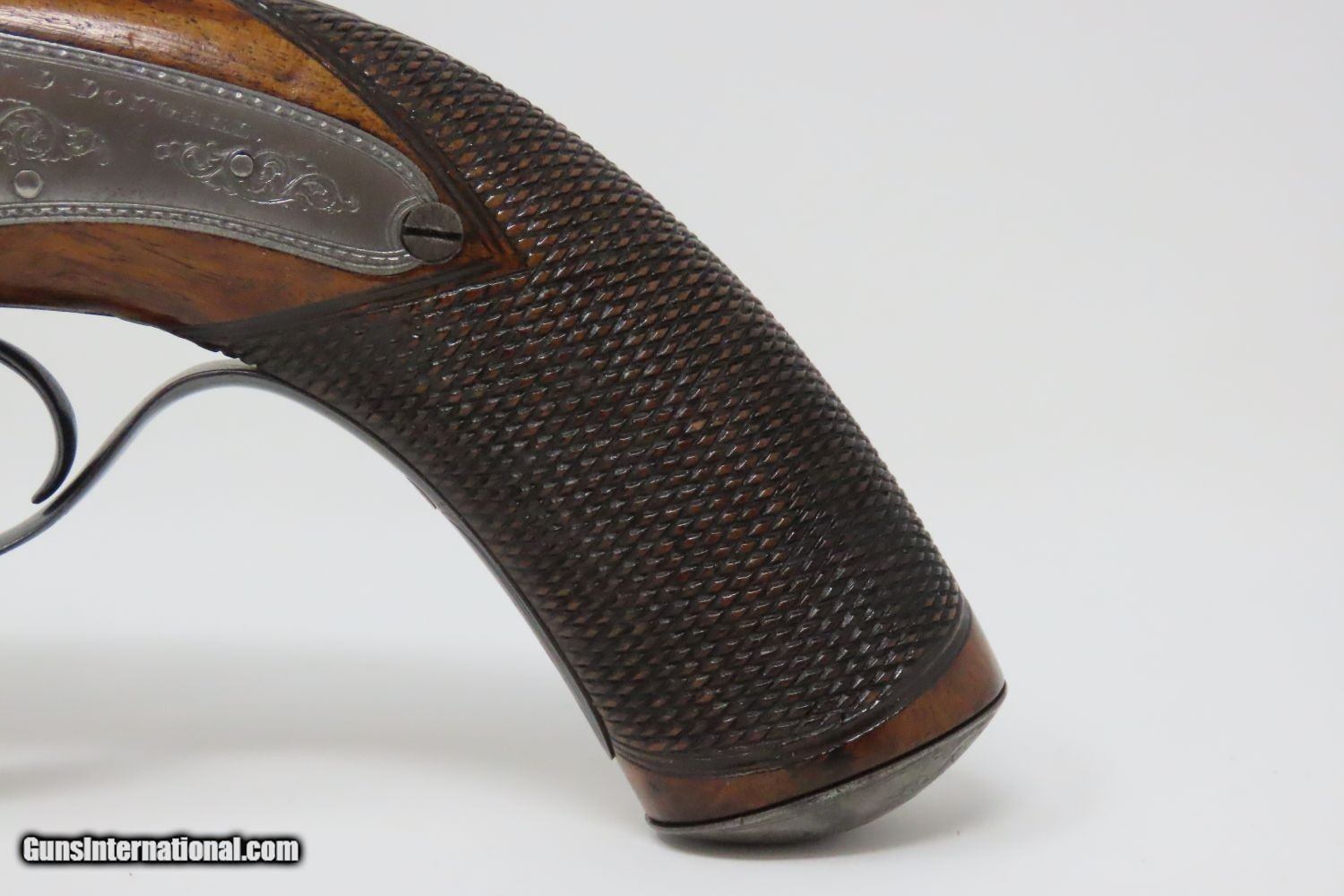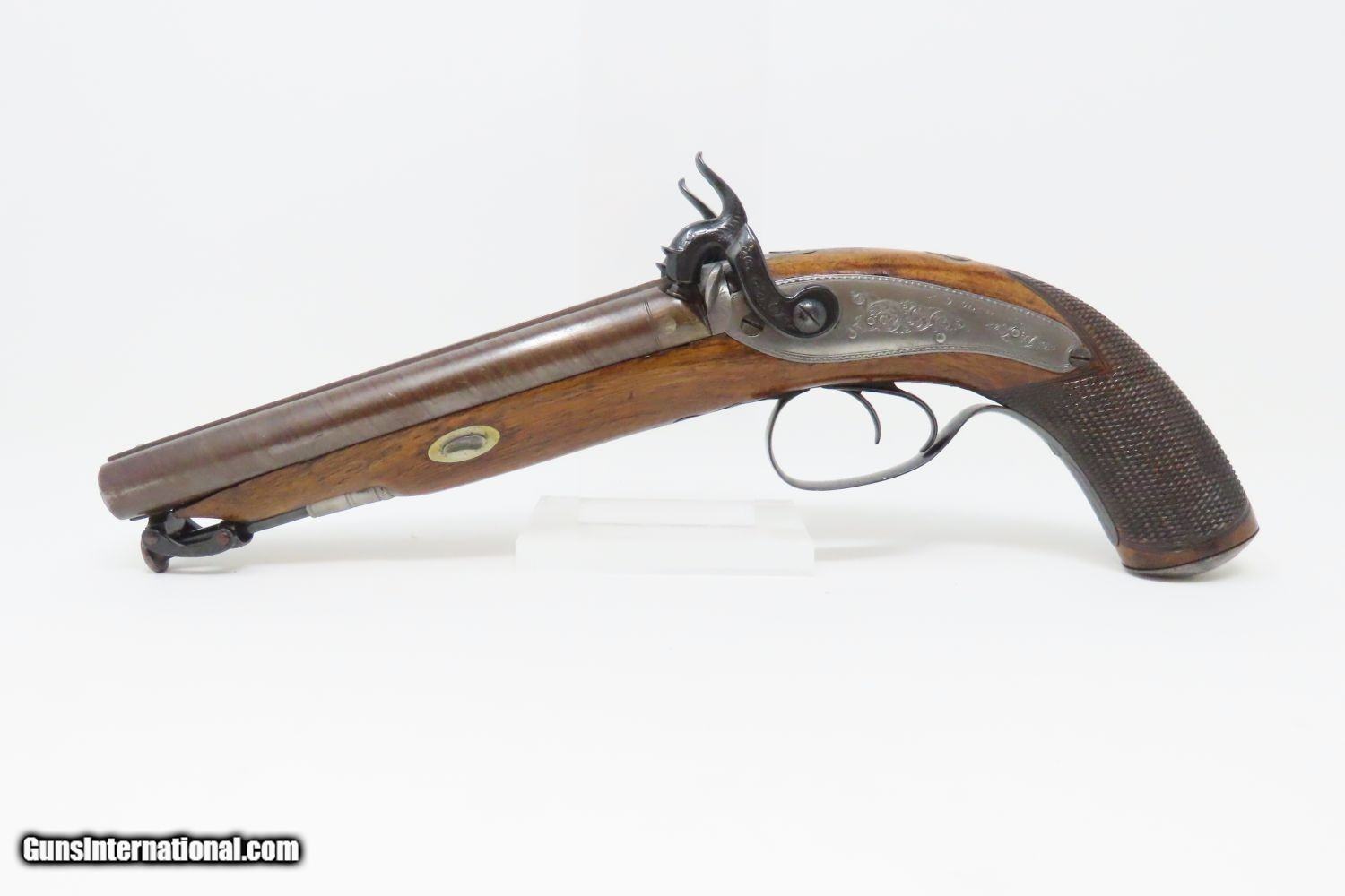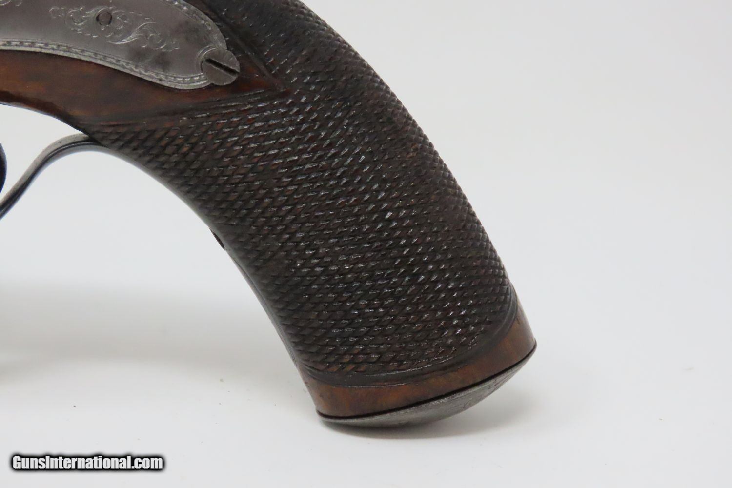 Description: BRACE of HOWDAH Pistols by JD DOUGALL of GLASGOW, SCOTLAND TIGER PROTECTION Famous in India for Use Against Tigers! Here we present an antique Brace of Howdah Pistols by J.D. Dougall of Glasgow, Scotland. Howdah pistols were used in the far flung extremities of the British Empire, primarily as tiger repellant. They are named for the “howdah”, a large basket-like seat that men used to ride elephants with as they hunted from their backs. The sport originated in the late 1700s and having a flintlock or percussion backup sidearm with two large doses of lead seemed to be the answer for dangerous game or even the natives. Of course, a pair of large bore doubles would be formidable for just about anything! “J.D. DOUGALL” is engraved on the locks and “J.D. DOUGALL/GLASGOW” is atop the barrels. The locks, barrel tangs, and trigger guards are engraved with detailed floral designs. The overall condition is on both pistols is very good. Nicely refinished. The actions are strong all around. The bores are smooth and remain in good shape. The checkering on the handles is still sharp, thus offering a strong and confident grip. Here is a very nice set of mid-19th century manufactured pistols that would look great on display. An epic set of pistols from the British Empire! Own the original! This is a legitimate antique and not a reproduction. Barrels are 6-3/8 inches. Caliber: .56 Overall condition as seen in photos. Very Fast. Very Safe. FREE SHIPPING WORLDWIDE. Delivered directly to your door by express mail! Guaranteed AUTHENTIC & Includes CERTIFICATE OF AUTHENTICITY. ancestryguns $3695 #20527 SOLD Antique: Yes |