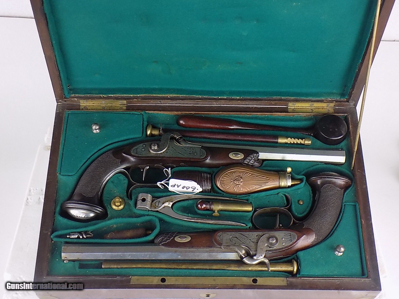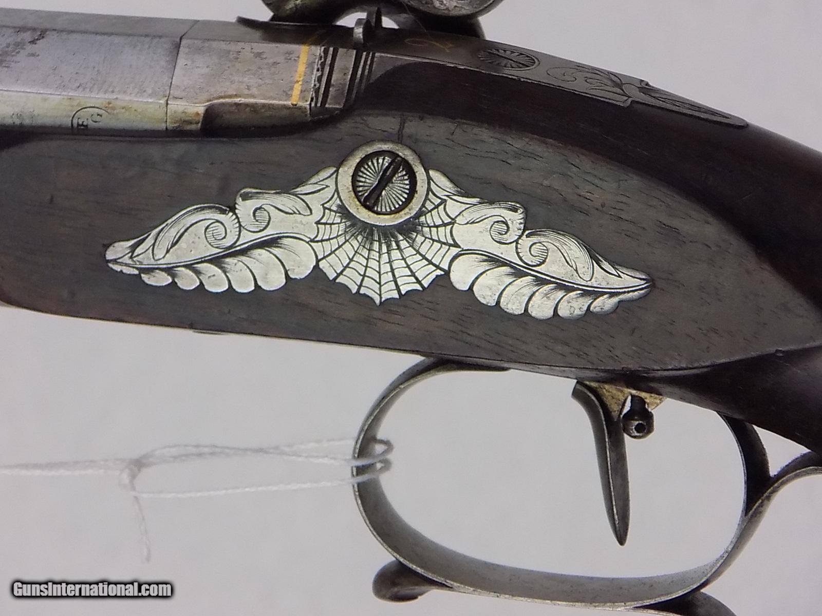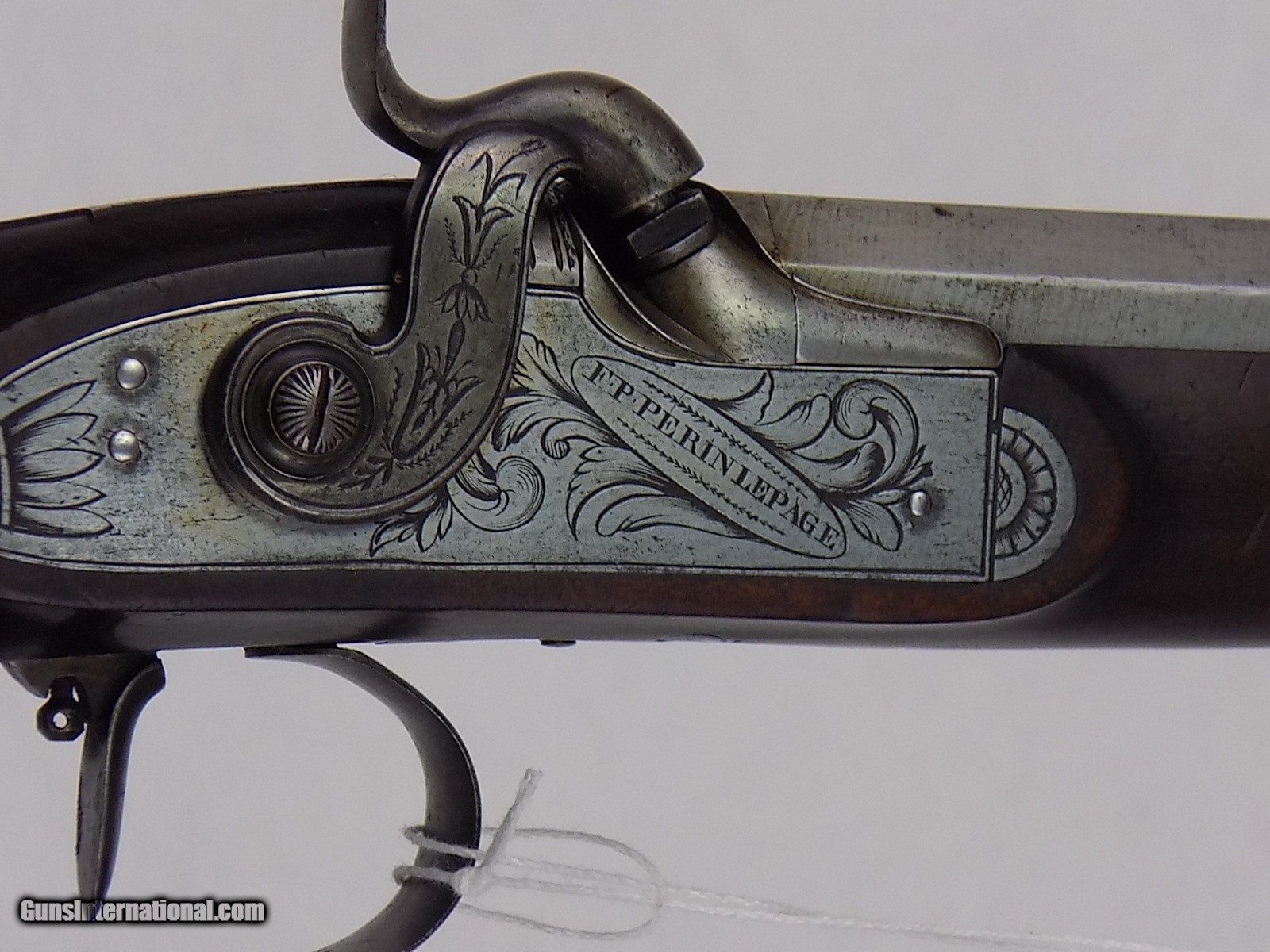 Description: #600AP CASED PAIR OF ENGRAVED F.P. PERIN LEPAGE PERCUSSION DUELING PISTOLS, with case & accessories, pistols are marked in gold 1& 2, engraved locks & furniture, single select trigger, spur trigger guard, lock engraved “F.P. Erin Lepage”, fine checkered grips, fine carved forend cap, open sights, VG bore, full set of loading tools & cleaning accessories, mold, powder flask, powder measure, brass ramrod, Rosewood cleaning rod, carved capbox, Rosewood mallet, bullets, etc., fitted walnut case with brass inlay in lid, very rare. $7500 SOLD Antique: Yes |
