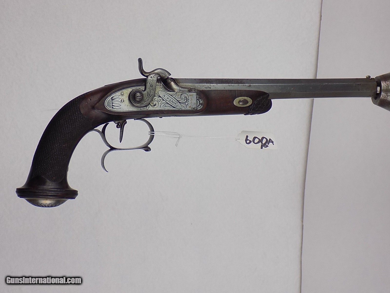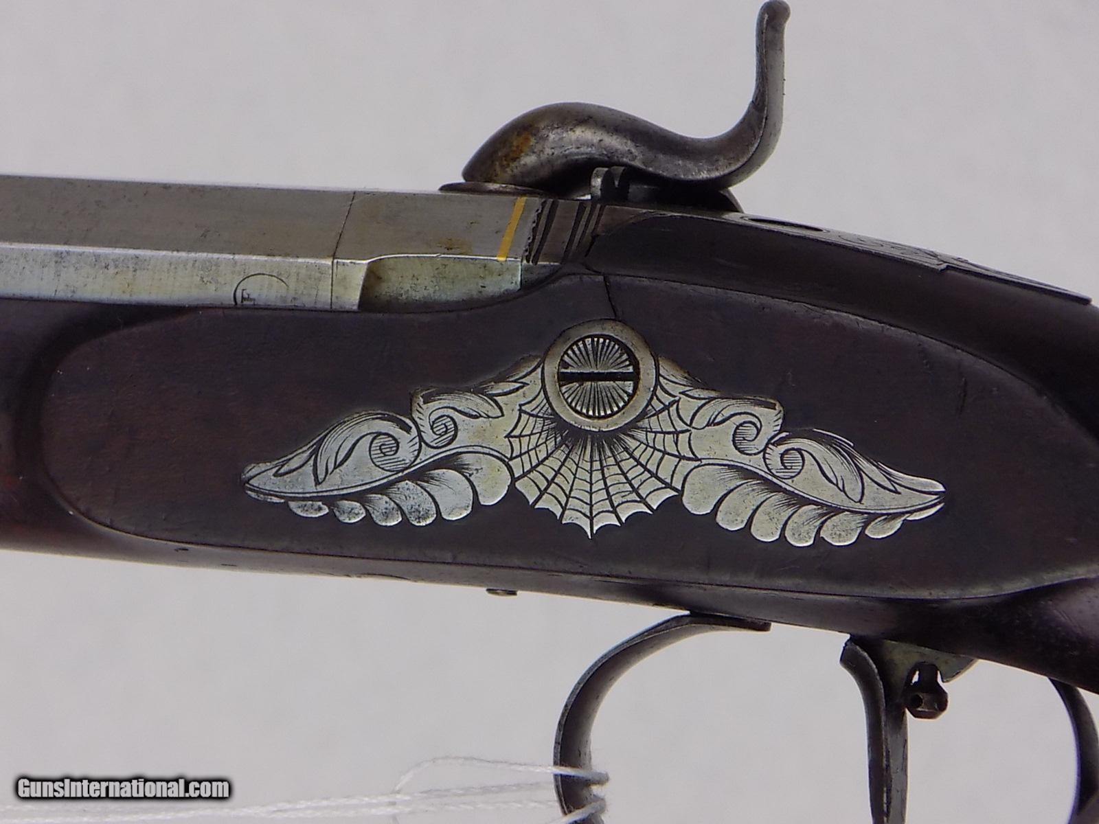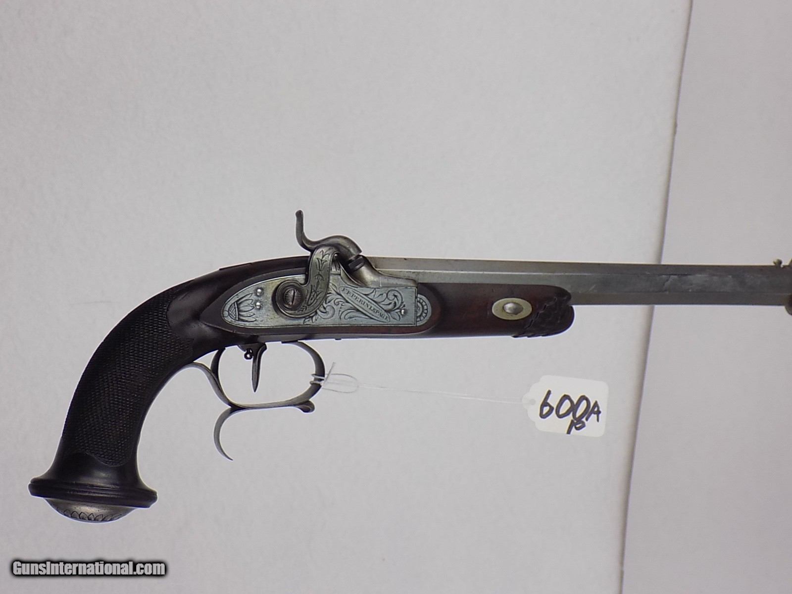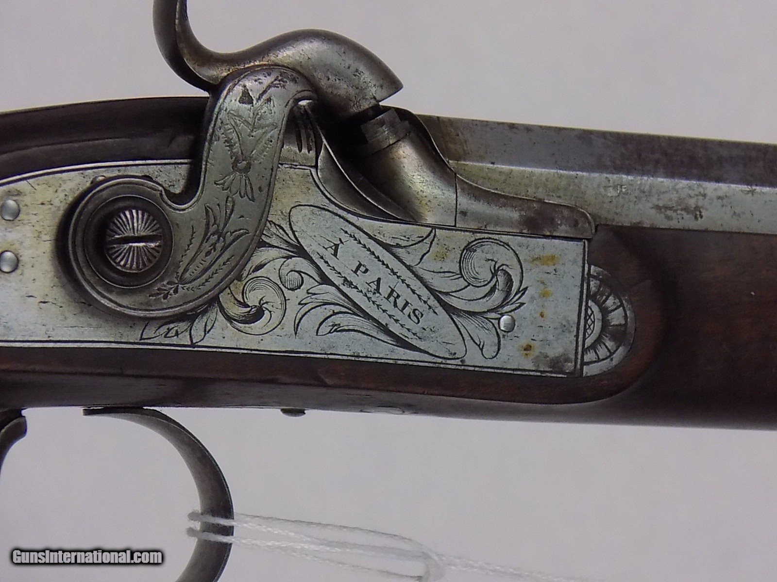 Description: #600AP CASED PAIR OF ENGRAVED F.P. PERIN LEPAGE PERCUSSION DUELING PISTOLS, with case & accessories, pistols are marked in gold 1& 2, engraved locks & furniture, single select trigger, spur trigger guard, lock engraved “F.P. Erin Lepage”, fine checkered grips, fine carved forend cap, open sights, VG bore, full set of loading tools & cleaning accessories, mold, powder flask, powder measure, brass ramrod, Rosewood cleaning rod, carved capbox, Rosewood mallet, bullets, etc., fitted walnut case with brass inlay in lid, very rare. $7500 SOLD Antique: Yes |