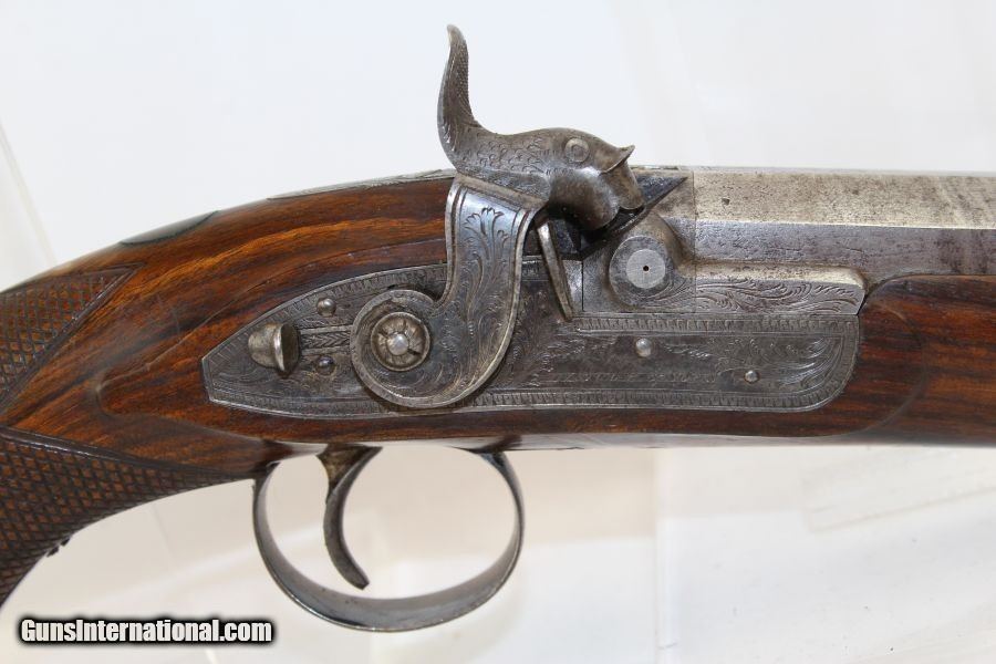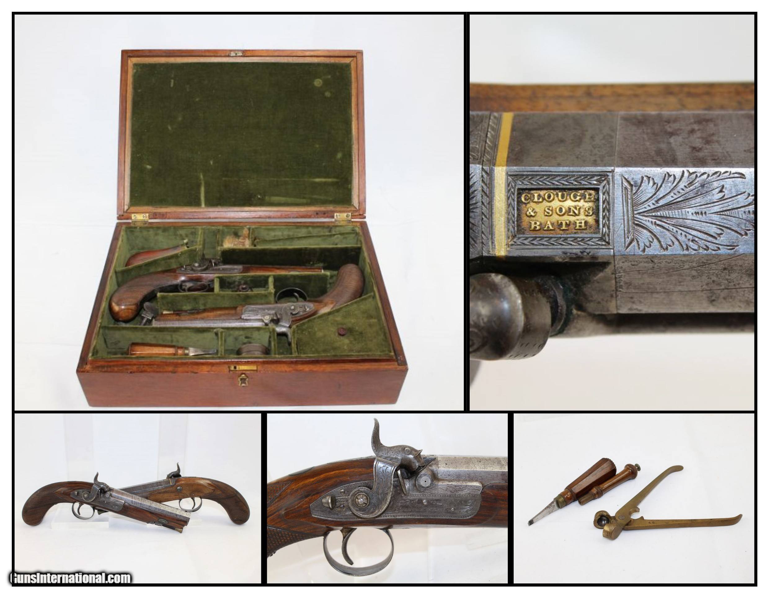 Description: Matched, Cased English CLOUGH & SONS DUELERS Mid-19th Century Pistols in Fitted Case Here we present an antique Cased Pair of Clough & Sons Dueling Pistols, made circa the 1850s in Bath, England. The Cloughs put out some fine weaponry and these matched pistols are no exception. They are quality through and through. The family business of gunmaking began circa 1812 and continued within the family until about 1940, at which time the business was sold to another gunmaking family, Gallyon & Sons, whose claim to gunmaking goes back to 1784. John Clough Senor had a shop on Southgate Street in Bath as late as 1846. In 1852 the business was running under the name Clough & Sons, as his oldest son Thomas had completed his apprenticeship and John Jr. was also learning the art of gunmaking. Upon their father’s death in 1860, the brothers changed their business name to Clough Brothers and moved to 9 Bond Street. This gives us a fairly short window for these pistols, marked Clough & Sons, to have been made. Each pistol features a gold-banded Damascus twist barrel marked on top with the family trademark “CLOUGH/& SONS/BATH” in gold. The barrels are octagonal and the smooth bores measure .53 caliber, true manstoppers built for the purpose. The front sights are beads and rear sights are notched. The locks are also marked “CLOUGH & SONS” and finely engraved, along with the barrel tangs and trigger guards. The stocks are finely hand checkered. The ramrods are tipped with brass. The case is fitted specifically for these pistols and include cast lead balls, powder flask and tools. The case itself is lined in green velvet. This is a high quality & classy set that was made for the higher end customer in the mid-19th Century. The overall condition is near fine. The barrels retain their Damascened twist pattern and gold embellishments. The markings are clear and the engravings are sharp. The stocks are in fine shape. The bores are smooth. The action is excellent on both pistols. Own the original! This is a legitimate antique and not a reproduction. Barrel is 5-1/2 inches. Caliber: .53 Overall condition as seen in photos. Very Fast. Very Safe. FREE SHIPPING WORLDWIDE. Delivered directly to your door by express mail! Guaranteed AUTHENTIC & Includes CERTIFICATE OF AUTHENTICITY. ancestryguns $7850 #8062 SOLD Antique: Yes |