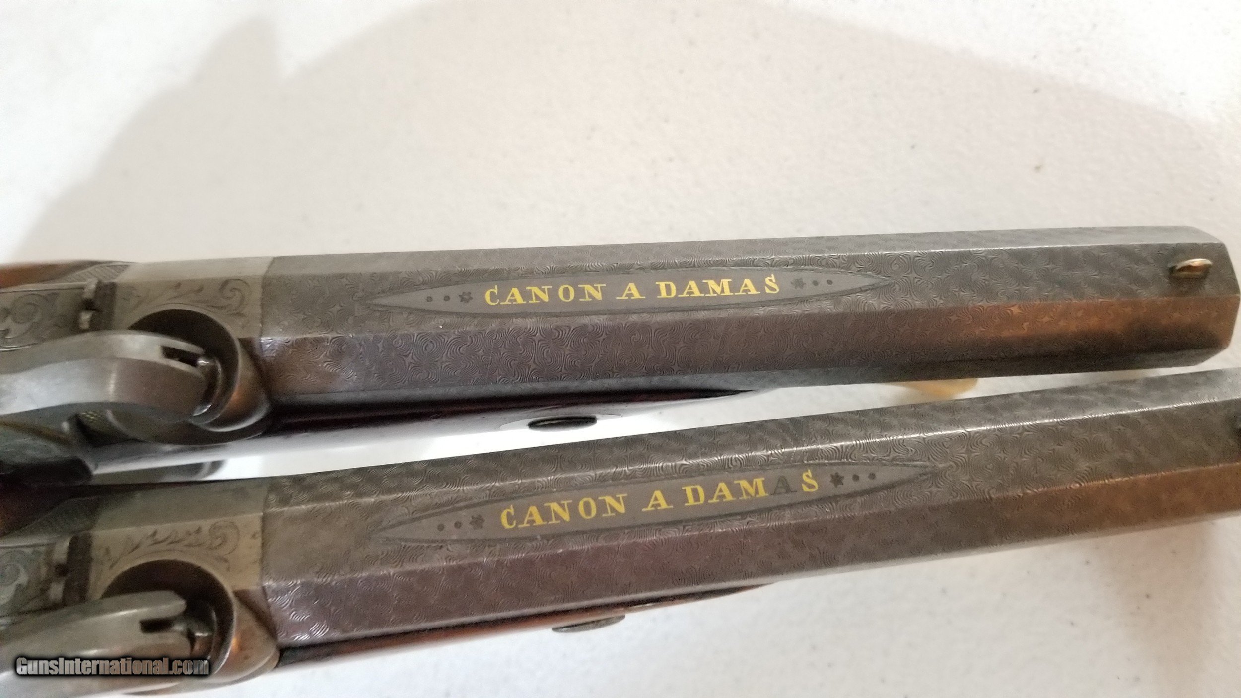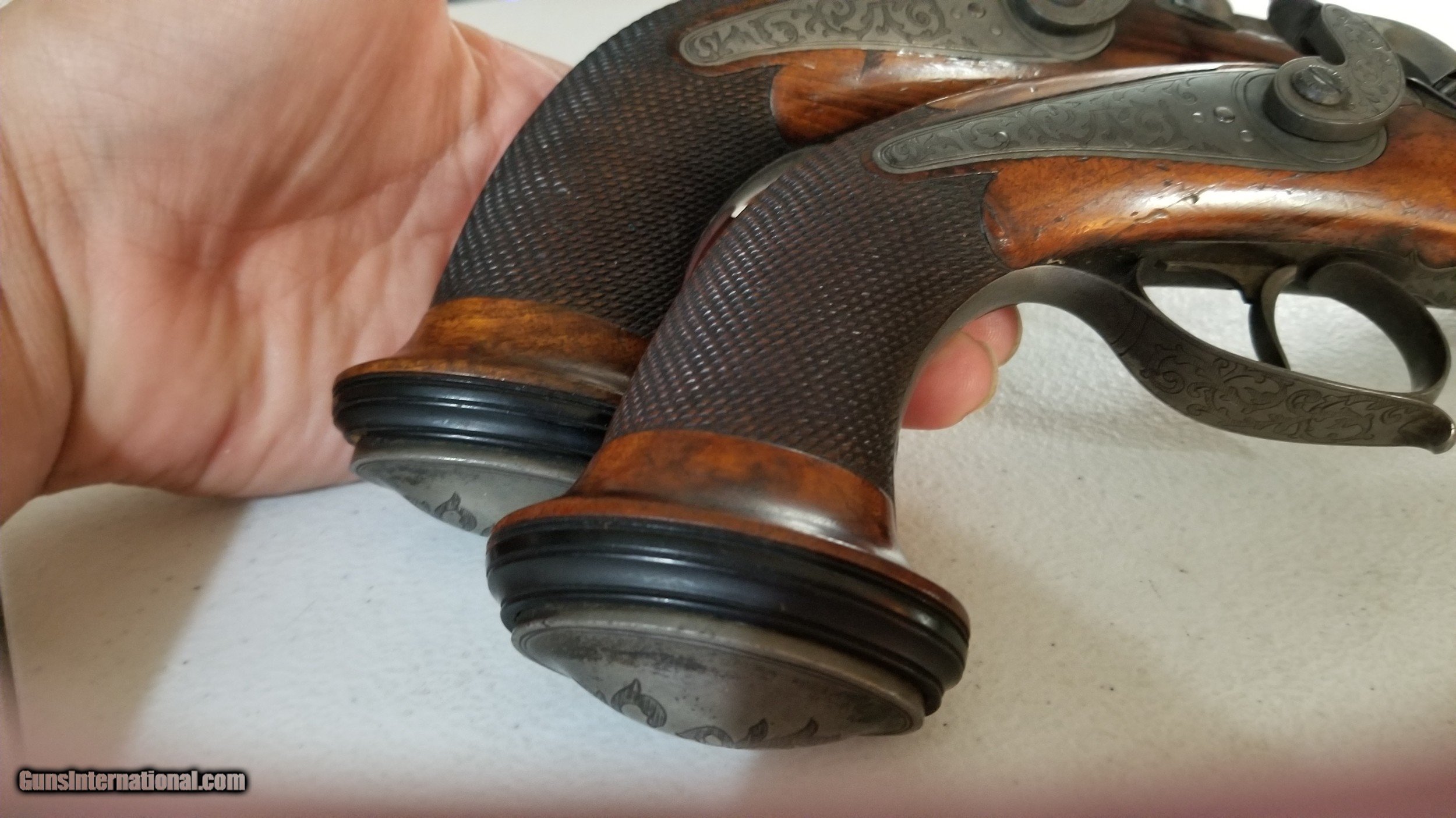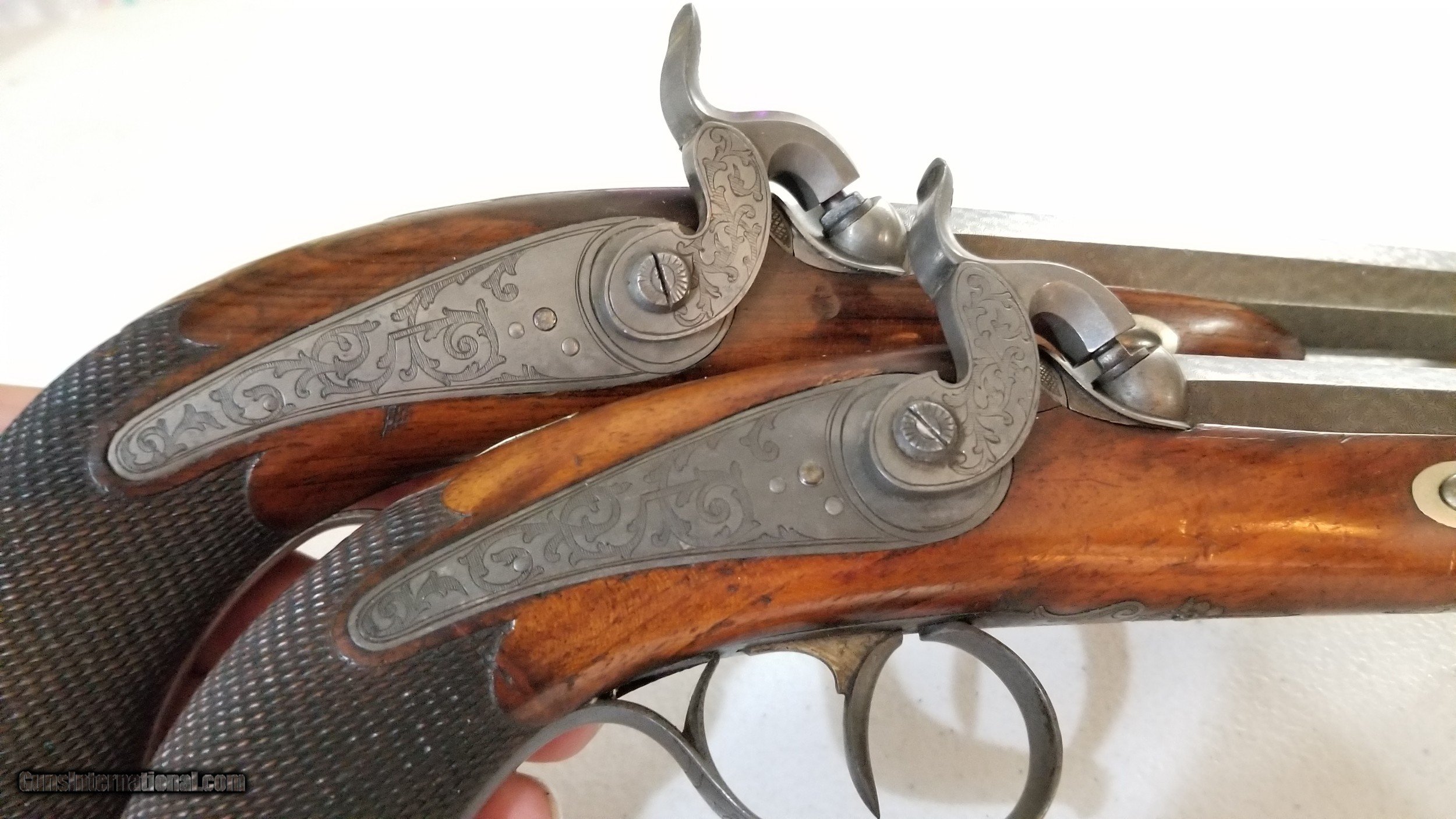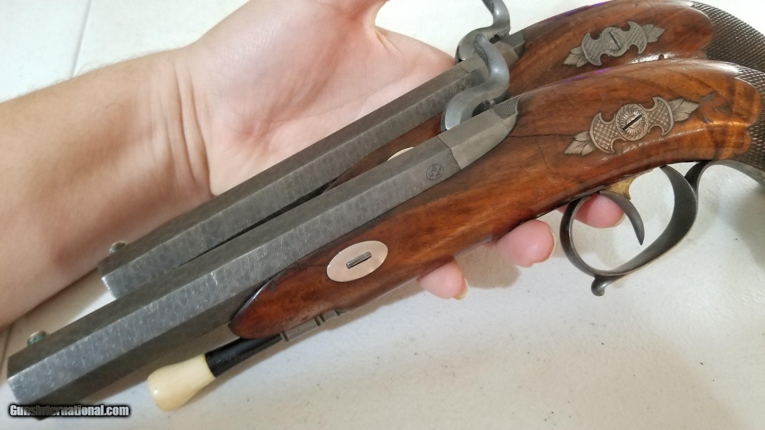 Description: Pair of Engraved Belgain .61 Cal Percussion Dueling / Target Pistols. Barrels are 5-13/16 inches. Wonderfully engraved, marvelous damascus octogon barrels w/ hand cut microgroove type rifling. One has fancy wood stock, while the other is more mundane, both have matching original finish on wood. They have carved Ebony and engraved butts. Both are marked "Canon A Damas" which inidcates the damasus barrel, and both are marked with a visable the Belgain Proof mark on barrel. They each have an ebony & ivory ramrod, each with different tools attached at ends. Both have a little german silver shield a top of the grip. The one with the fancy wood stock has 3 visible hairline cracks, while the other has non. Both ramrods have been repaired. Overall condition is around 80-85%. Feel free to ask questions. Shipping will be free for this listing. Comes from an estate in Wichita Falls, TX. Offers will be considered. SOLD Antique: Yes Serial Number: none Caliber Info: 61 Bore: 20 Condition: 83% Metal Condition: 85% Wood Condition: 75% Bore Condition: 90% Action: Percussion Manufacture Date: C. 1840's |