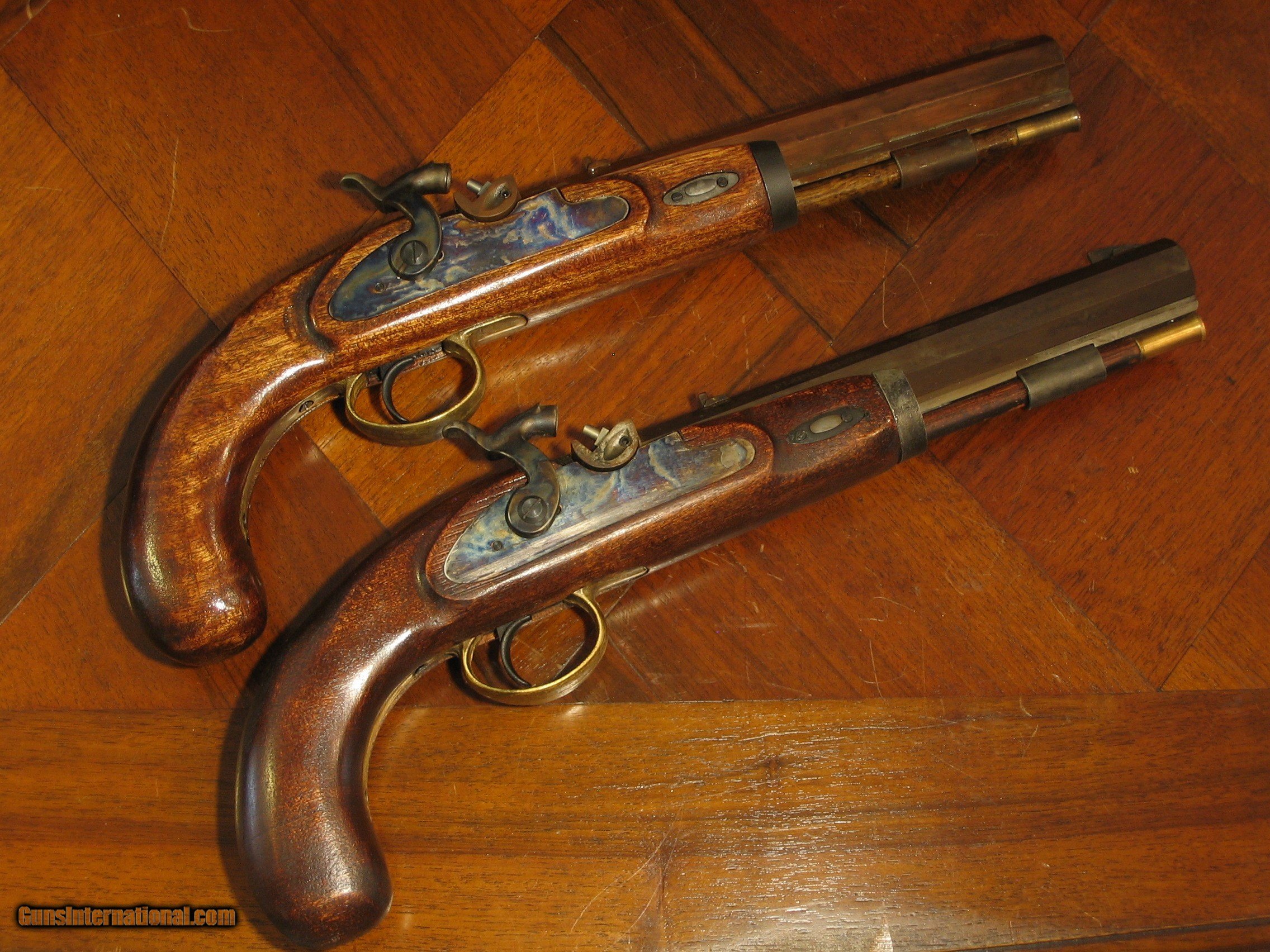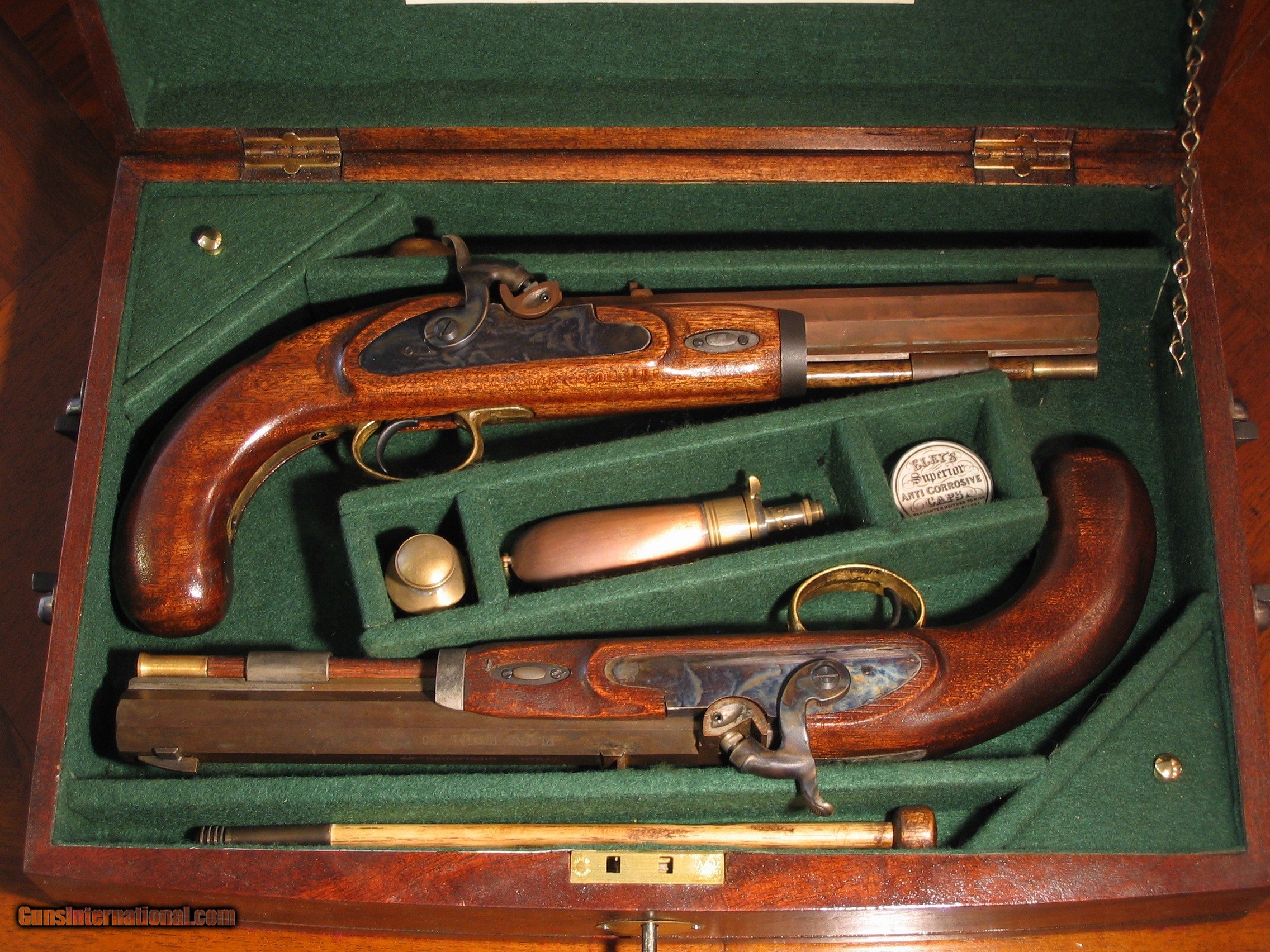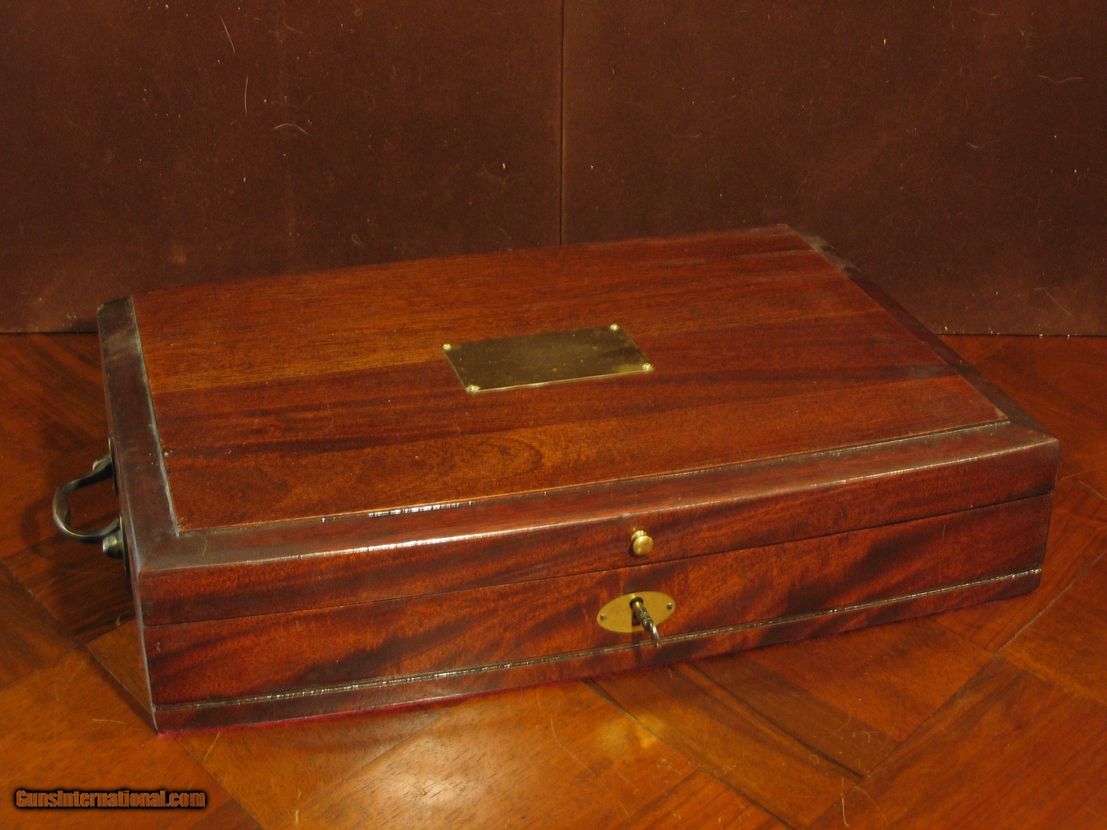 Description: This is an Antique Recreated ca. 1845 .50 Cal. Percussion Black Powder Muzzeloader English Gentleman`s Dueling Pistol Cased Set. It is housed in a 17"x 12"x 3.5 Mahogany Case weighing about 10 lbs. The pistols have rickly stained Walnut Stocks, blackened iron furniture and Browned 9" 1 in 30" twist barrels which makes them extremely accurate. They are unfired. This is similar to a cased dueling pistol set that every gentleman should have displayed in his library. These pistols are adapted from Lyman Plains pistols, the finest replica pistols made. This cased set will be shipped to you in the U. S. only after your payment clears using PayPal. It can not be shipped to Canada or New Jersey. SOLD |