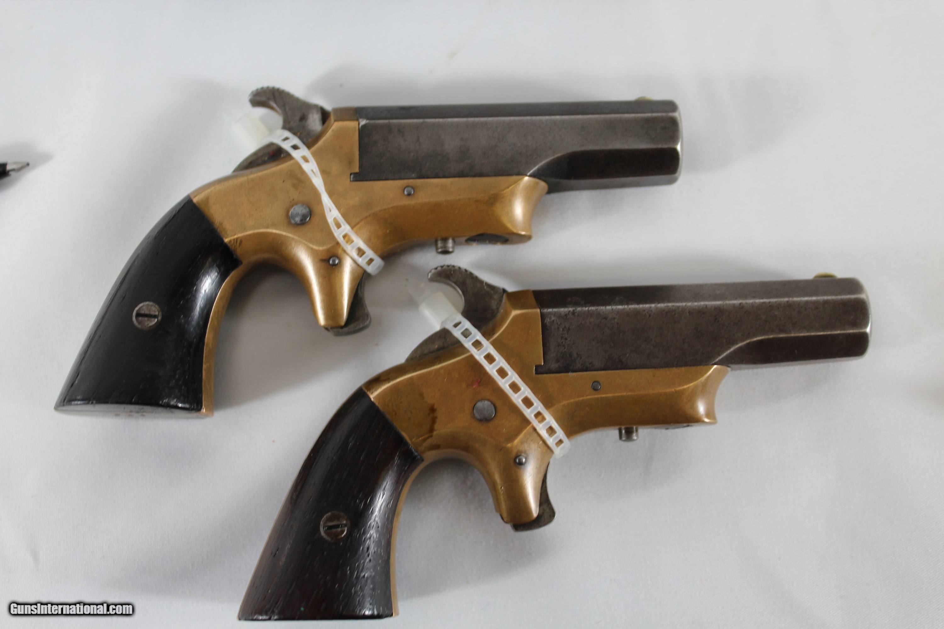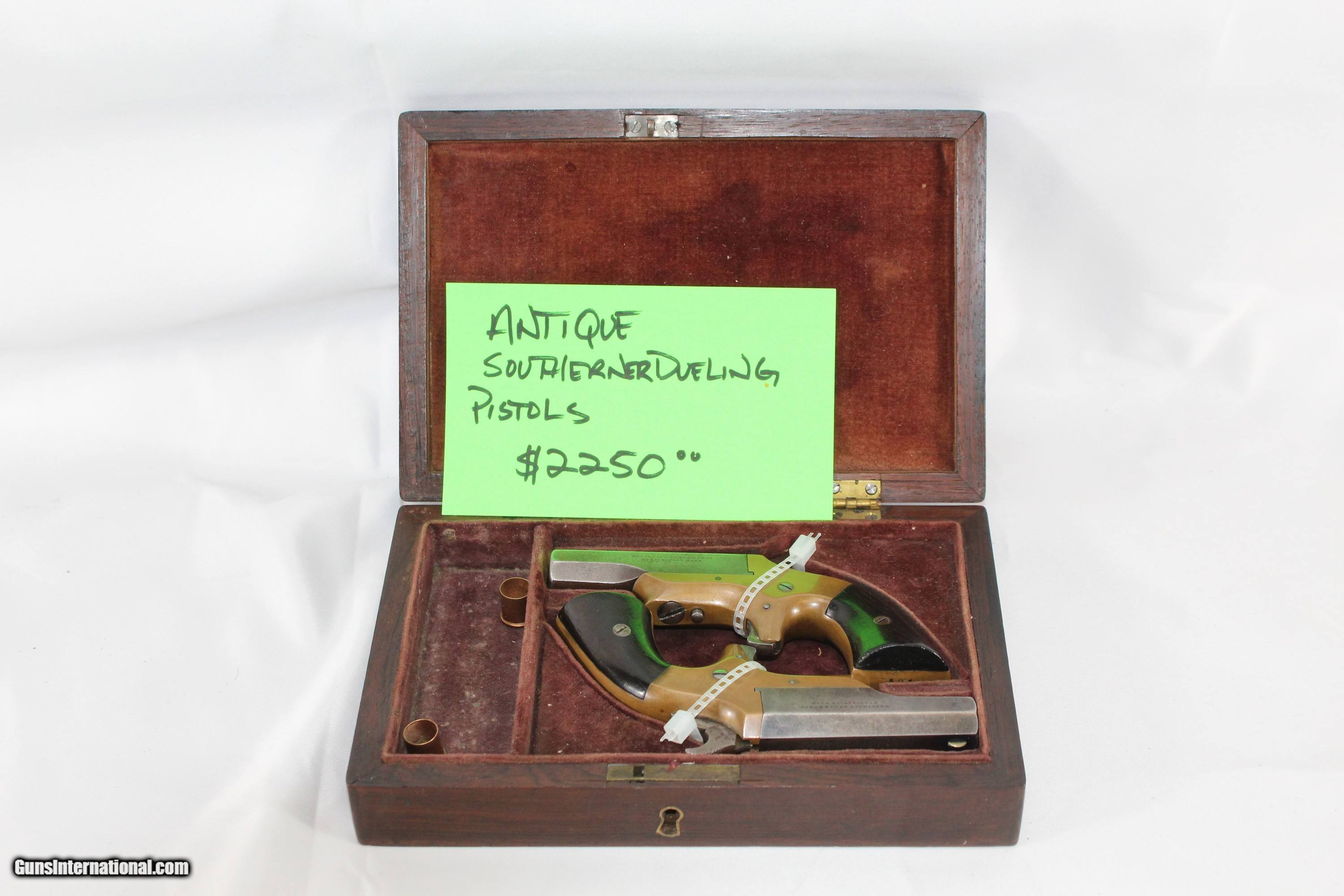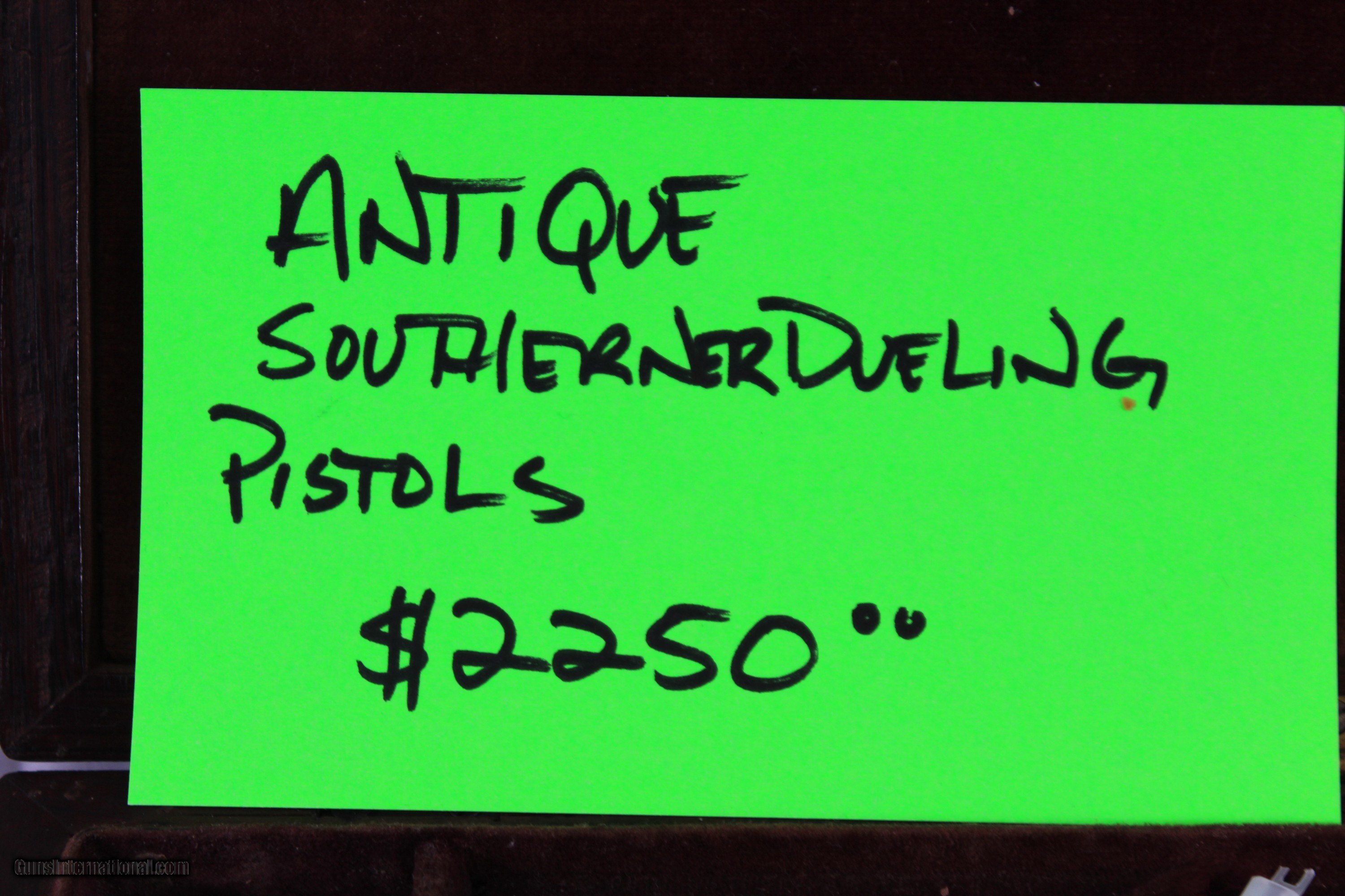 Description: Listed is a pair of Southerner Dueling Pistols in 41 Cal These are Antique pistols in their original box. Pistols are in excellent condition Price is $2250.00 + $50.00 Shipping and Insurance SOLD Handgun Caliber: .41 Rimfire Manufacturer: Southerner Model: Dueling Pistols Serial Number: NSN Barrel Length: 2 1/2 Condition: Excellent Metal Condition: Excellent Action: Single Action Case: Wooden Case |