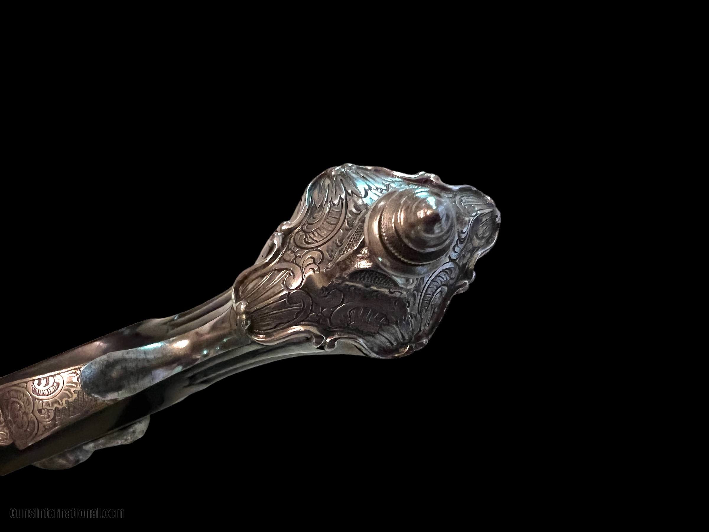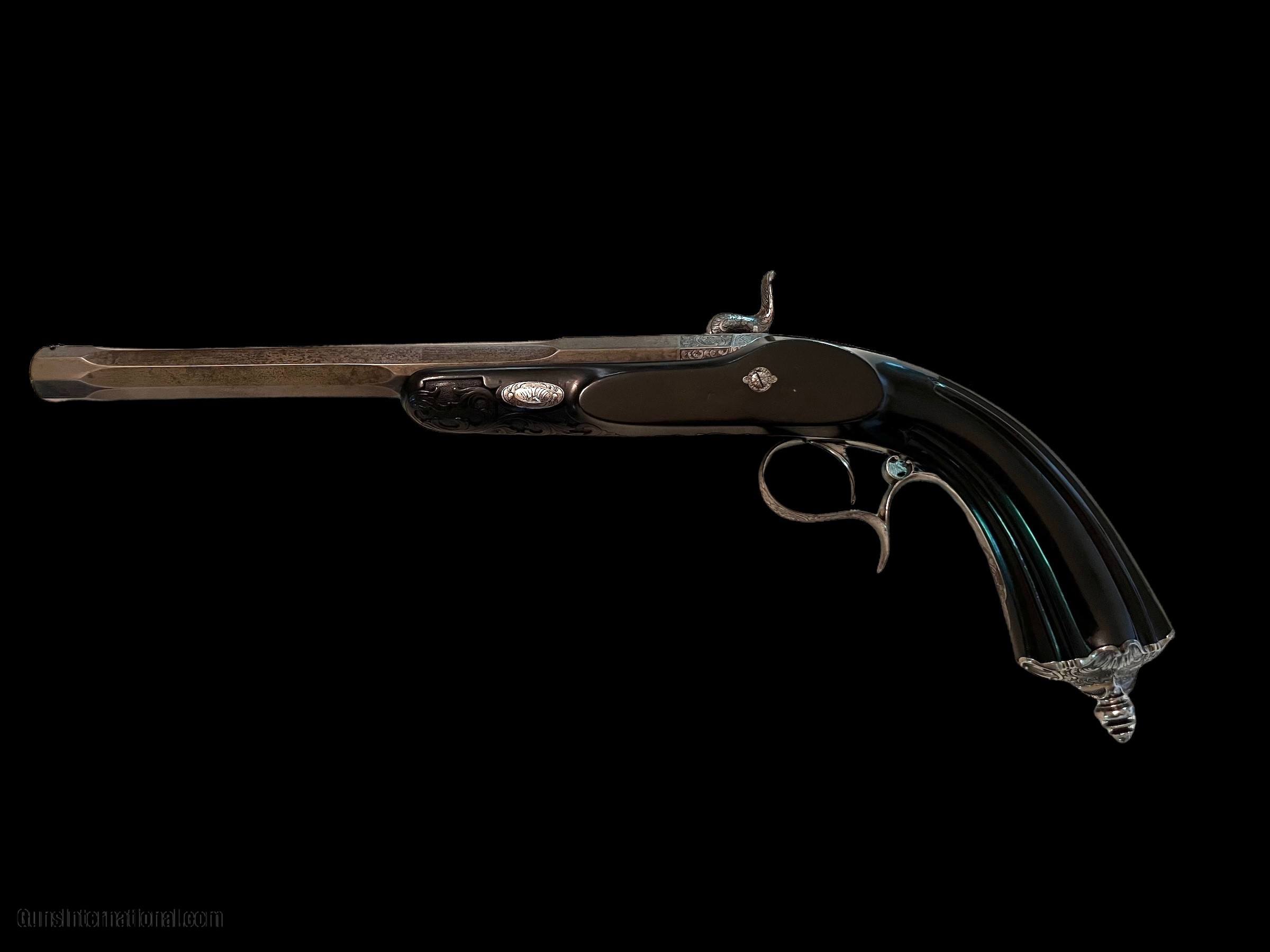 Description: Le Page Paris .50 caliber dueling/target pistol 9.5" barrel with excellent bore Stunning engraving and wood carving This pistol comes with bullets, wads, and loading tool. All you need to shoot it is powder. Le Page was gunmaker to the king of France and nobility and it shows in the quality of this pistol. Harrison sporting arms is always looking for quality firearms to buy and new consignments, layaway available on all of our guns. SOLD Antique: Yes |