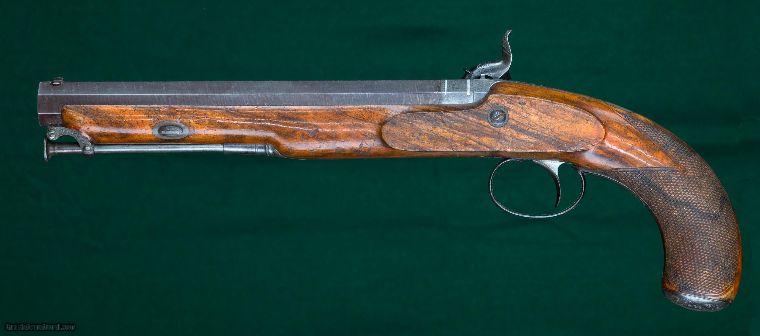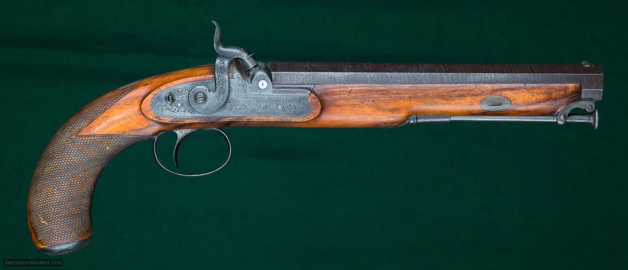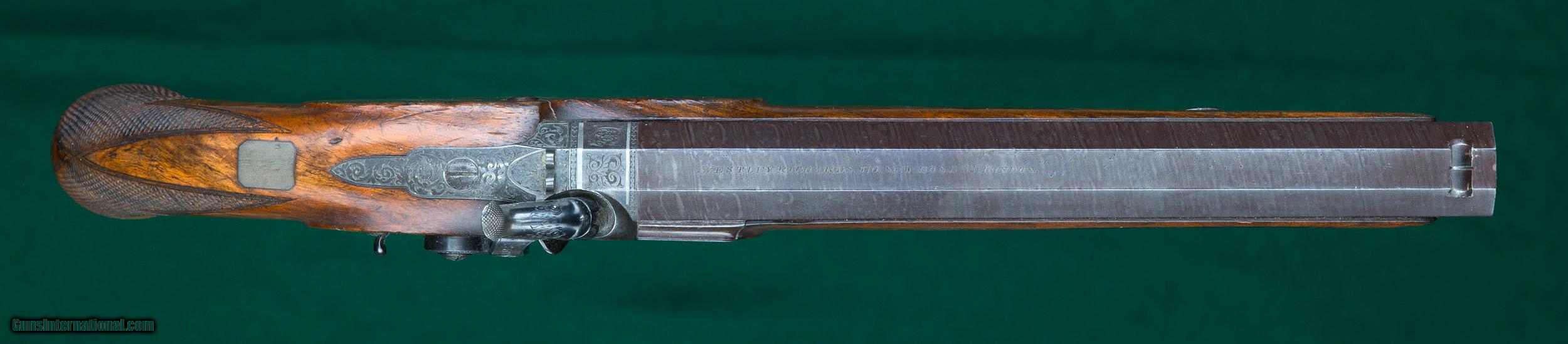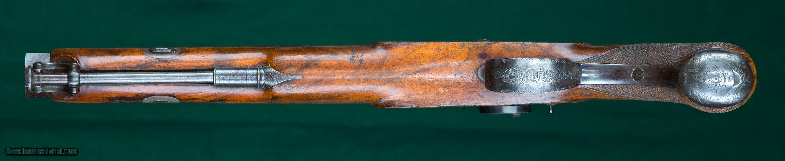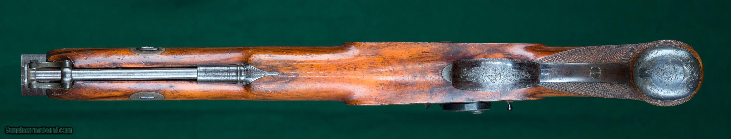 Description: 9" full-octagon, key-fastened, browned damascus smoothbore barrels with fine front blade sights, open rear sights and double-platinum-lined casehardened breechplugs. Walnut stocks, nearly to the muzzle with captive ramrods, long tang triggerguards, vacant silver escutcheons, checkered classic round butt grips with steel trapdoor gripcaps. Engraved sidelock actions with manual half-cock stalking safeties. Fine scroll engraved lockplates, breechplugs, standing breeches, triggerguards, and grip caps. Both serially-numbered identically. Fine condition, locks mostly grey but with crisp engraving, retaining 50% barrel brown and with very fine bores. SOLD Curio/Relic: Yes Antique: Yes |