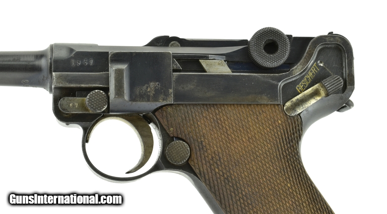 DMW Luger 9mm caliber pistol. DWM Manufactured date 1917. Excellent bore. Serial numbers are matching; except for the slide plate (which is 2 numbers off 69) magazine is numbered to gun. Grips are unnumbered, and correct for era. Approximately 95% blue with very good straw colors. Very good WWI German army issue Luger.