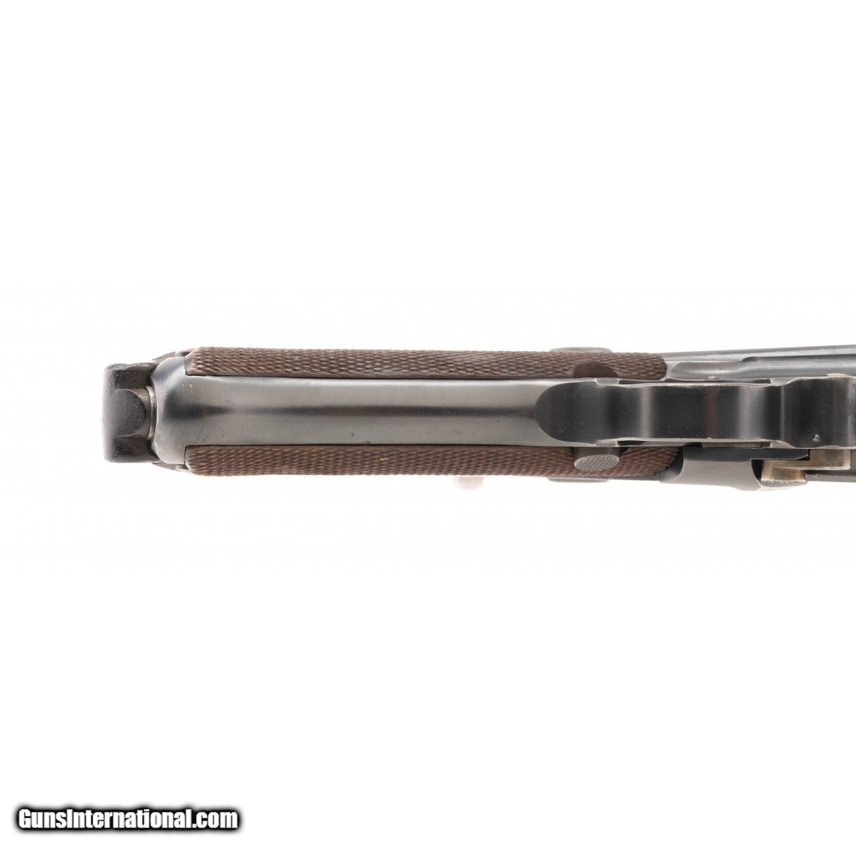 Description: " This WWI 1916 dated DWM military P08 Luger pistol is in fine condition. About 140,000 were made in 1916. The 4' 9mm barrel has a very good bore with frosting in the grooves. The gun retains approx. 98% blue and 95% straw. With the exception of the correct type unnumbered wood base magazine, all numbers, including the firing pin, and grips, match. The chamber is dated 1916 and the toggle has the DWM logo. The grips are excellent with sharp checkering. The action functions correctly. This is a desirable 1916 WWI DWM Luger in super condition. SOLD |