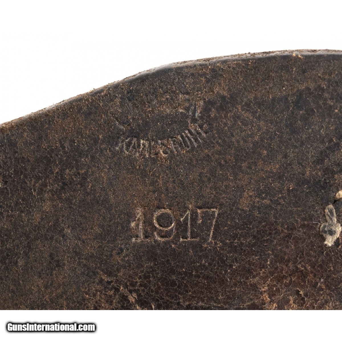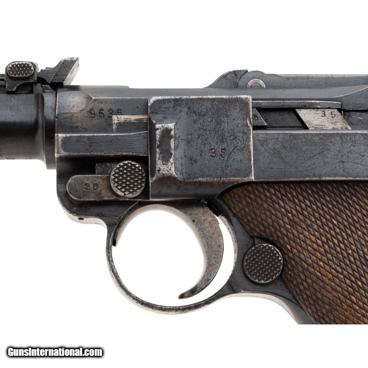 Description: " SN: 9635A. Manufactured in 1917, 9mm with a 7.9"" barrel. The bore is excellent. WWI German military pistol made by DWM. The serials are matching aside from the magazine. Has approximately 78% of its original finish, the grips are in very good condition with some handling wear. The front strap is unit marked ""184.R.4."". Overall good to very good condition. Comes with period correct wooden stock which is properly fitted and leather holster dated 1917 that is in good condition. (Consignment) SOLD Curio/Relic: Yes |