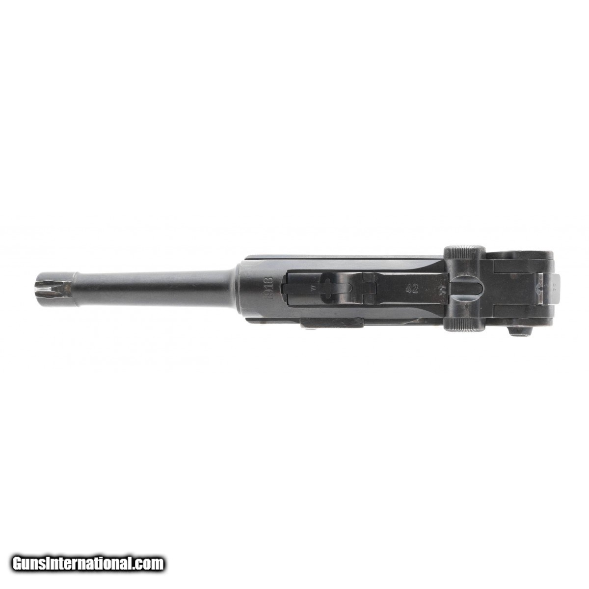 Description: " WWI Luger dated 1918 manufactured by DWM. Serial numbers are non-matching and has some parts from WWII. Bottom of barrel is import marked. Bore has strong rifling with frosting. Magazine is a post war replacement. Metal has a thinning blue turning to patina. Side plate has some pitting. Fair overall condition. Reasonably priced. SOLD Curio/Relic: Yes |