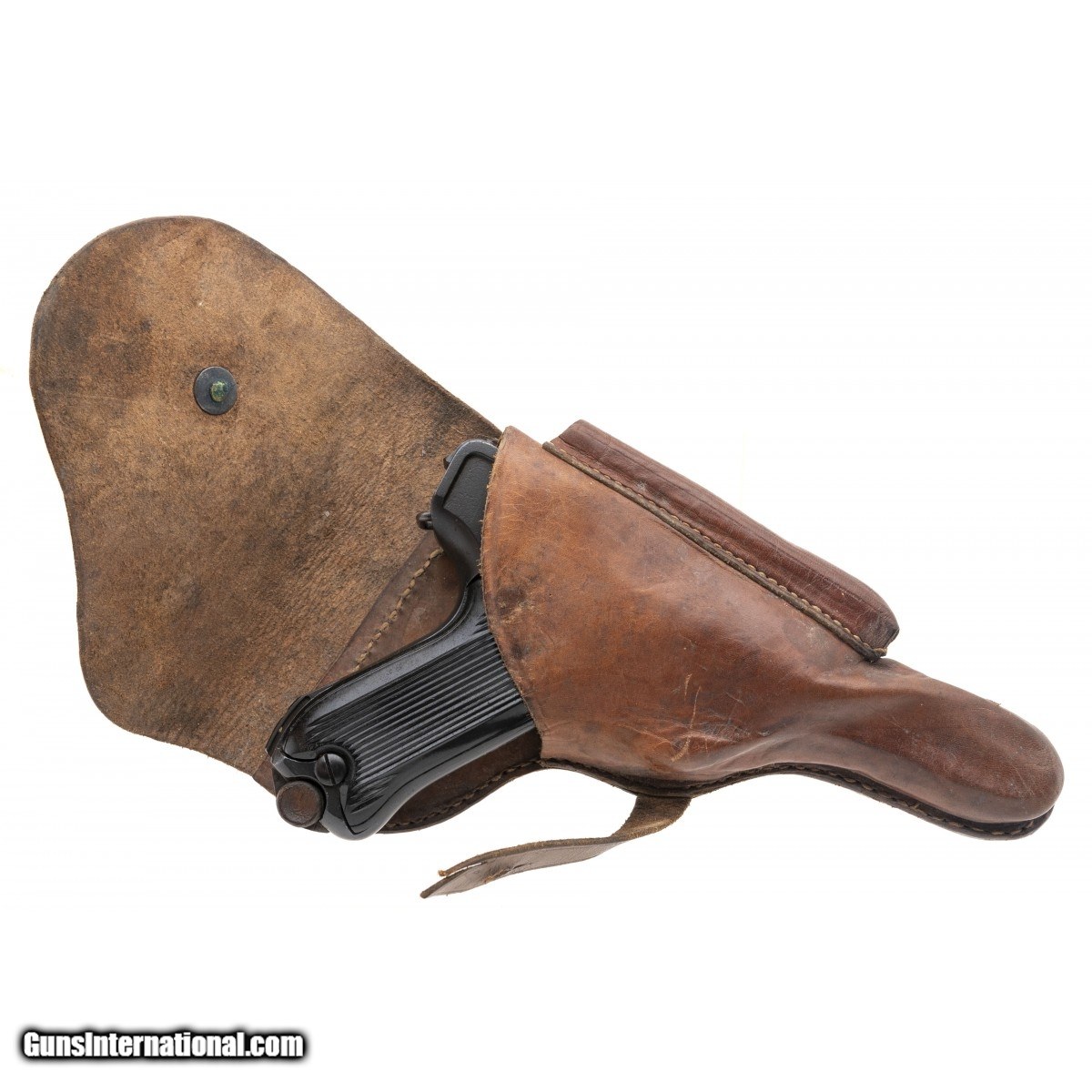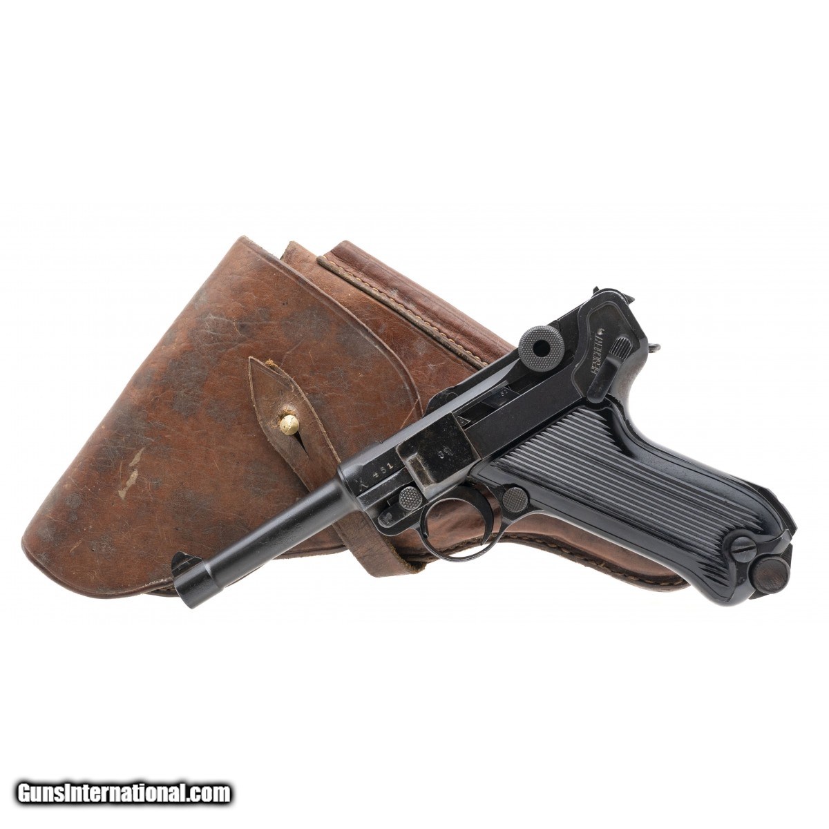 Serial No. 451A, made in 1920 by DWM, .9mm, 4"" round import marked barrel. Finish has been arsenal redone. A large ""X"" is visible left side barrel flat indicating Russian Capture. Serial numbers are matching, bore is very good with strong rifling. Grips have been replaced, comes with an unmarked leather holster. Consignment