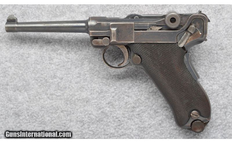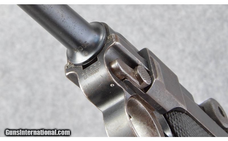 Description: DWM 1906 American Eagle Commercial chambered in 7.65 Para. No safety marking variation with matching numbers less replaced toggle assembly, grips and magazine. Stamped GERMANY under the frame serial number with Circle B proof on the barrel. Included flap holster offers no marking. .30 Luger/7.65mm Para. SOLD Metal Condition: "50-60% Bluing , Traces of straw colors, Edge wear Wood Condition: Fair Barrels: 4 3/4 Inch Triggers: "Single Action Auto, Wide Trigger Sights: Open Sights Item Location: Buda, TX |