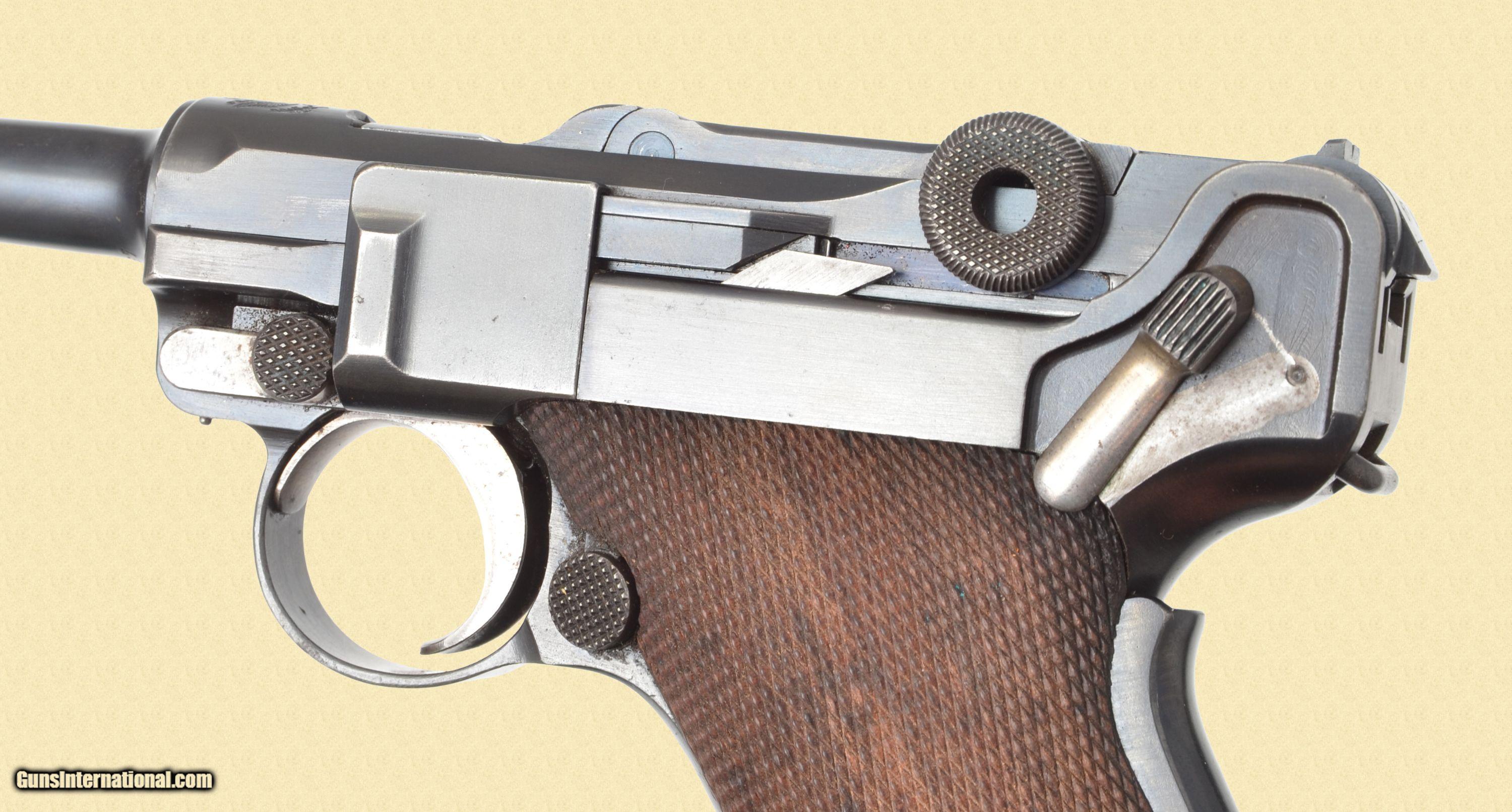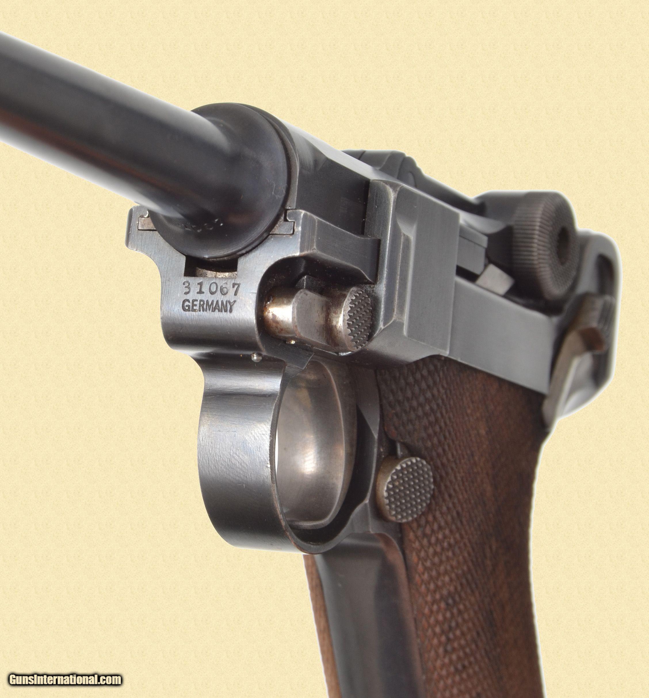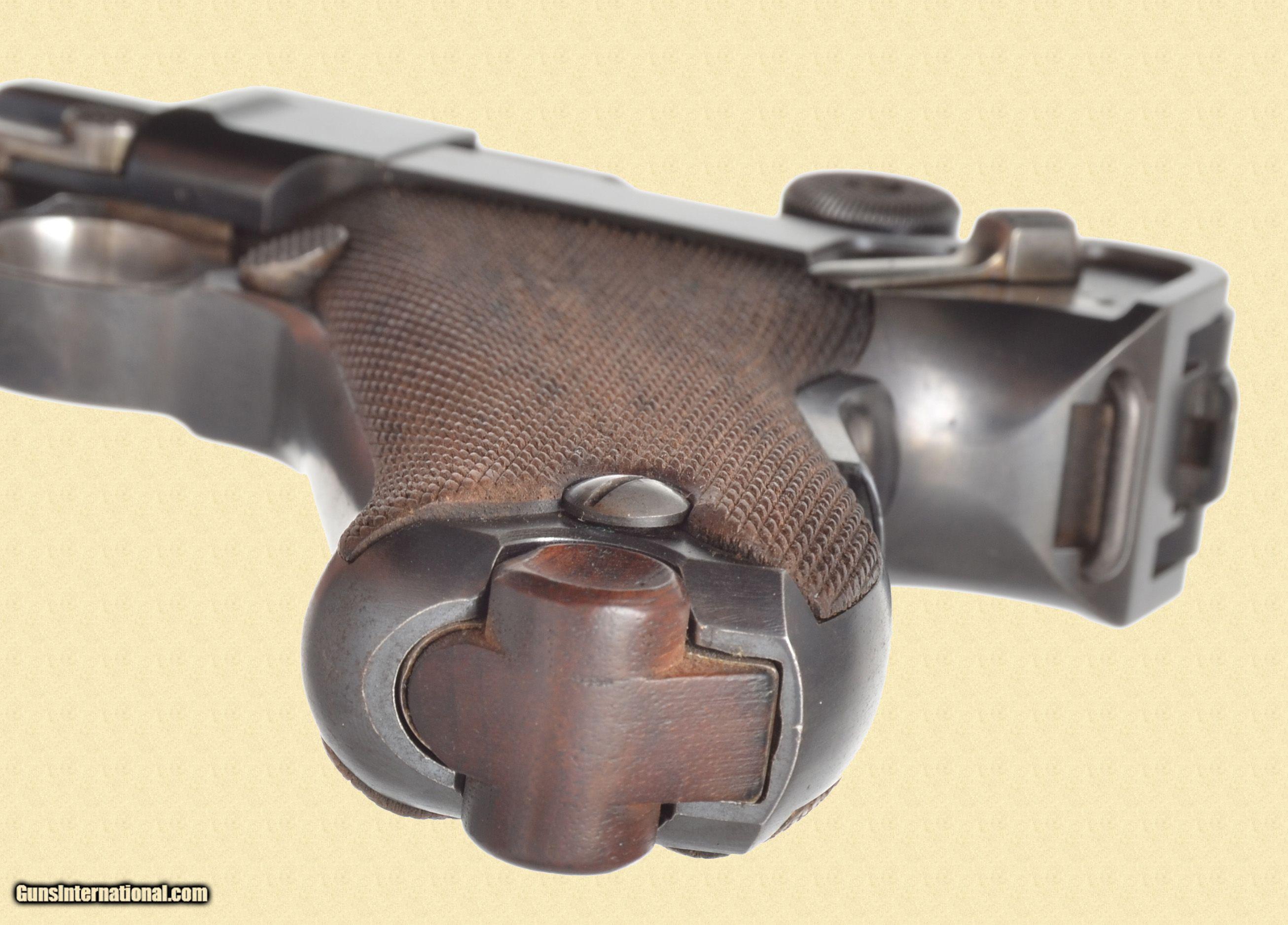 Description: 30 Luger; 94% blue, 60% straw, very good bore, very good grips, 4.75'' barrel, Original blue finish, strawed small parts and matching number checkered walnut grips. Complete with a proper variaiton unmarked wood bottom magazine. Stamped on top of the toggle with the DWM monogram and on top of the chamber with the American Eagle motif. The "GERMANY" export stamp appears across the front of the frame. Condition: The metal finish remains clean and uniform overall with some sharp edge and light high point holster wear. The straw color on the small parts is fading evenly, a bit more loss of color on the takedown lever. The fine checkered grips are fine showing minor wear. Mechanically fine, the bore is bright with strong rifling, showing some light corrosion along the grooves. C&R/FFL Please call (309)342-5800 Tues-Fri, 10 am -6pm (CST), or Sat 1pm-6pm (CST), for further information, or to purchase firearms. FEDERAL FIREARMS LICENSE (FFL): is required on all shipments of modern guns. We must wait for a copy from your dealer before we can ship to them. We will also ship C&R eligible firearms to Curio and Relic (C&R) license holders. We accept your signed, legible FFL and C&R licenses via fax at 309/ 342-5730 (always on), email at FFLsimpsonltd or through the mail at Simpson Ltd; 140 S Seminary St; Galesburg, IL 61401. Pre-1898 firearms and non-firearms items are exempt from licensing requirements. All items shipped to an Illinois address will be charged 8.75% sales tax. NOTE: Because of recent shipping restrictions and charges placed on us by UPS and FedEx (handguns must ship via next day or 2nd day air and they have added a $10 surcharge for parcels over 48”. Our return policy lasts a maximum of 3 days from the time you receive your item. If 3 days have passed since you received your purchase, and we have not been contacted by you, unfortunately, we can’t offer you a refund or exchange. If you are not happy with your purchase, please contact us by phone and/or email to arrange for a return. Items must be shipped back to us to arrive with 7 days of notification of return. SOLD Curio/Relic: Yes Serial Number: 31067 |