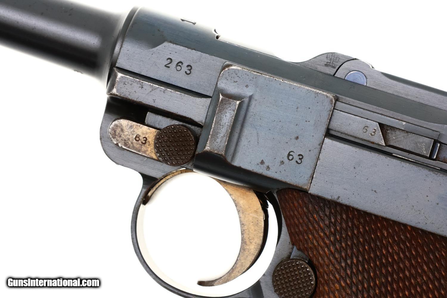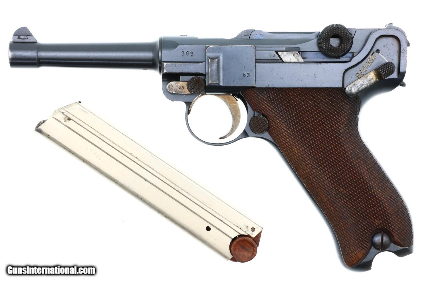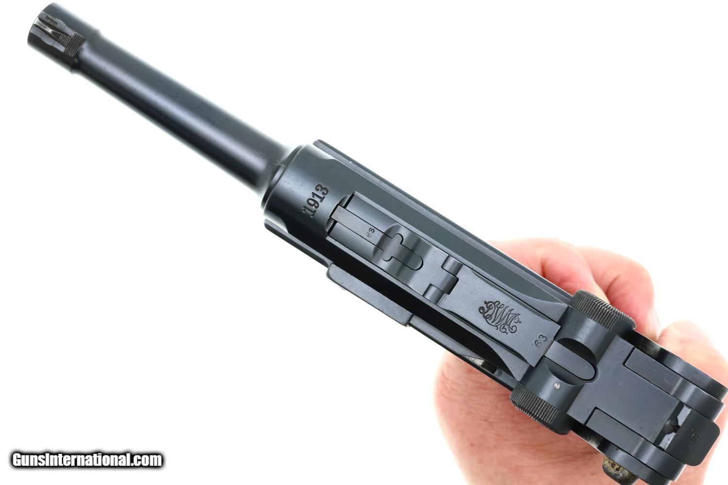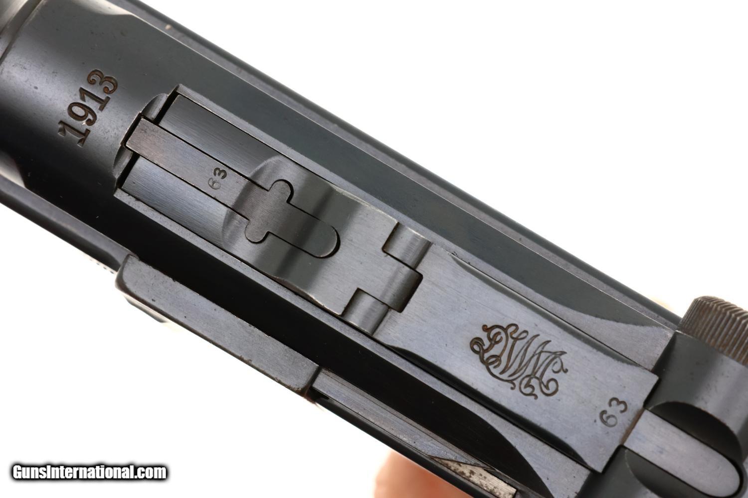 Scarce, MILITARY configuration DWM Luger, made in 1913, cal: 9mmP, with no hold-open, no stock lug, and military acceptances on the right side of barrel extension. Rust blued major components and strawed small parts. Four inch bbl with drift adjustable front sight and V-notch rear sight. Receiver dated "1913" with intertwined DWM on the middle toggle link. Full serial number “263a” on forward frame and under barrel, "263" on left side of barrel extension, and “63” repeated on all small parts including both panels of the checkered walnut grips. Tinned magazine with unmarked wooden plug. The 1913 DWM Luger represents a transitional period to the standard configuration, with hold-open and stock lug, that served throughout the First World War.