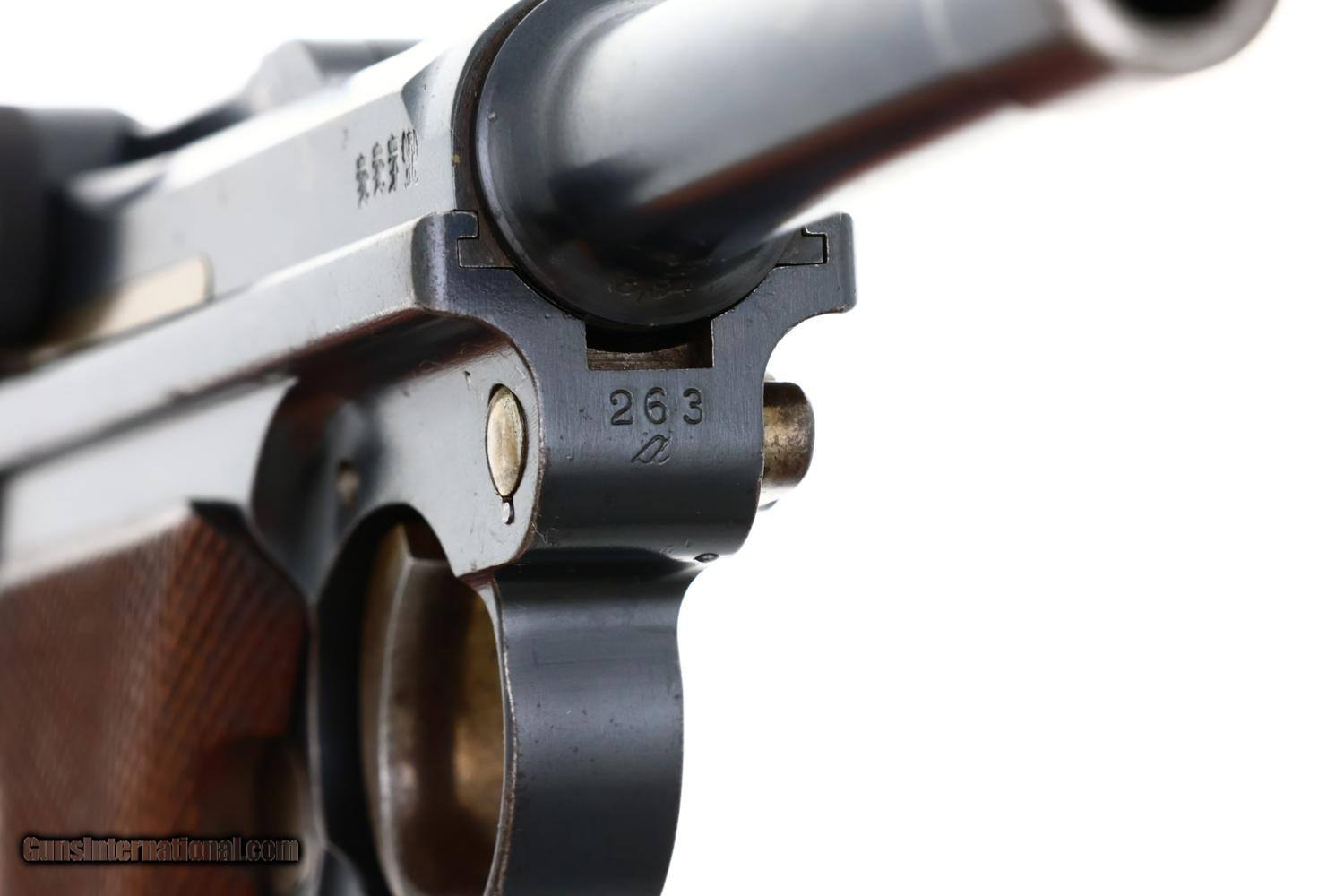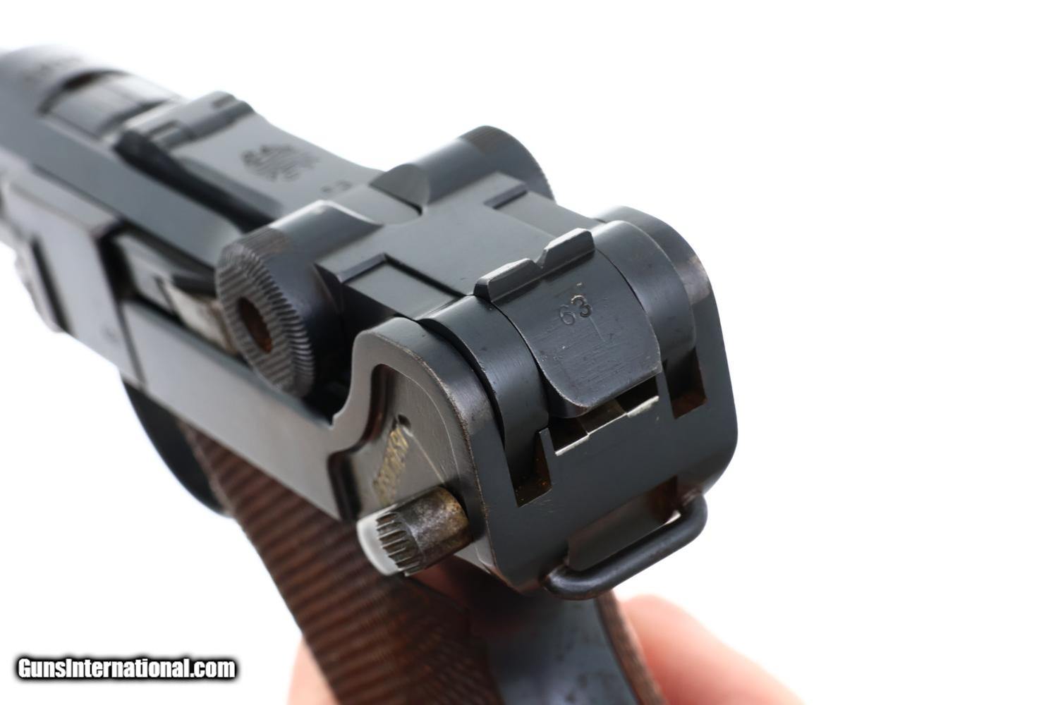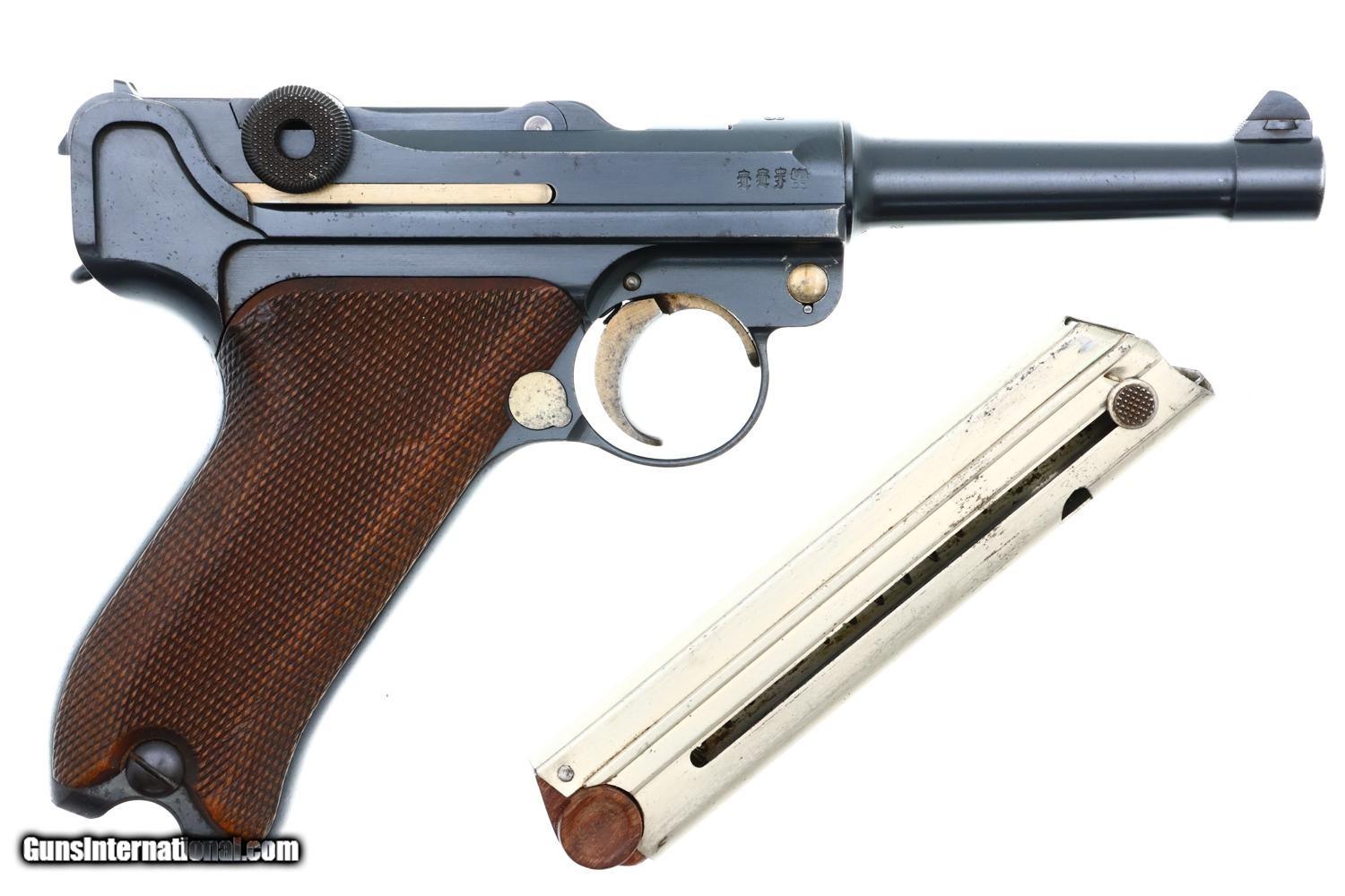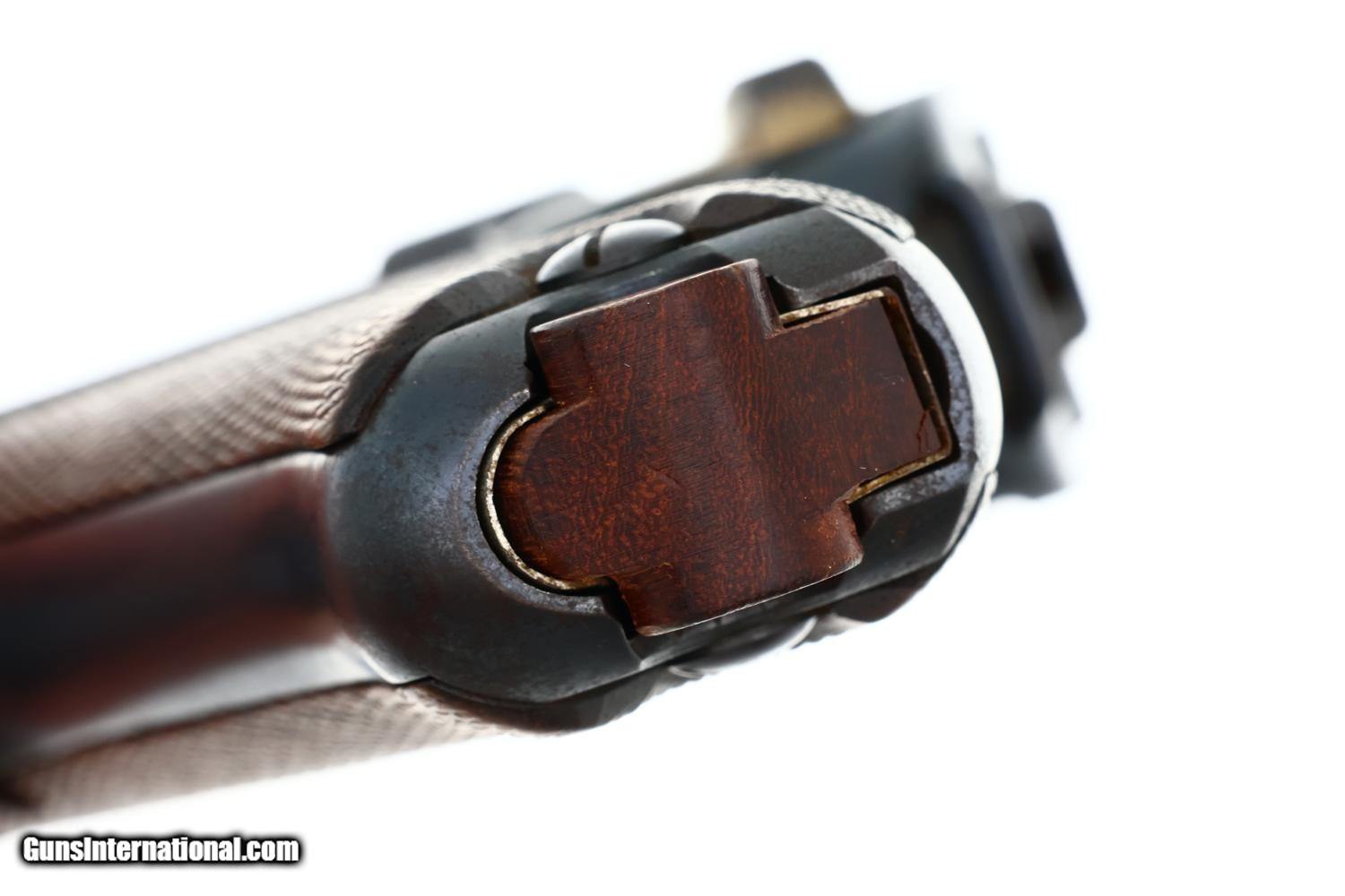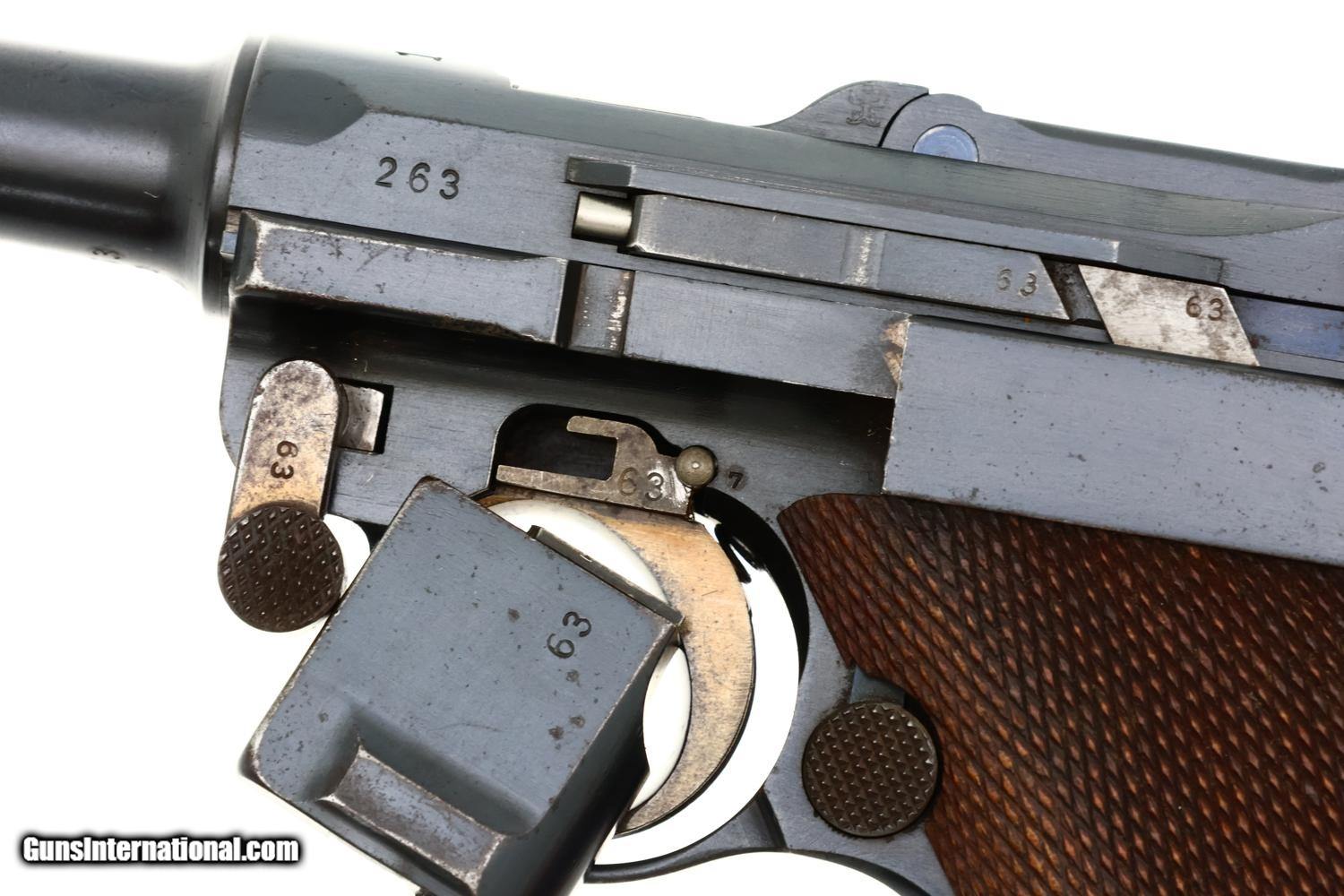 Scarce, MILITARY configuration DWM Luger, made in 1913, cal: 9mmP, with no hold-open, no stock lug, and military acceptances on the right side of barrel extension. Rust blued major components and strawed small parts. Four inch bbl with drift adjustable front sight and V-notch rear sight. Receiver dated "1913" with intertwined DWM on the middle toggle link. Full serial number “263a” on forward frame and under barrel, "263" on left side of barrel extension, and “63” repeated on all small parts including both panels of the checkered walnut grips. Tinned magazine with unmarked wooden plug. The 1913 DWM Luger represents a transitional period to the standard configuration, with hold-open and stock lug, that served throughout the First World War.
