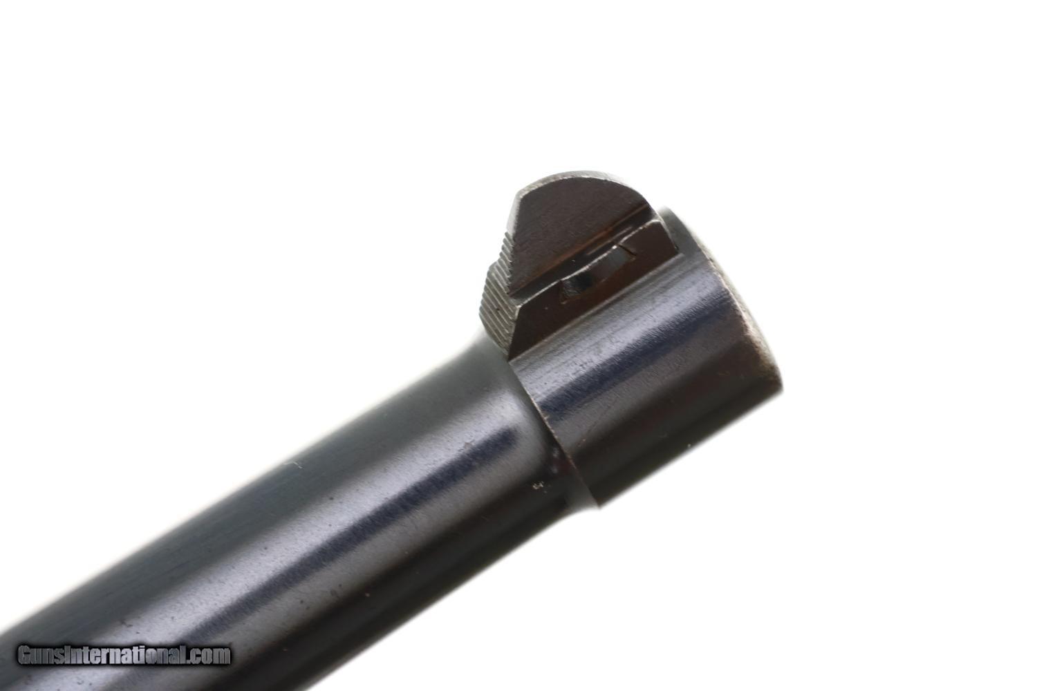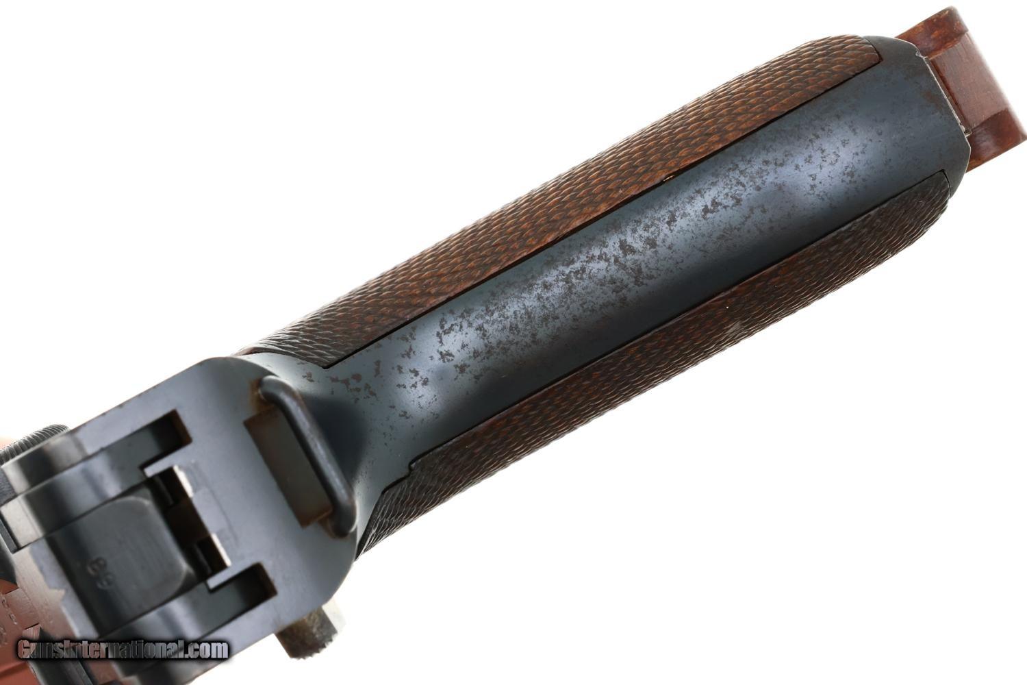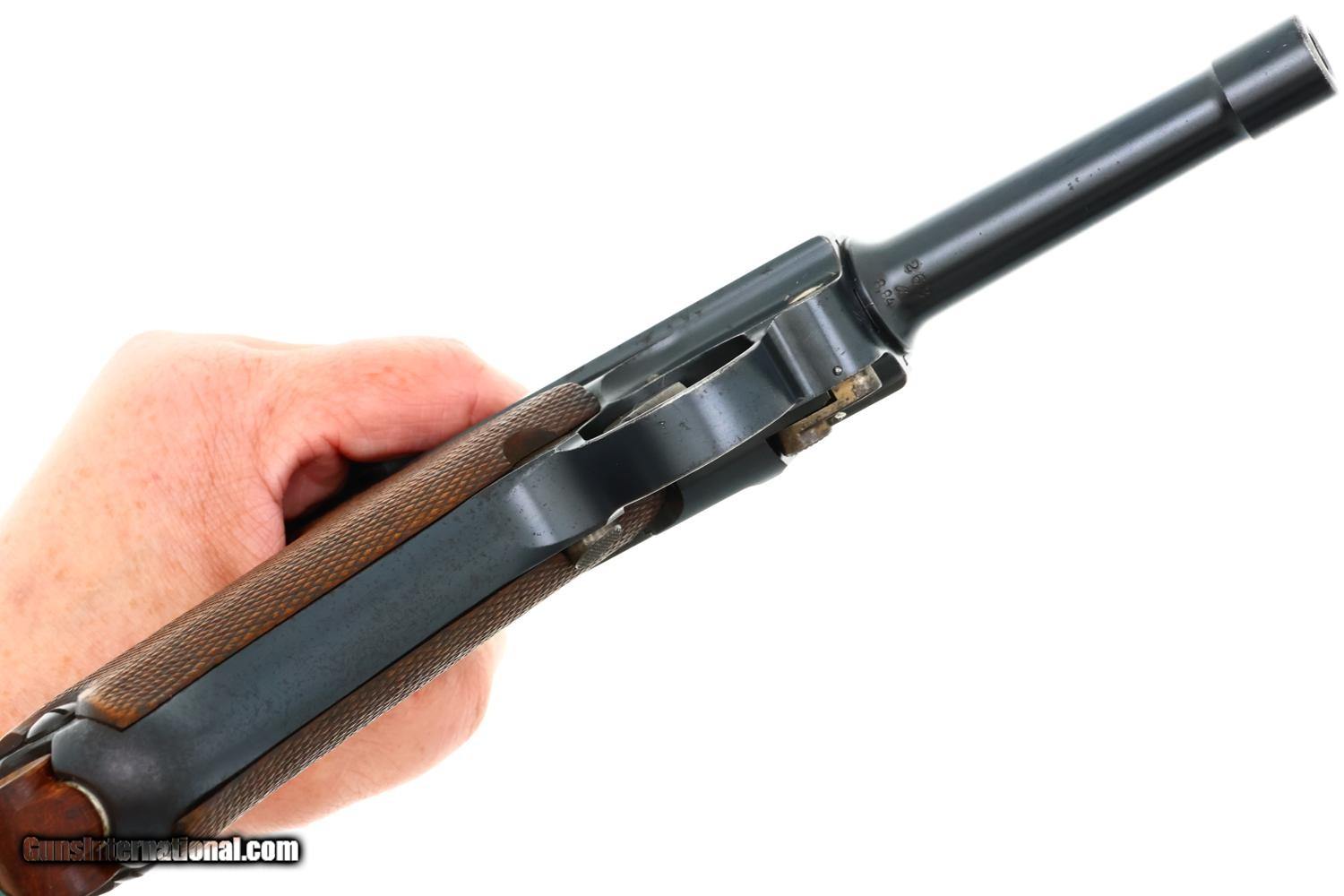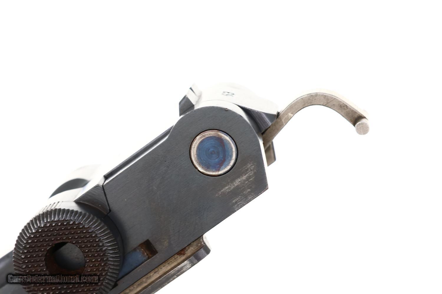 Description: Synopsis: This all-matching original finish 1913 dated DWM German Military Luger Pistol is a scarce pre-WWI 9mmP military firearm whose key features include the absence of a hold open and no stock lug. A wonderful find for the German pistol or military collector, seldom offered for sale in this condition! Description: Scarce, MILITARY configuration DWM Luger, made in 1913, cal: 9mmP, with no hold-open, no stock lug, and military acceptances on the right side of barrel extension. Rust blued major components and strawed small parts. Four inch bbl with drift adjustable front sight and V-notch rear sight. Receiver dated "1913" with intertwined DWM on the middle toggle link. Full serial number “263a” on forward frame and under barrel, "263" on left side of barrel extension, and “63” repeated on all small parts including both panels of the checkered walnut grips. Tinned magazine with unmarked wooden plug. The 1913 DWM Luger represents a transitional period to the standard configuration, with hold-open and stock lug, that served throughout the First World War. Condition: VG+ original rust blue finish with sharp edge wear in the usual holster/handling locations with light freckling on the front and rear grip straps. Comparable condition strawed parts with thinning and toning, particularly on the forward portion of the takedown lever, the body of the safety and the face of the trigger. Oil darkened walnut grips with light blunting but no cracks or splits, VG+ tinned body of the magazine whose unmarked plug is a replacement. Mirror bright bore with sharp rifling. Correct manual mechanics. A very early, original, and all-matching German military Luger from 1913 with no hold open or stock lug, easily upgraded with a better magazine. Manufacturer: DWM Model: P08 Luger Serial Number: 263a Caliber Info: 9mmP Condition: VG Price: $3,995.00 Contact Seller |