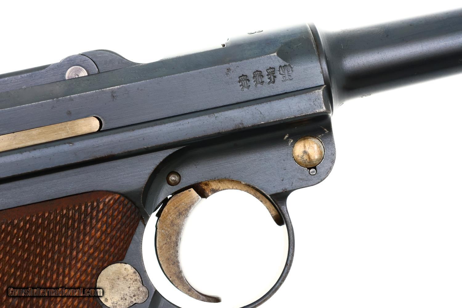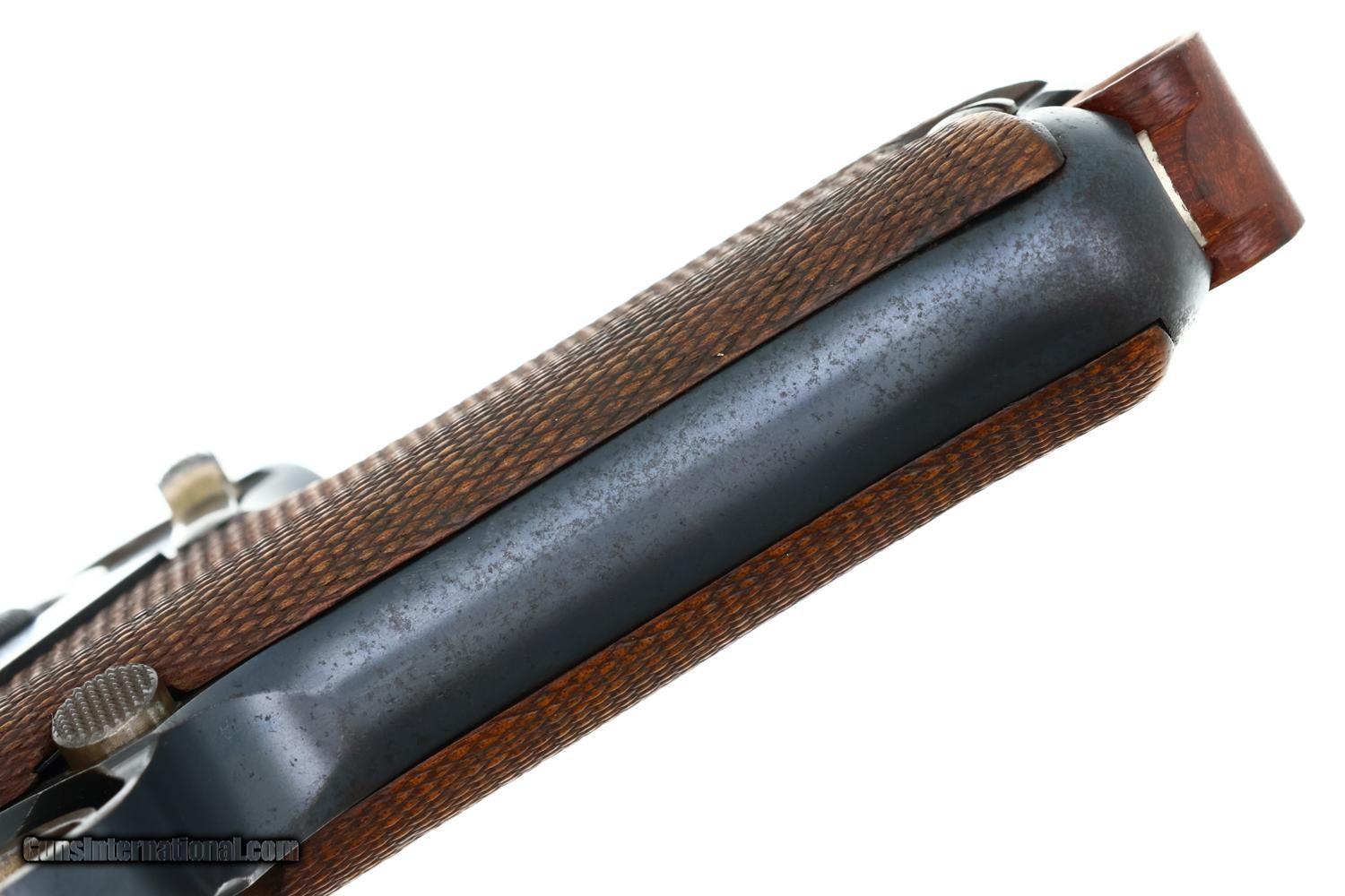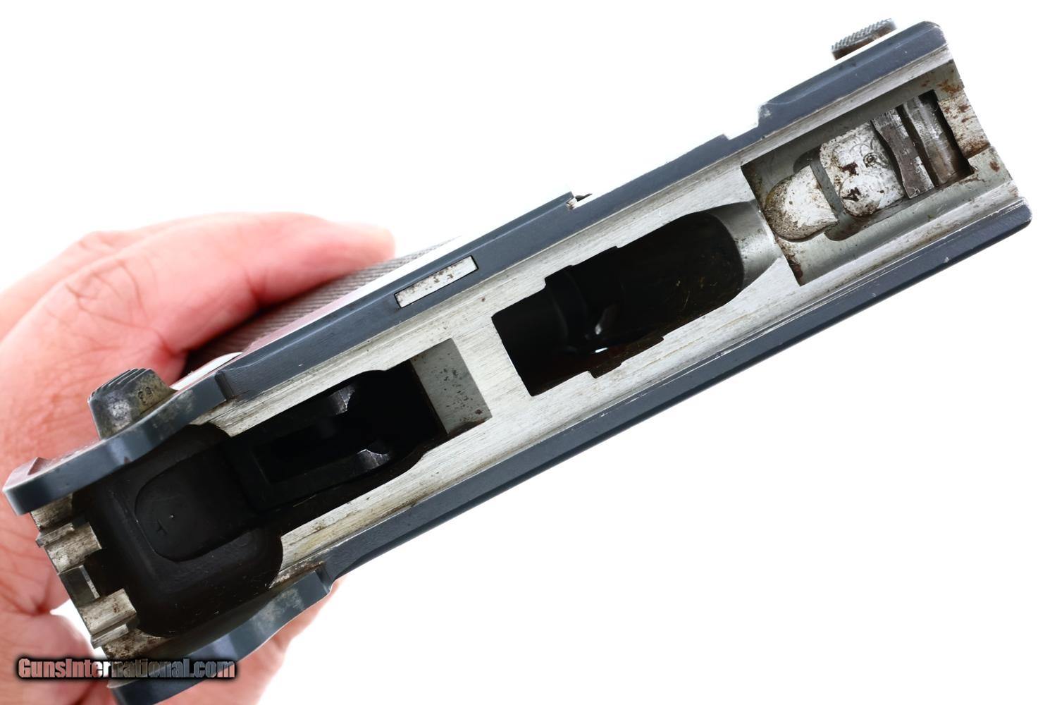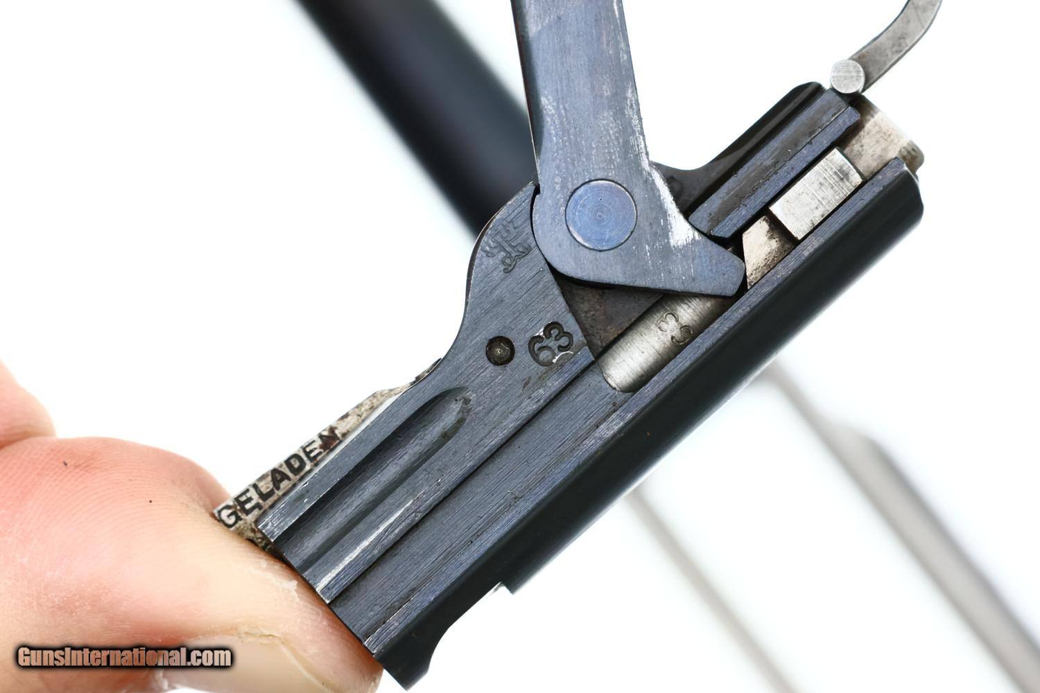 Description: Synopsis: This all-matching original finish 1913 dated DWM German Military Luger Pistol is a scarce pre-WWI 9mmP military firearm whose key features include the absence of a hold open and no stock lug. A wonderful find for the German pistol or military collector, seldom offered for sale in this condition! Description: Scarce, MILITARY configuration DWM Luger, made in 1913, cal: 9mmP, with no hold-open, no stock lug, and military acceptances on the right side of barrel extension. Rust blued major components and strawed small parts. Four inch bbl with drift adjustable front sight and V-notch rear sight. Receiver dated "1913" with intertwined DWM on the middle toggle link. Full serial number “263a” on forward frame and under barrel, "263" on left side of barrel extension, and “63” repeated on all small parts including both panels of the checkered walnut grips. Tinned magazine with unmarked wooden plug. The 1913 DWM Luger represents a transitional period to the standard configuration, with hold-open and stock lug, that served throughout the First World War. Condition: VG+ original rust blue finish with sharp edge wear in the usual holster/handling locations with light freckling on the front and rear grip straps. Comparable condition strawed parts with thinning and toning, particularly on the forward portion of the takedown lever, the body of the safety and the face of the trigger. Oil darkened walnut grips with light blunting but no cracks or splits, VG+ tinned body of the magazine whose unmarked plug is a replacement. Mirror bright bore with sharp rifling. Correct manual mechanics. A very early, original, and all-matching German military Luger from 1913 with no hold open or stock lug, easily upgraded with a better magazine. Manufacturer: DWM Model: P08 Luger Serial Number: 263a Caliber Info: 9mmP Condition: VG Price: $3,995.00 Contact Seller |