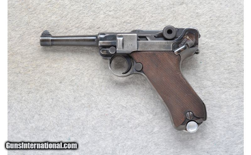 Description: This DWM Model 1916 Luger is a toggle locked recoil operated semi-automatic pistol in 9mm Cal. It has a 4 inch barrel. A blade front and notch rear sight. The grip is a diamond checkered walnut. The magazine serial number does not match the gun serial num 9mm Luger SOLD Chambers: Semi-Auto 8 round magazine. Metal Condition: Good. Light wear and handling marks. Wood Condition: Grips are good with light wear. Barrels: 4 inch blued. Sights: Blade front. Notch rear. Item Location: Richfield, WI |