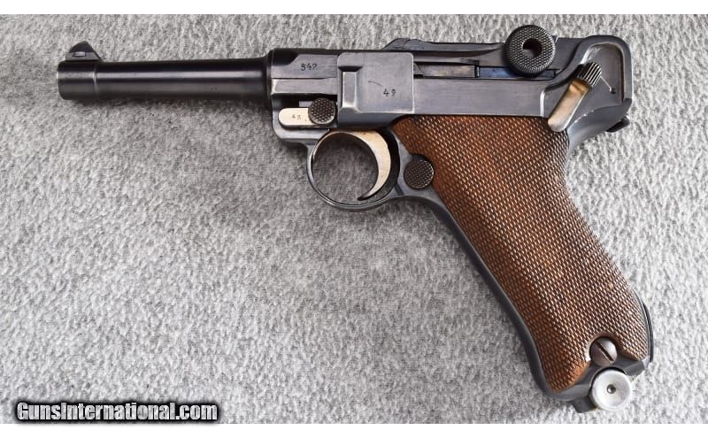 Description: This 1916 DWM Luger is in very good overall condition showing only light use. Checkered wooden grips are solid with no cracks and very light wear. Original blue is also very good with some light wear on high contact areas and muzzle. Gun as matching serial numbers on barrel, frame, toggle, action, locking bolt and sideplate. Gun has military receiver proof marks on right side with FXO/37 P08 aluminum magazine. Very clean gun. 9mm Luger SOLD Curio/Relic: Yes Metal Condition: Very Good Wood Condition: Very Good Bore Condition: Very Good Barrels: 4 Triggers: Factory Butt Pad: Checkered Walnut Grips Weight: 32 oz Sights: Blade Front - Integral Notch Rear Item Location: Wheeling |