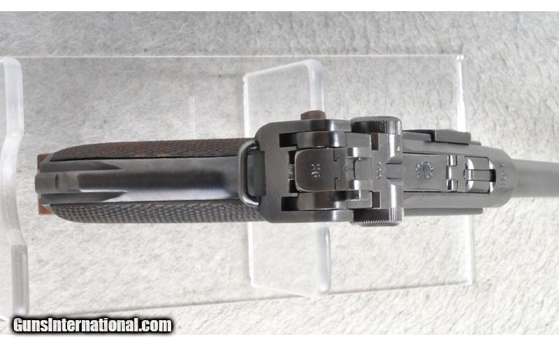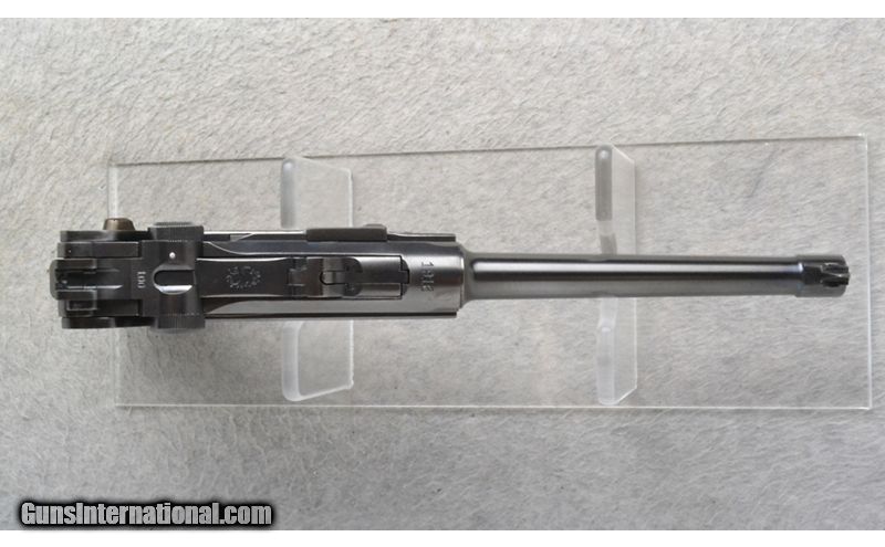 Description: This DWM Model 1916 Luger is a right hand semi-auto pistol in 9mm Cal. It has a 6 inch barrel. A blade front sight and V notch rear sight. The grip is a diamond checkered hardwood. Serial Number 3626 matches under the barrel and front of the frame. 1916 is stamped on top and left side. 100 is stamped on top of the toggle and 26 on the back of the toggle. The wooden bottom of the magazine is stamped 3626 matching the serial number of the gun. 9mm Luger SOLD Chambers: 8 round magazine. Metal Condition: Excellent. Wood Condition: Very Good. Minor use marks. Bore Condition: Excellent. Barrels: 6 inch. Weight: 34 oz. Sights: Blade front. V notch rear. Item Location: Richfield, WI |