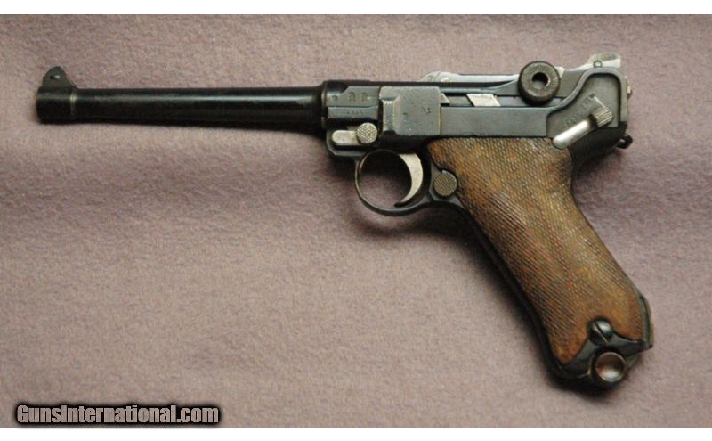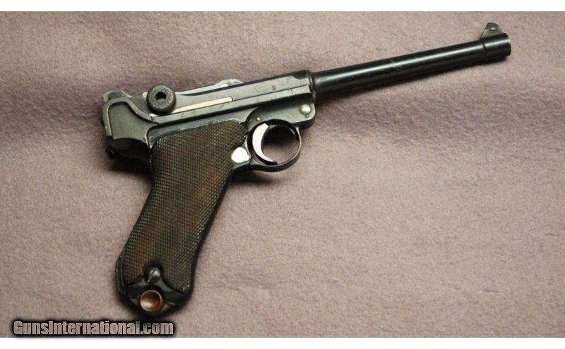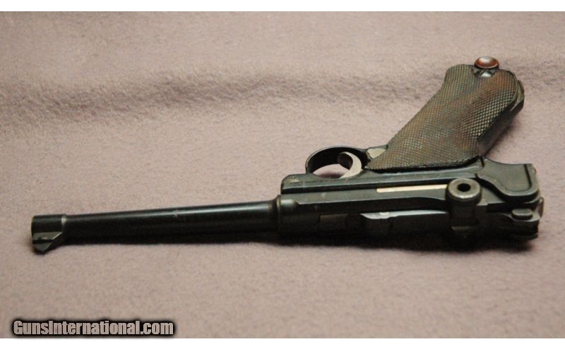 Description: DWM Model 1916 Navy Pistol 9mm. Very good condition. Rated as a scarce luger this Navy has matching numbers except for the trigger and the magazine which is period correct. The rear sight is two position adjustable for 100 and 200 meters. The proof marks show the Imperial Navy acceptance marks. The chamber date is 1916 of which 8000 were made that year. One additional point of interest on this gun is that it has British proof marks on the underside the barrel so at some point in the career of this luger was spent in the British army most likely as a training weapon. SOLD Curio/Relic: Yes Manufacturer: 1916. Caliber Info: 9mm Chambers: Semi-auto. Metal Condition: Very good, light finish wear, small nicks & small scratches, few small areas light corrosion. Wood Condition: Grips are in excellent condition. Bore Condition: Bright. Barrels: 6" Barrel. Triggers: Factory trigger, toggle link action. Stock: Factory grips. Weight: 36 Ozs. Sights: Fixed iron sights. Item Location: La Vista, NE |