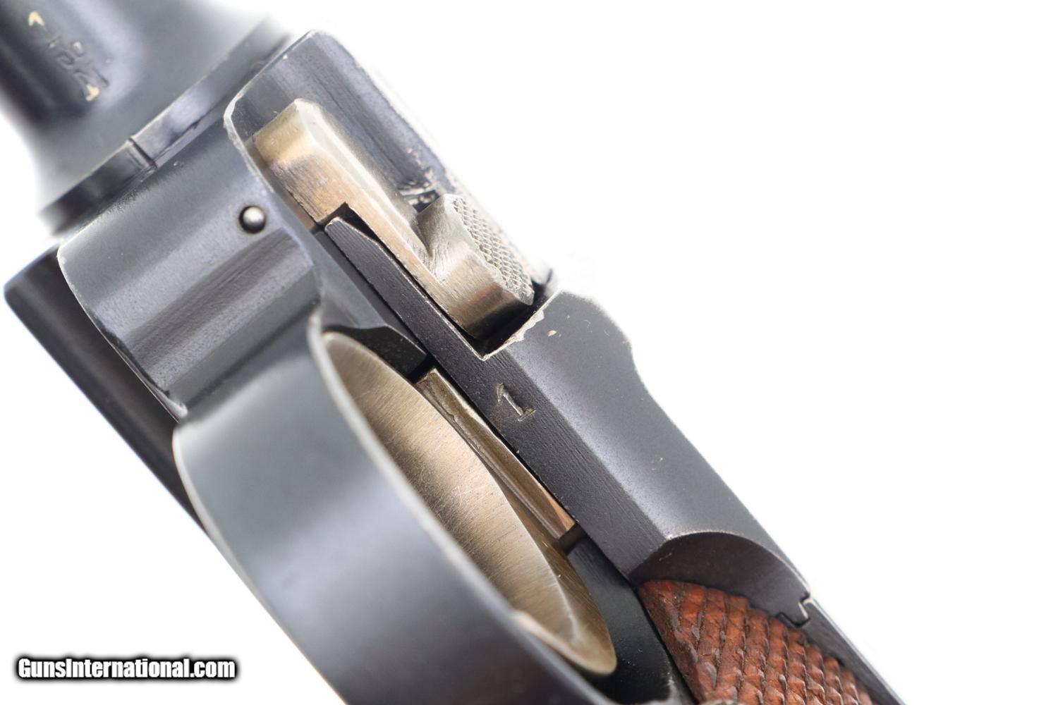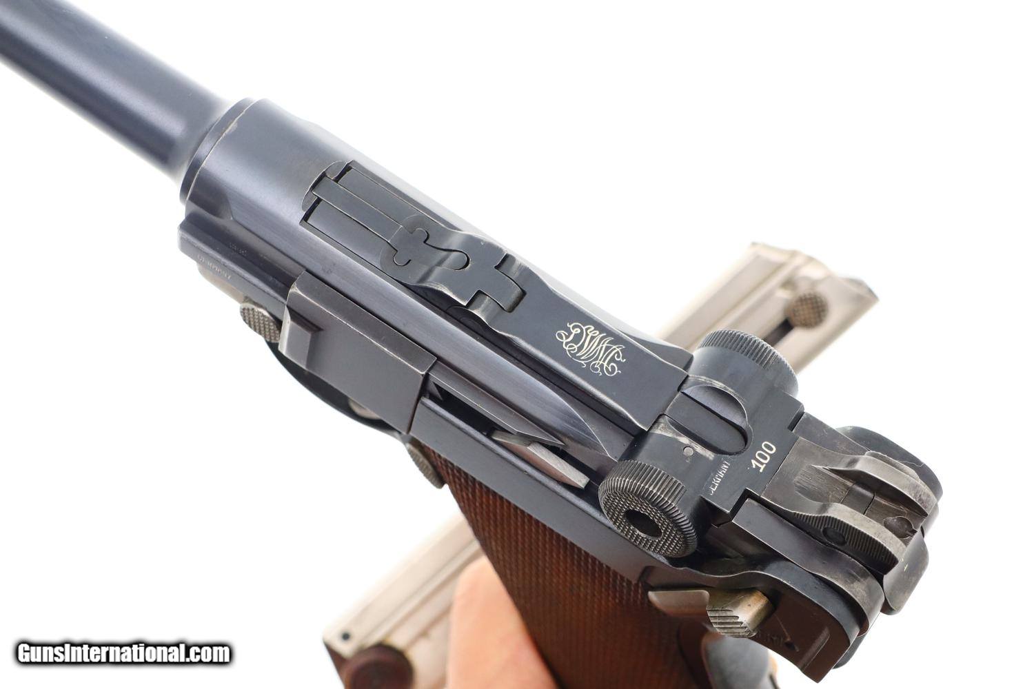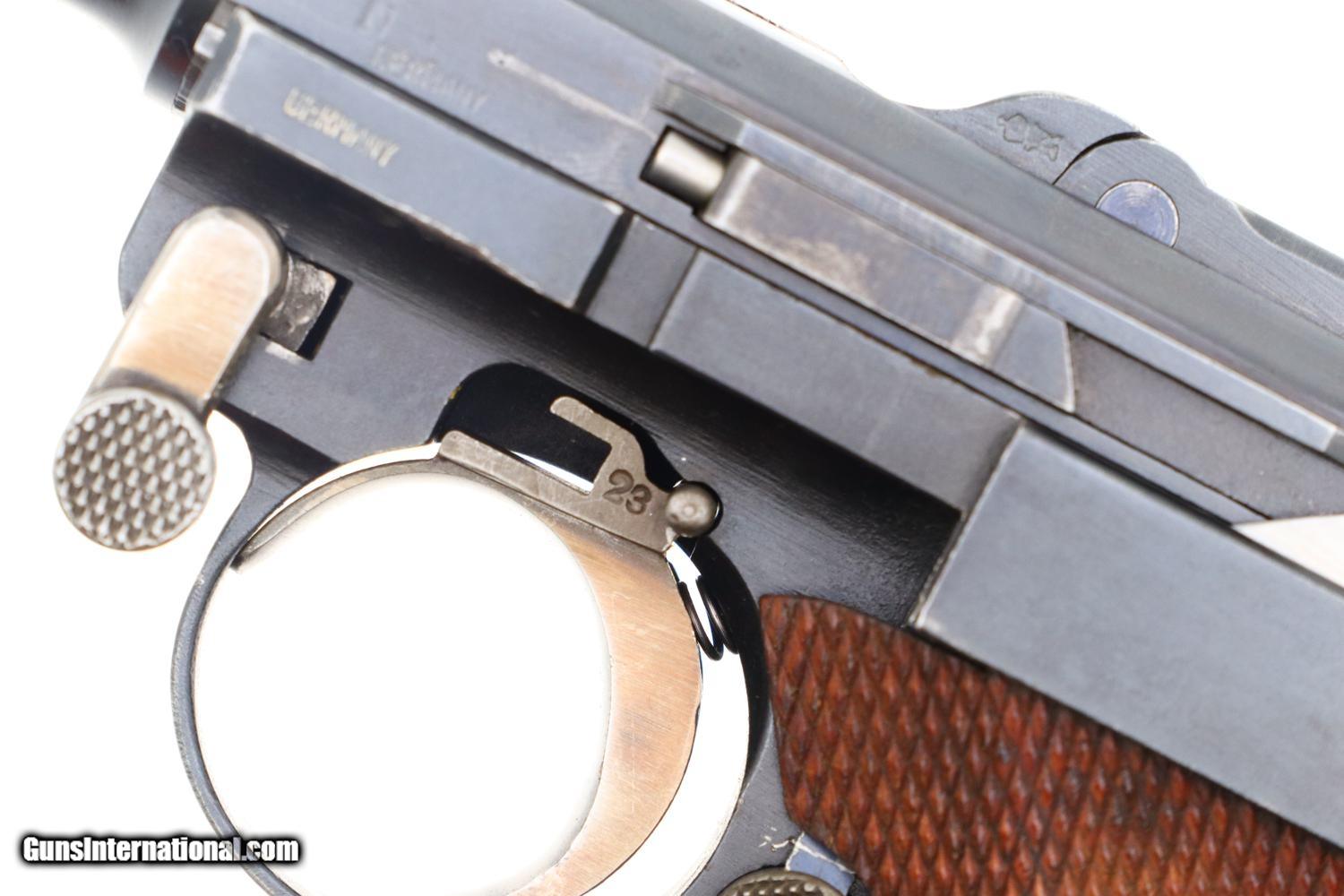 Description: Synopsis: DWM 1920 Commercial Luger, serial number 1, presenting as a 1906 Navy configuration. Description: Outstanding 1906 Navy pattern Luger serial number 1, whose matching number appears under the barrel, under the sideplate and on the rear toggle link. During the re-work, the breech block and trigger were likely replaced as both parts are serial numbered 23. The other parts are largely unnumbered as common to the 1920 pistols, with the export marking “GERMANY” appearing on the rear toggle link and on the left rail. The gun is fitted with the usual checkered walnut panels and has an original Navy magazine whose base with concentric circles has been marked with the Crown/M and numbered 3562. Condition: VG+ with sharp edge wear and handling marks as you might expect from a pistol that is now over 100 years old. Comparable condition grips and crisp magazine whose plug pin shows no evidence of disturbance. Mirror bore. Perfect manual mechanics. An incredible opportunity to own a real serial number 1 Navy configuration Luger! And what collector would not covet a serial number 1! ~~Insured shipping fee of $155; most packages shipped using FedEx 2nd Day.~~ SOLD Curio/Relic: Yes Manufacturer: DWM Serial Number: 1 Caliber Info: 9mmP |