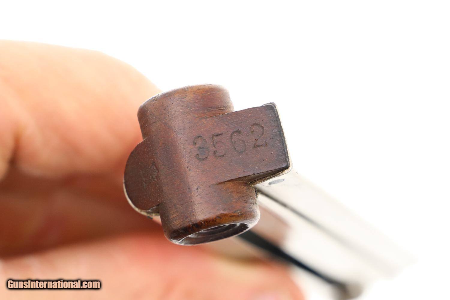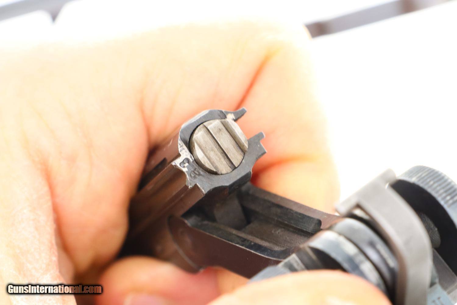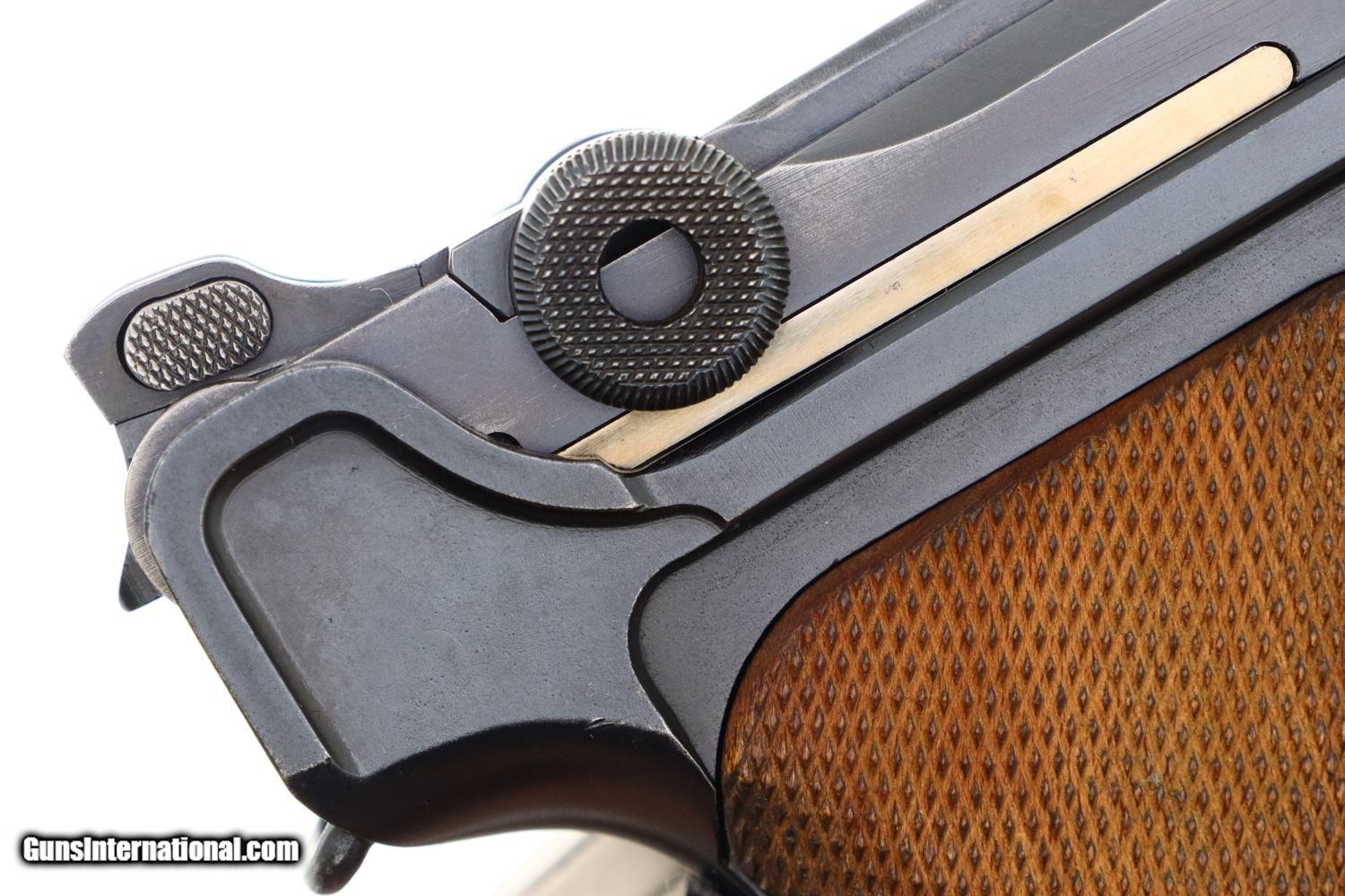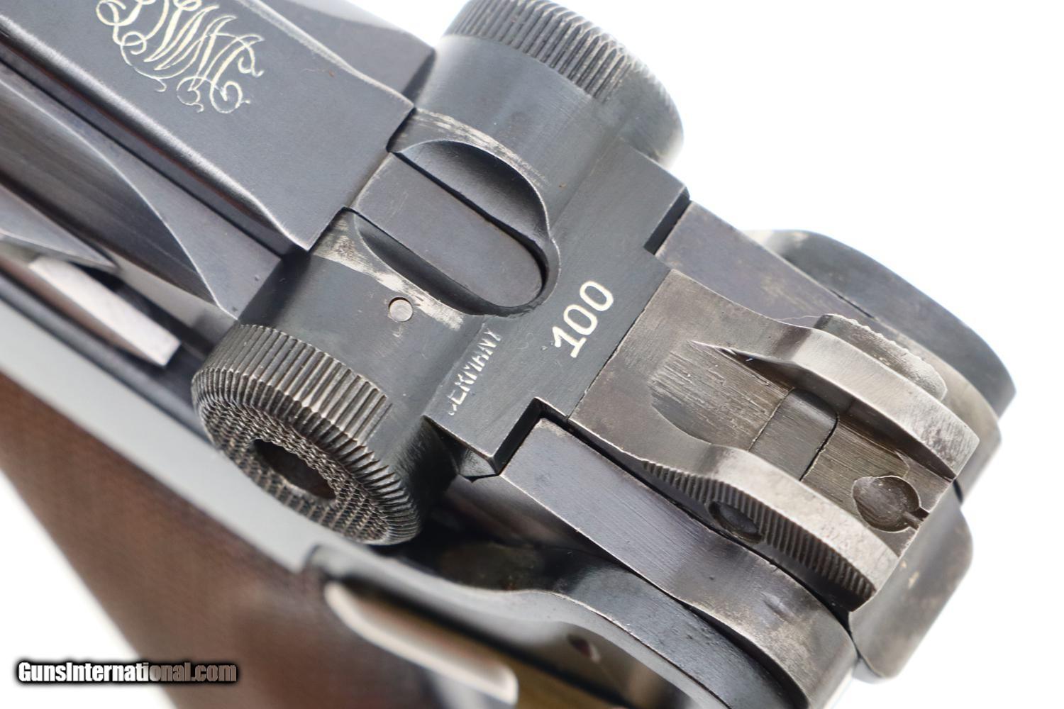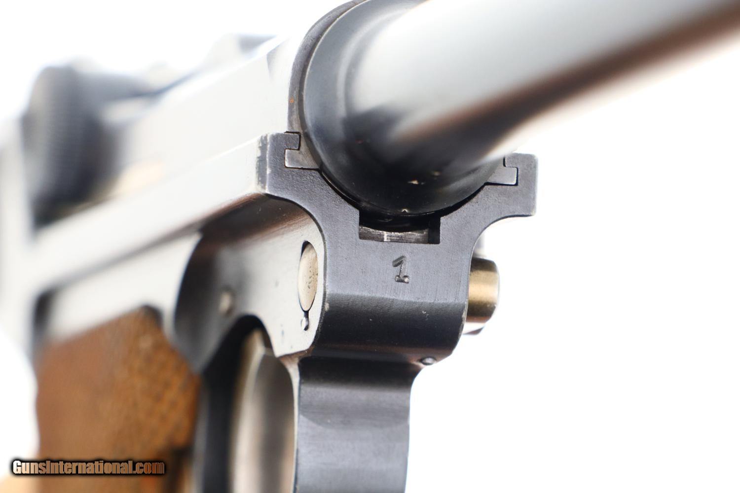 Description: Synopsis: DWM 1920 Commercial Luger, serial number 1, presenting as a 1906 Navy configuration. Description: Outstanding 1906 Navy pattern Luger serial number 1, whose matching number appears under the barrel, under the sideplate and on the rear toggle link. During the re-work, the breech block and trigger were likely replaced as both parts are serial numbered 23. The other parts are largely unnumbered as common to the 1920 pistols, with the export marking “GERMANY” appearing on the rear toggle link and on the left rail. The gun is fitted with the usual checkered walnut panels and has an original Navy magazine whose base with concentric circles has been marked with the Crown/M and numbered 3562. Condition: VG+ with sharp edge wear and handling marks as you might expect from a pistol that is now over 100 years old. Comparable condition grips and crisp magazine whose plug pin shows no evidence of disturbance. Mirror bore. Perfect manual mechanics. An incredible opportunity to own a real serial number 1 Navy configuration Luger! And what collector would not covet a serial number 1! ~~Insured shipping fee of $155; most packages shipped using FedEx 2nd Day.~~ SOLD Curio/Relic: Yes Manufacturer: DWM Serial Number: 1 Caliber Info: 9mmP |
