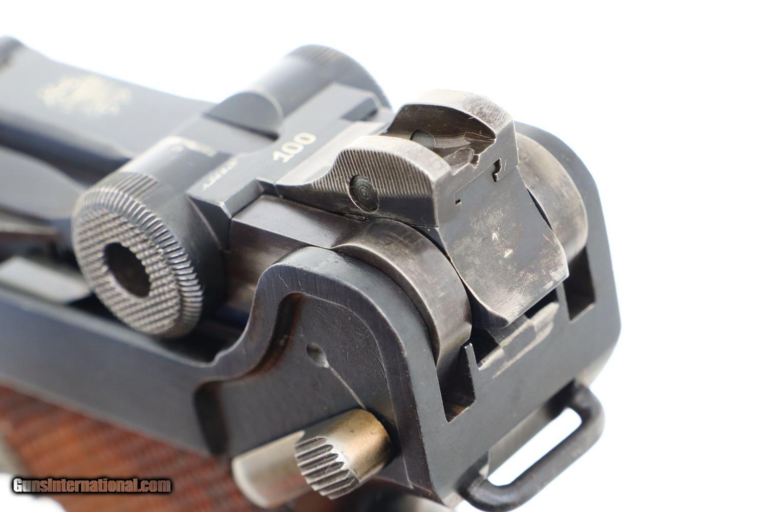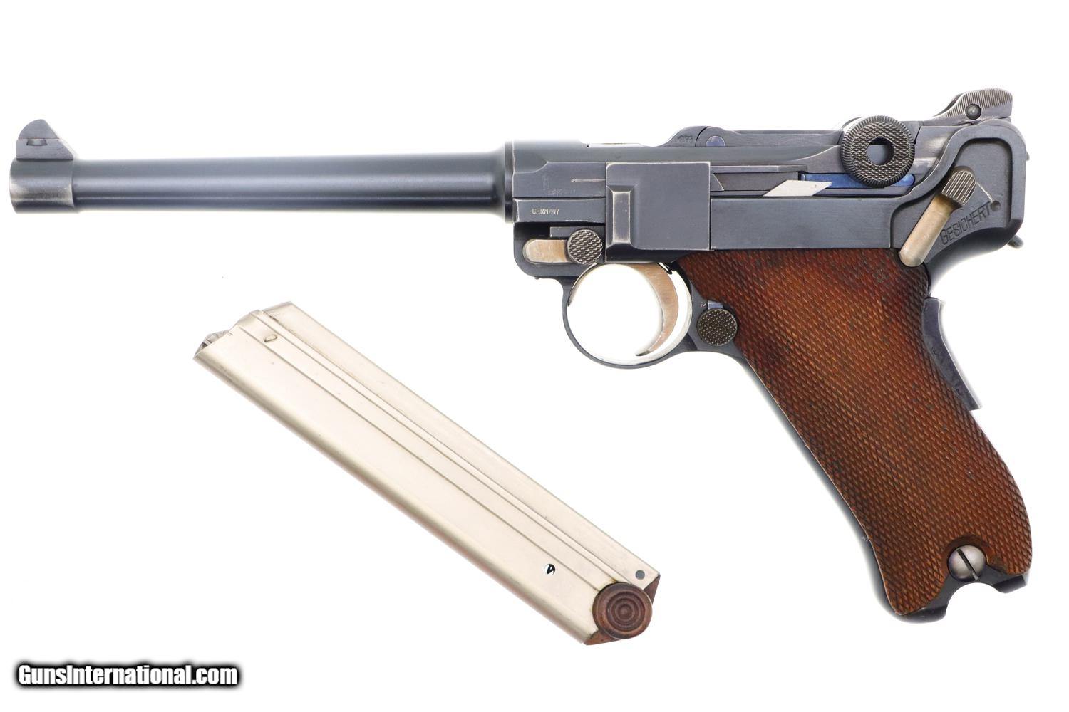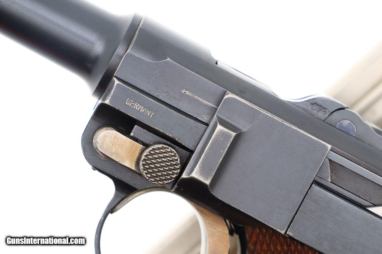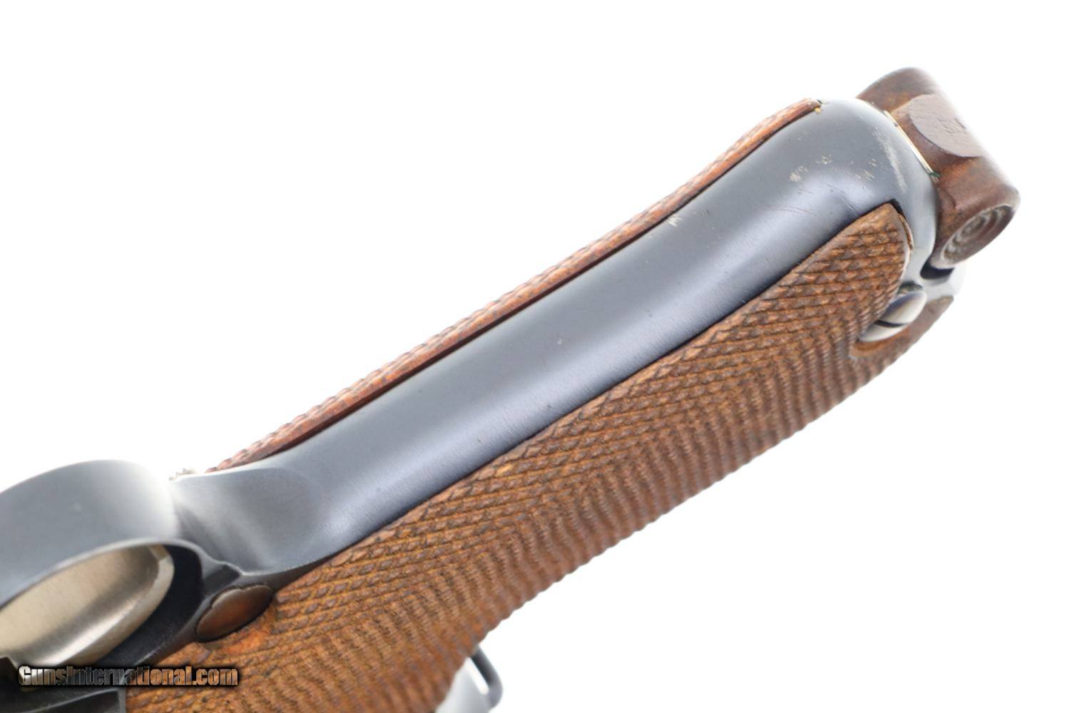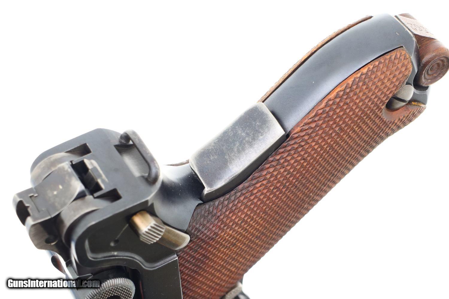 Description: Synopsis: DWM 1920 Commercial Luger, serial number 1, presenting as a 1906 Navy configuration. Description: Outstanding 1906 Navy pattern Luger serial number 1, whose matching number appears under the barrel, under the sideplate and on the rear toggle link. During the re-work, the breech block and trigger were likely replaced as both parts are serial numbered 23. The other parts are largely unnumbered as common to the 1920 pistols, with the export marking “GERMANY” appearing on the rear toggle link and on the left rail. The gun is fitted with the usual checkered walnut panels and has an original Navy magazine whose base with concentric circles has been marked with the Crown/M and numbered 3562. Condition: VG+ with sharp edge wear and handling marks as you might expect from a pistol that is now over 100 years old. Comparable condition grips and crisp magazine whose plug pin shows no evidence of disturbance. Mirror bore. Perfect manual mechanics. An incredible opportunity to own a real serial number 1 Navy configuration Luger! And what collector would not covet a serial number 1! ~~Insured shipping fee of $155; most packages shipped using FedEx 2nd Day.~~ SOLD Curio/Relic: Yes Manufacturer: DWM Serial Number: 1 Caliber Info: 9mmP |