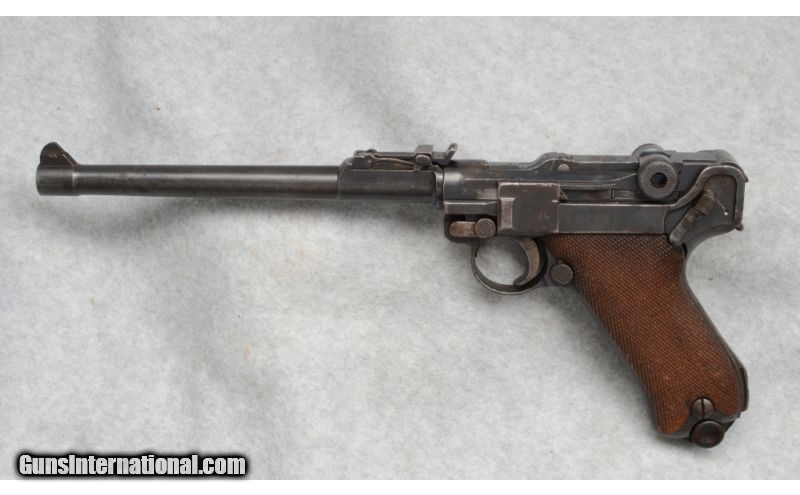 Description: Fair condition. SOLD Manufacturer: Circa: 1918 Caliber Info: 9mm Parabellum Metal Condition: Fair Some areas of pitting and dings on parts of the frame. Wood Condition: Fair with a crack, checkering good with some slight wear. Bore Condition: Rough with Rifling still showing Barrels: 8 Stock: Checkered Walnut Grips Weight: 2 lbs. 4 ozs. Sights: Fixed serrated blade front, with an Adjustable Style 800 M Rear Sight Item Location: Hamburg, PA |