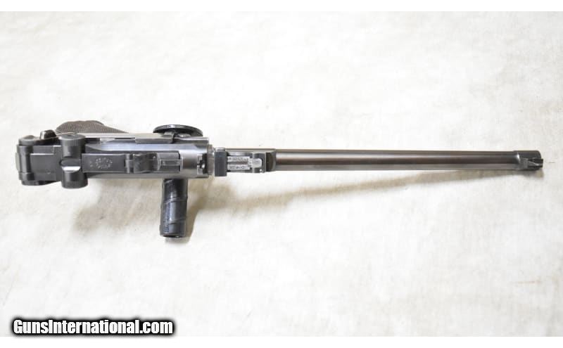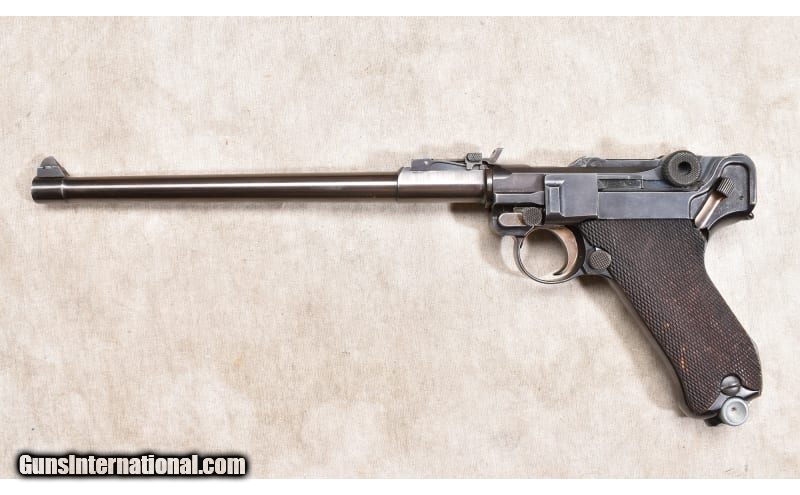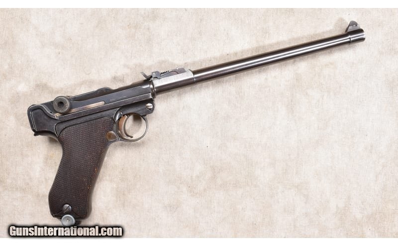 Description: After WWI, the Germans were looking for any way of generating cash. Mauser survived by producing firearms for the civilian market and this is one of them. Call it a re-issue of the artillery Luger, this one sports a barrel that is 10 inches long. They vary from the military model in the absence of a fore end. This one has ladder style rear sight graduated to "8" which might be 800 meters. It is hard to imagine firing a 9mm Luger bullet that far, but wishful thinking may have prevailed. There is a lug for the stock, but no stock. 9mm Luger SOLD Chambers: 8+1 capacity Metal Condition: Very good. There is some fading of the blue around the muzzle and on the high points. Wood Condition: Very good. Most of the checkering is sharp and clean. There is a narrow scrape on the left side. Bore Condition: Bright and shiny with good rifling. Barrels: 10 inches Triggers: Factory single action trigger Butt Pad: Checkered walnut Weight: 38 oz Sights: Post and ladder type notch Item Location: Rogers |