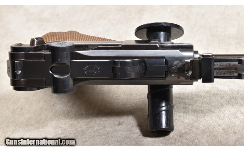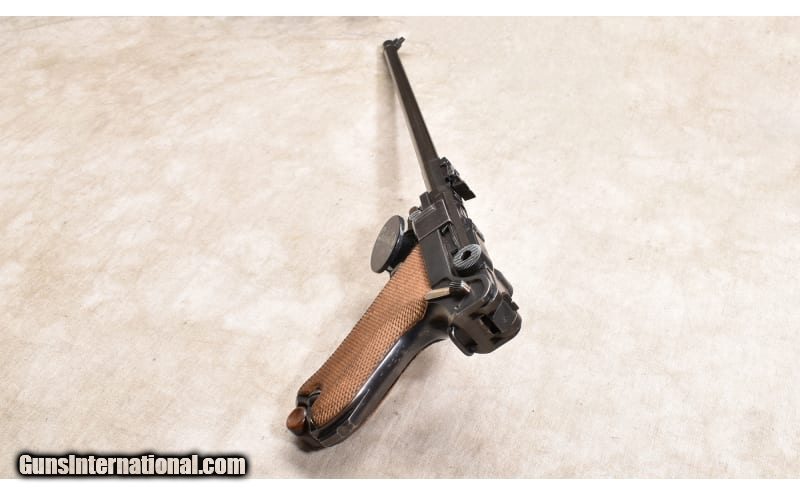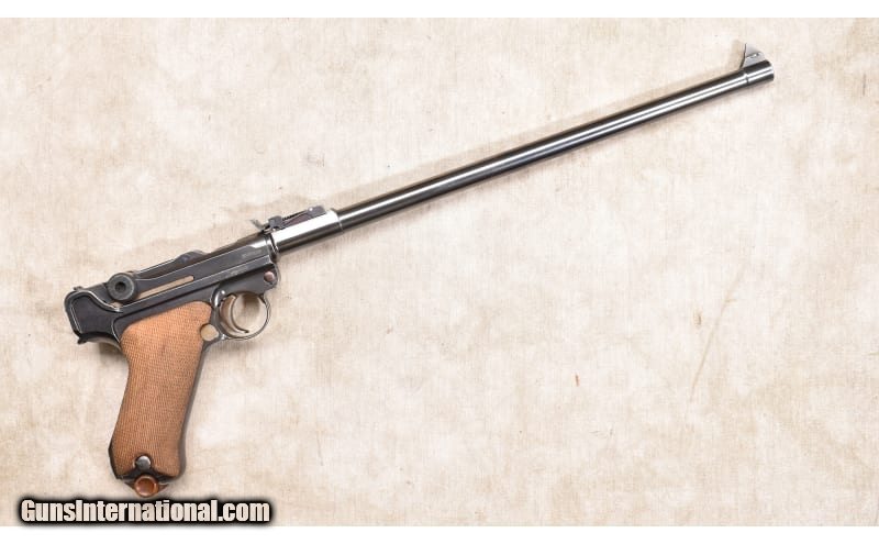 Description: After WWI, the Germans were looking for any way of generating cash. Mauser survived by producing firearms for the civilian market and this is one of them. Call it a re-issue of the artillery Luger, this one sports a barrel that is nearly 14 inches long. They vary from the military model in the absence of a fore end. This one has ladder style rear sight graduated to "8" which might be 800 meters. It is hard to imagine firing a 9mm Luger bullet that far, but wishful thinking may have prevailed. There is a lug for the stock, but no stock. 9mm Luger SOLD Chambers: 8+1 capacity Metal Condition: Very good.Some gentle wear around the muzzle and on the high points. Wood Condition: Excellent. Checkering is sharp. Bore Condition: Shiny and bright with good rifling. Barrels: 13-3/4 inches Triggers: Factory single action only trigger. Butt Pad: Finely checkered walnut. Weight: 41 oz. Sights: Post and ladder style notch iron sights Item Location: Rogers |