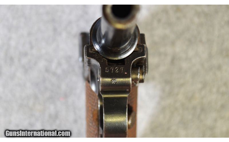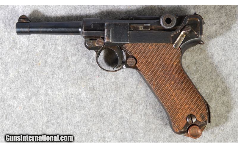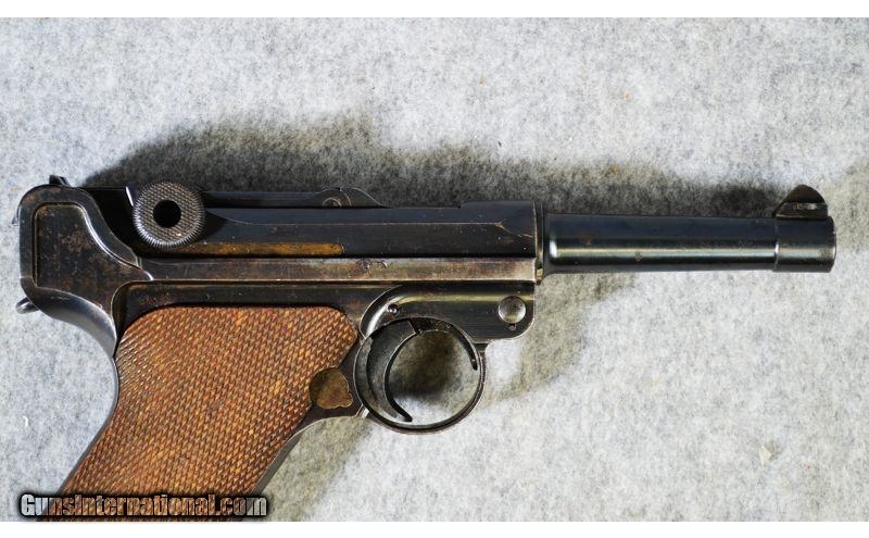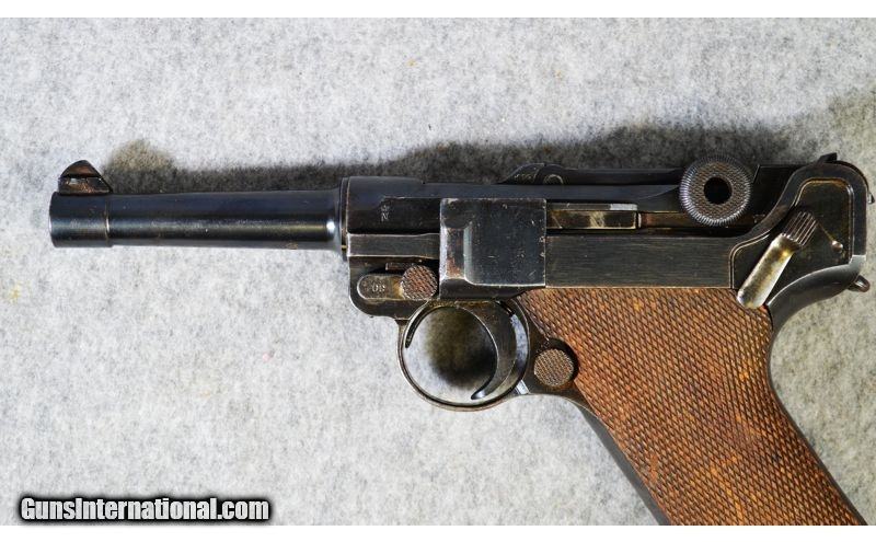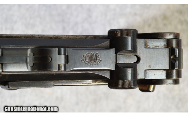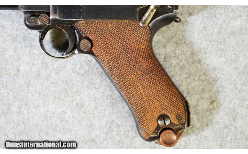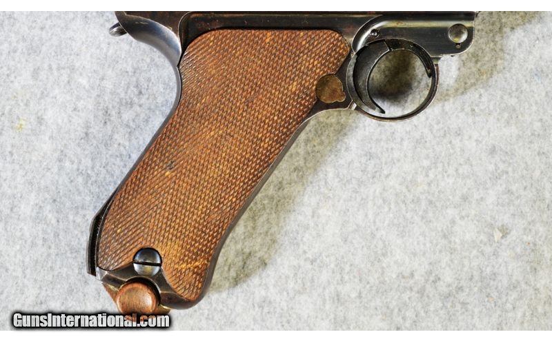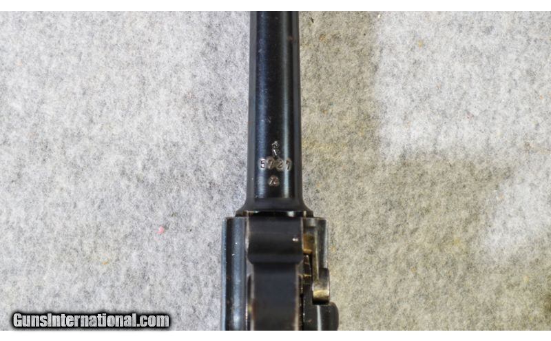 Description: Commercial Production DWM Luger Pistol chambered in .30 Luger. Appears to have been reblued. Barrel and frame match, other parts unnumbered or mismatch. Magazine has wooden baseplate, not numbered. Has lug for shoulder stock. .30 Luger/7.65mm Para. SOLD Metal Condition: Good Wood Condition: Good Barrels: 4 Triggers: Single, Blued Sights: Barleycorn Front Blade, V-Notch Rear Item Location: short pump |
