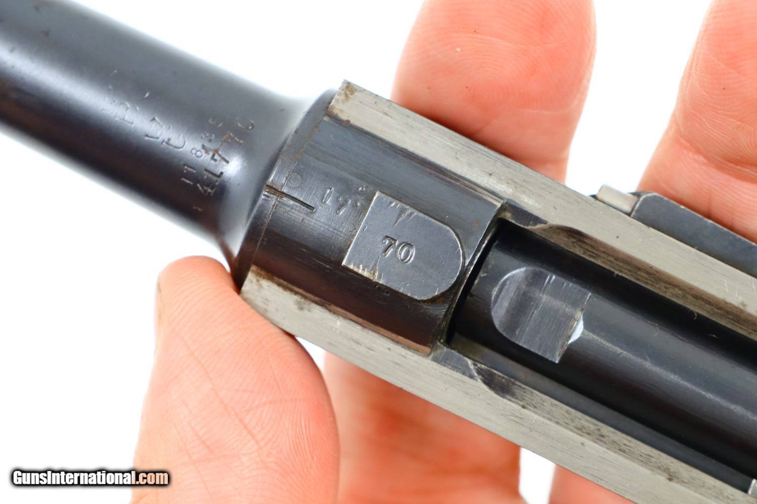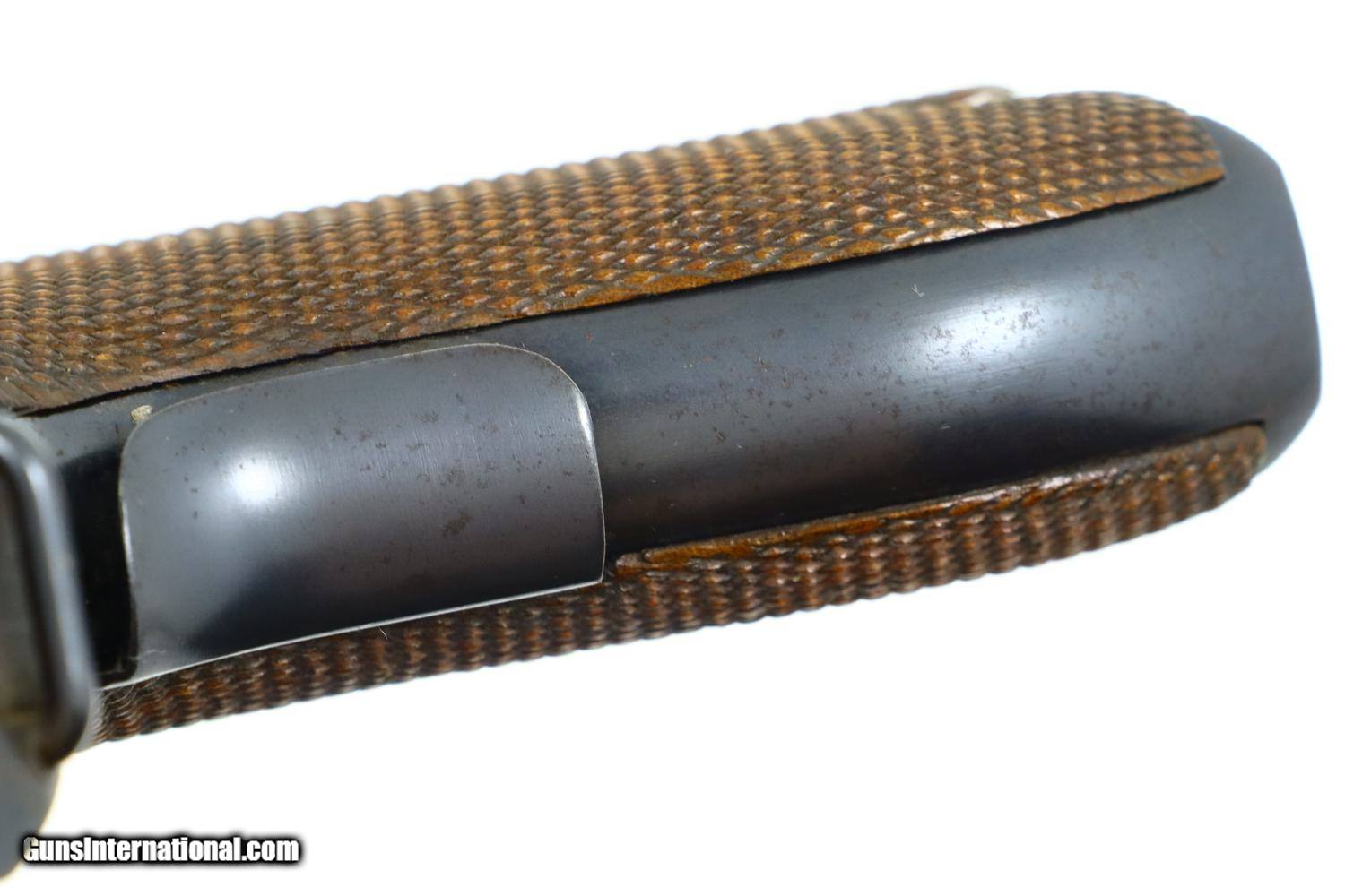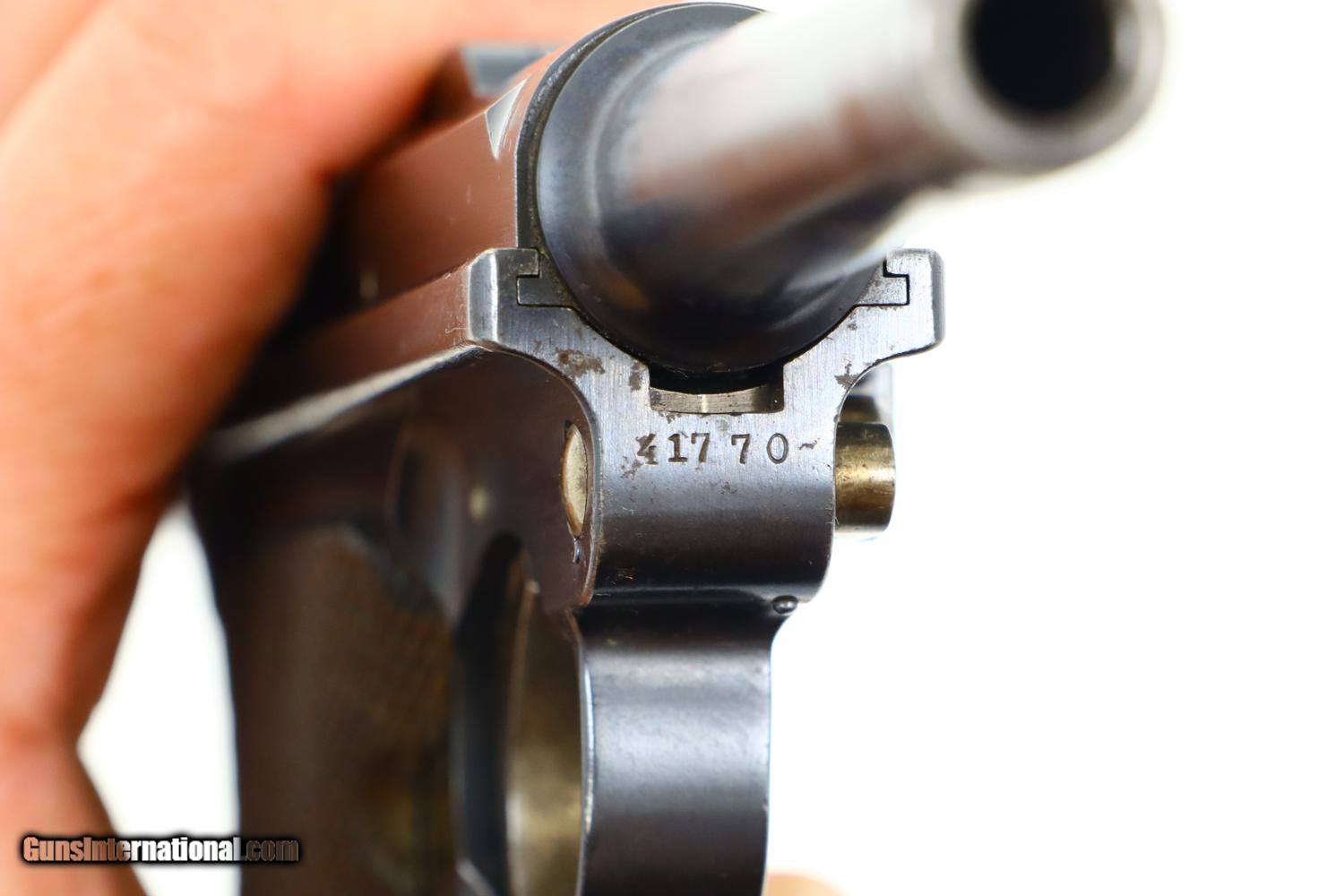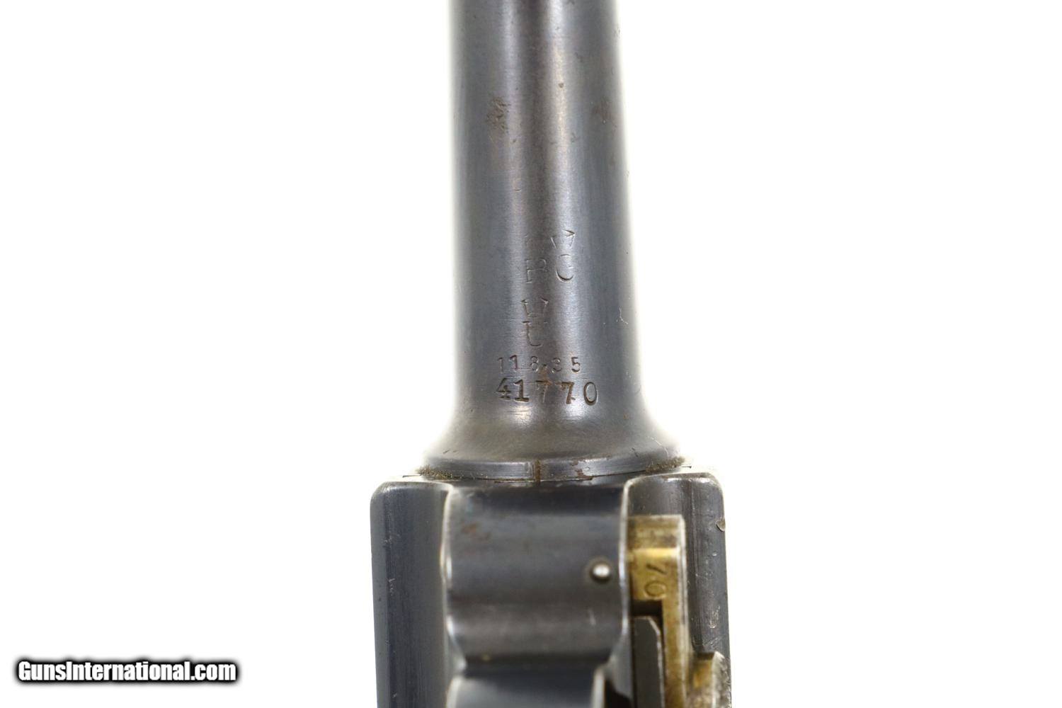 Description: Synopsis: Unusual DWM 1906 Commercial German Luger, Military Holster w/ Spare Mag Description: Standard configuration DWM 1906 Commercial Luger chambered for the desirable 9mmP, complete with 1915-dated military holster and spare magazine. Usual 4" barrel with drift adjustable front sight and fixed v-notch rear sight. Full serial number on forward frame and under barrel. Last two digits on all usual small parts. BUG proofing under barrel and left side of barrel extension. Original grips with inspector markings. Mirror bore. Correct tinned magazine with '41770' lightly scribed on walnut plug. Complete with 1915-dated military holster, manufacturer marked on front face under flap. Spare tinned magazine, unmarked walnut plug. No takedown tool. Condition: VG original rust blue with several patches of noticeable pitting under the barrel band. Balance of pistol near excellent, with very light scattering of freckling. Comparable condition oil darkened grips, with crisp checkering, and magazine scribed with number as denoted above. VG-EXC 1915-dated military holster. VG spare magazine, the left side with oxidation as pictured. ~~Insured shipping fee of $65; most packages shipped using FedEx 2nd Day.~~ SOLD Manufacturer: DWM Serial Number: 41770 Caliber Info: 9mmP |