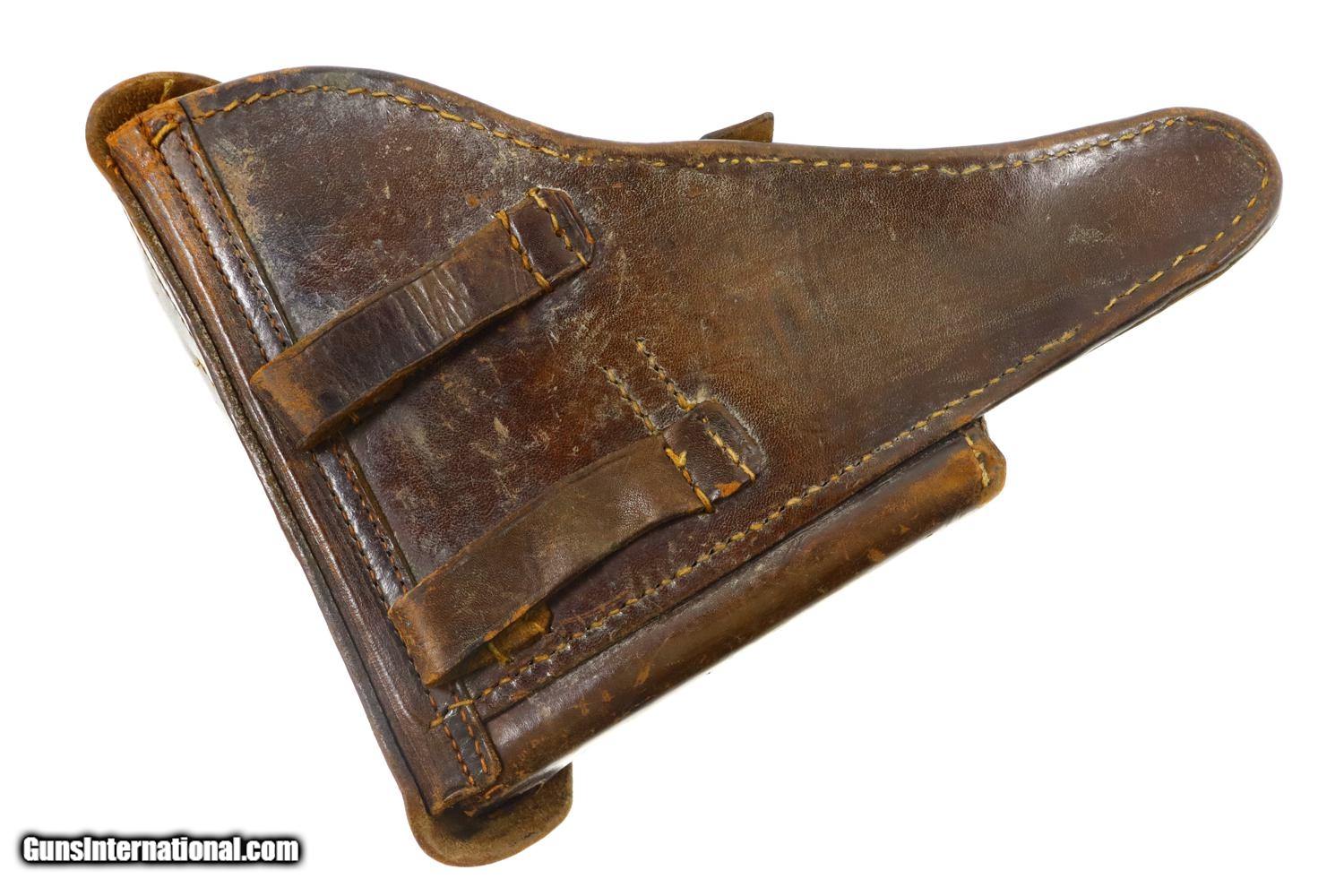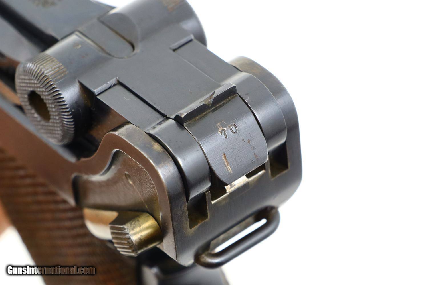 Description: Synopsis: Unusual DWM 1906 Commercial German Luger, Military Holster w/ Spare Mag Description: Standard configuration DWM 1906 Commercial Luger chambered for the desirable 9mmP, complete with 1915-dated military holster and spare magazine. Usual 4" barrel with drift adjustable front sight and fixed v-notch rear sight. Full serial number on forward frame and under barrel. Last two digits on all usual small parts. BUG proofing under barrel and left side of barrel extension. Original grips with inspector markings. Mirror bore. Correct tinned magazine with '41770' lightly scribed on walnut plug. Complete with 1915-dated military holster, manufacturer marked on front face under flap. Spare tinned magazine, unmarked walnut plug. No takedown tool. Condition: VG original rust blue with several patches of noticeable pitting under the barrel band. Balance of pistol near excellent, with very light scattering of freckling. Comparable condition oil darkened grips, with crisp checkering, and magazine scribed with number as denoted above. VG-EXC 1915-dated military holster. VG spare magazine, the left side with oxidation as pictured. ~~Insured shipping fee of $65; most packages shipped using FedEx 2nd Day.~~ SOLD Manufacturer: DWM Serial Number: 41770 Caliber Info: 9mmP |