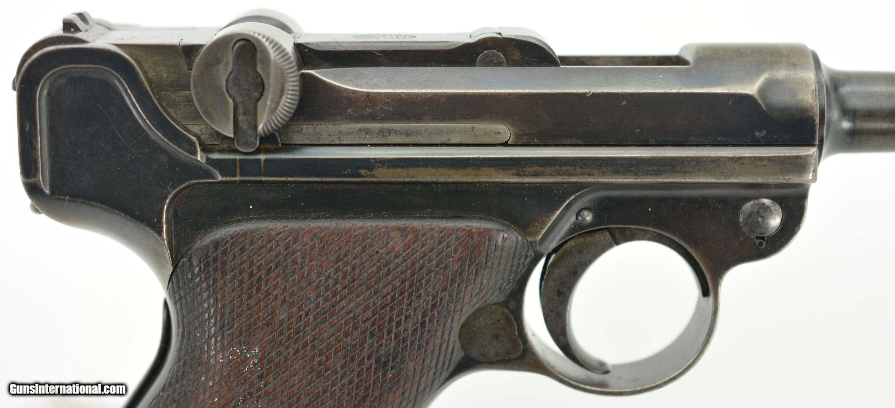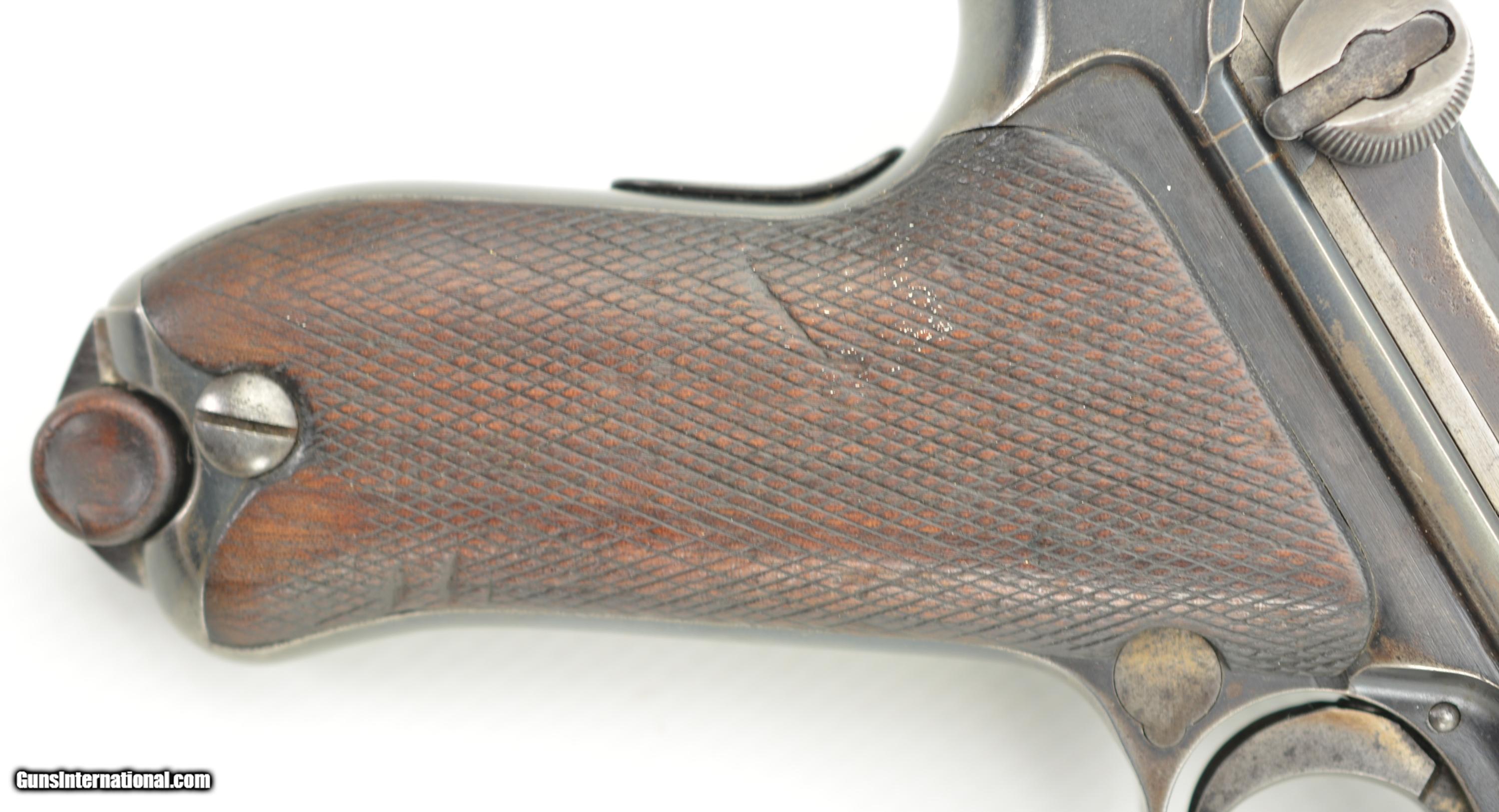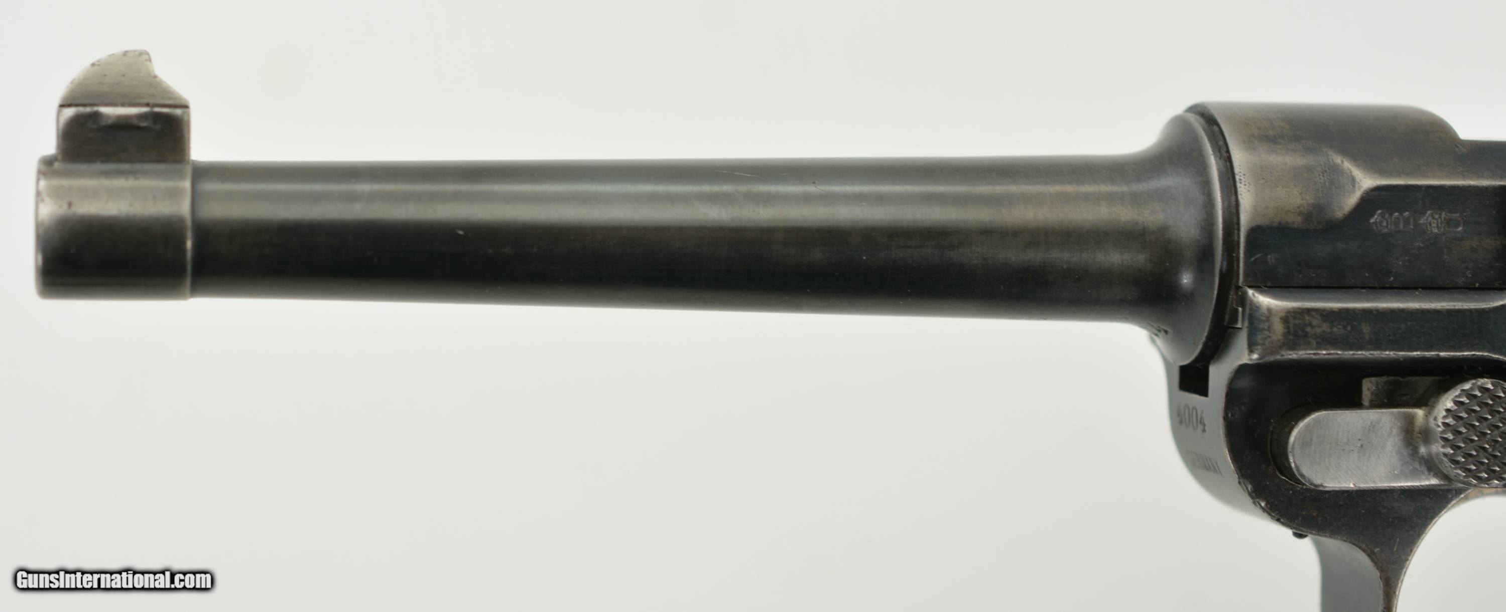 Description: Serial #4004, 7.63mm Para. (.30 Luger), 4 1/2" barrel with a very good, lightly pitted bore. This is a "GERMANY" marked pistol that has matching numbers on most of the parts (including the grips) with the exception of the firing pin ("14"), and the non-original toggle pin (added because the edges of the pin recess has burrs that will not allow an original pin to sit flush with the receiver). The metal retains 80-85% of an old, added blue finish with some mild silvering along the projecting edges, along the backstrap, and on the bearing surfaces of the toggle. The top of the chamber has had the original American Eagle marking removed, and has some thin, gray metal visible instead. Some faint races of the original straw color remain on the take-down lever, trigger, safety, magazine release, and ejector with the balance of the metal having a speckled gray-black patina. The grip safety is functional, however the spring is no longer present. The checkered walnut grips are in fair shape with lots of flattening of the points and a very small chip missing from just above the magazine release. The unmarked, wood-base magazine is in very good shape, having about 25% of the original nickel plate remaining. This is a handsome pistol, in about good plus overall condition, and would make an economical addition to a collection. FFL or C&R SOLD Curio/Relic: Yes Manufacturer: DWM Model: Luger Serial Number: 4004 Caliber Info: 7.63mm Gauge Info: 7.63mm |