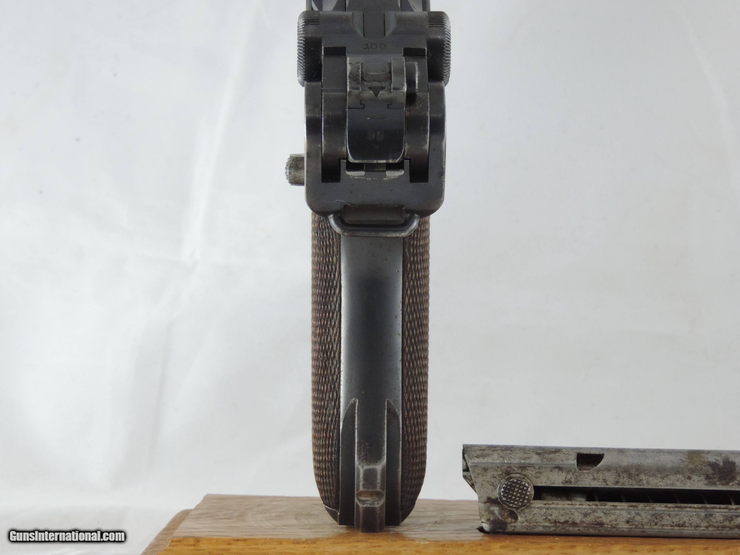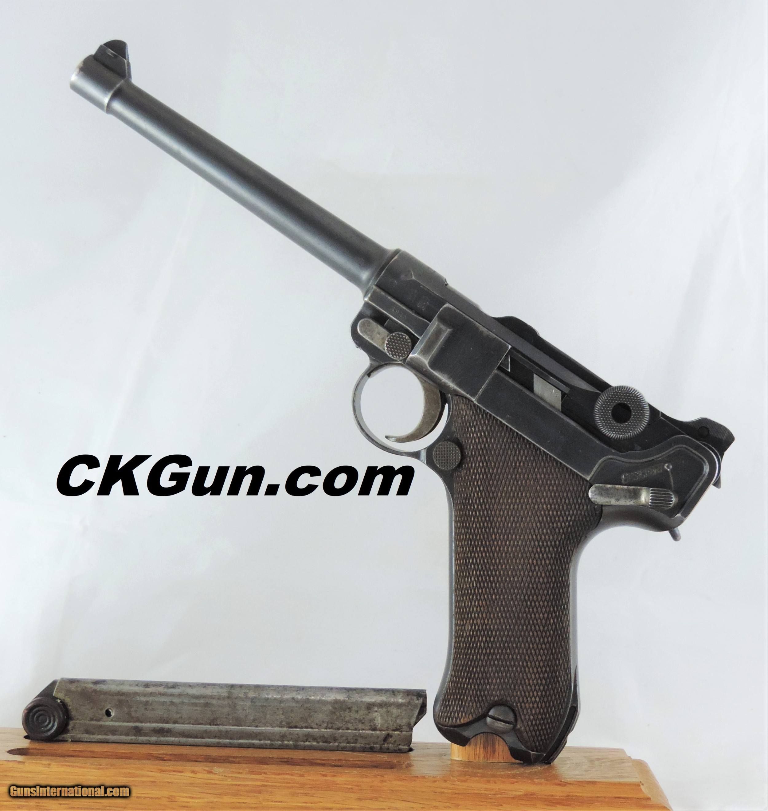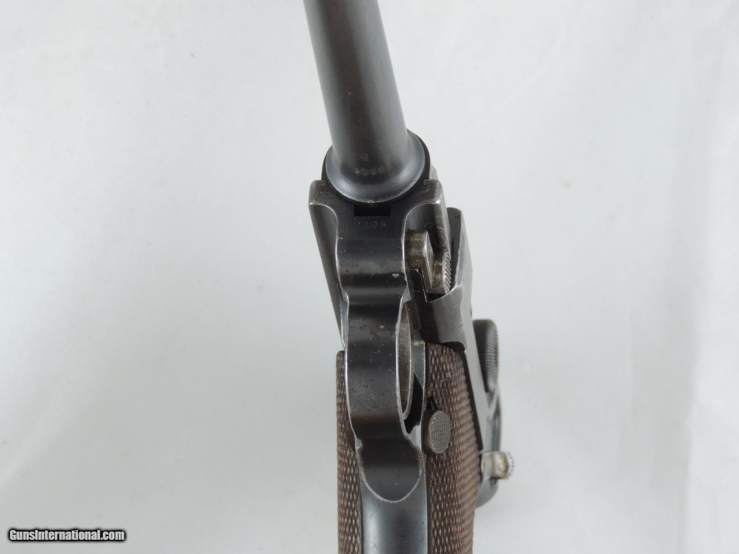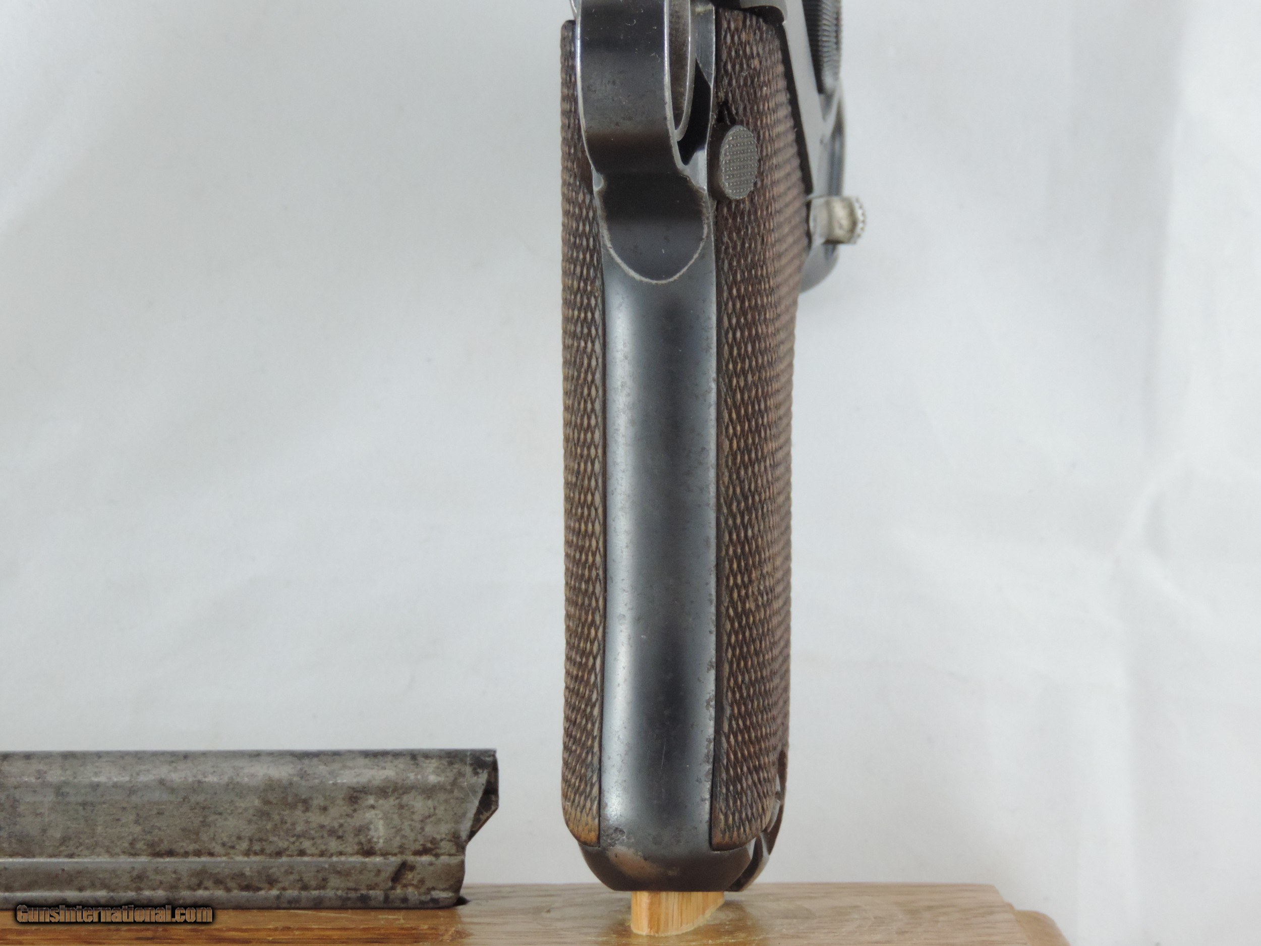 Description: Inv. 7675 DWM NAVY P-08, Cal. .9mm, Ser. 2195, Dated 1916. Outstanding in every way. The gun retains about 95+% of the original factory finish. The little loss there is, is from holster wear, the usual side plate wear and some light scattered pin pricks. The frame is stamped Crown, Crown/M, Crown/M. The barrel is marked Crown/M. ALL NUMBERS MATCH INCLUDING THE CORRECT 3 RING WOODEN BASE MAGAZINE PROPERLY STAMPED CROWN/M. The strawed parts have age faded to about 45%. The safety does show some slight surface pinpricks. The grip straps have not started to gray. The walnut grips are pristine. Not even a flattened point. The bore is bright with well defined rifling and some light scattered frost. The front sight and side plate are stamped 1916 matching the receiver. It comes with one matching magazine as described above. For the very critical investor/collector it would be very difficult to find a better example anywhere near this price would be very difficult....Shipped... $4295.*** ***And it comes with our "Purchase Satisfaction Guarantee". To purchase this firearm or if you want to request more information contact us at: Email ckguns[at]ymail[dot]com Phone 201-512-0002 Cell 201-575-6838 FAX 201-215-4759 We accept most major credit cards. Prices shown are Discounted 3% for Cash or Check. The buyer must be familiar with all the laws governing the purchase and the ownership of firearms in their own city and state. The Yankee Armorer, Inc is not responsible for any failure to comply with or observe these laws. The Yankee Armorer, Inc will only ship after full payment and receipt of all required documents. Shipping: Add $35.00 for handguns, $45.00 for long guns. New Jersey buyers are subject to a 7% sales tax. The Yankee Armorer, Inc offers a 3 day inspection period with full refund upon return of intact firearm and in the original condition. The Yankee Armorer, Inc offers a no interest lay away program - 25% down; 25% in 30 days; 25% in 60 days; and full payment in 90 days. Any violation of this policy is subject to restocking and forfeiture of all payments. Any variation from this policy must be agreed to in advance. Unshipped Cancelled sales are subject to a 20% restocking fee. Be advised that all firearms sold by The Yankee Armorer, Inc. or the Gun Exchange, LLC (SELLER) are sold as collector’s items. They have not been fired or tested for safety and must be examined by a license gunsmith prior to use. By purchasing any item from the (SELLER), you are agreeing to hold the (SELLER) free from any damages or lawsuits of any nature. Any item left for transfer or storage will be charged to $25.00 per month, per item from the day of its receipt. Any variation from this policy must be agreed to in advance. Store hours 10:00 am to 5:00 pm Tuesday -Saturday. It's always best to call for appointment. Store 201-512-0002, cell 201-575-6838. SOLD Curio/Relic: Yes Manufacturer: DWM Model: 1914 Navy Military Serial Number: 2195 Caliber Info: 9mm Condition: 95% |